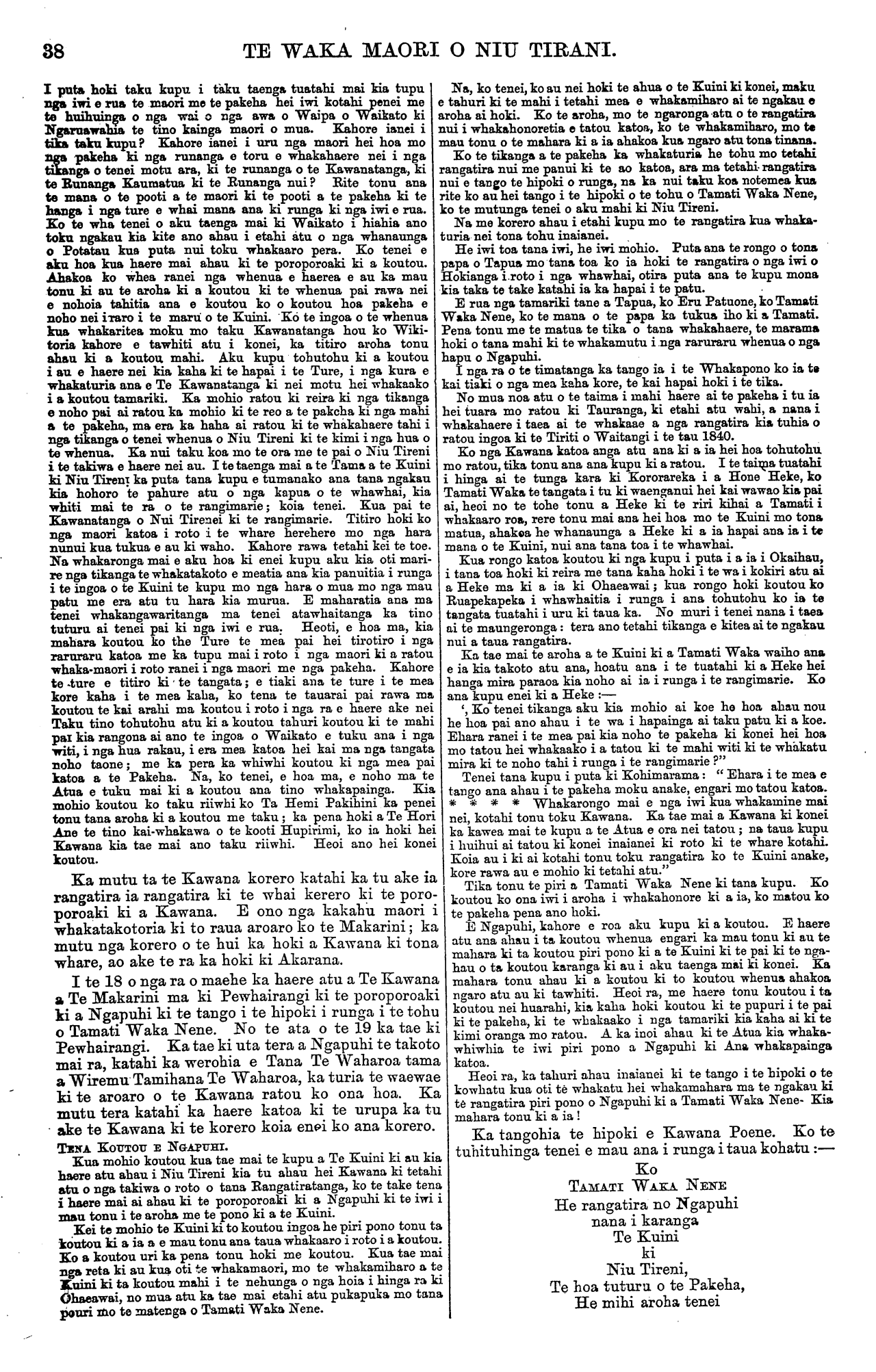 TE WAKA MAORI O NIU TIRANI. 37 te moni mana, na reira e kore e waiho te taonga tangata i aia takota ai; a e whai tonu ana ia ki to te tangata taonga kia riro noa mana : a na te wehi kei he i te whakawa koia te tahae ai, otiia, he nuka he hianga nga take e aru ai tenei tangata kia riro ai i aia o te tangata taonga mona. Mo enei tu tangata he kino mo ratou te moni; he hiahia nui no ratou kia whiwhi ai ratou i te moni na konei ka whakapaua katoatia ana whakaaro ki reira, a kahore he mahara atawhai ki o ratou tamariki, ki nga huanga ranei: kahore ano hoki he whakaaro hapai i te rongo o te whenua o ona matua. Kahore he kai mahi o ratou a mate noa, otiia he hikaka tonu, koia i kinongia ai e te tokomaha a tena e mate, kahore a te tangata whakaaro ki a ia, ko te mahara ki aia he penei, e he tangata kino he tangata apo. He tini noa atu nga take e kinoa i te moni. Na ko tenei me whai e tatou ki nga take e meinga ai he pai te moni. I mea matou, he tika kia mahi te tangata kia whiwhi ai ia i te moni. Kahore matou e penei me mahi te tangata i te moni kia hanga kinotia, kahore, otira kia whai mea ai hei tohu i te tinana, kia noho hari ai ratou ko ana hunga. Kia mahi te tangata mo nga mea hei o mo enei ra, a mo te roanga o nga ra o nga tau, hei kai ma ana kaumatua ana pa ranei te turoro, te aha ranei ki aia. A me mahi ano hoki ia kia whai kai ai ana tamariki me tana wahine. Mo te mate rawa ake ona ; kua whai mea hei waihotanga iho mo ana tamariki me tana wahine. Ki te mea kua maumaua noatia nga moni a te tangata, tena e tata ki te mate, ko reira te pouri ai tana ngakau, notemea kahore he moni hei waihota- nga mo ana tamariki, a ka pouri ano hoki notemea ka noho tutua kaikore ratou. Tetahi mea e pouri ai ano te tangata ka haere ka kaumatuatia ka pouri ia mo nga moni i maumaua noatia e ia i te takiwa o ana tau. E ma.tau ana te Pakeha ki tenei, na reira ka nui te utu o ana witi, aha ranei i te tau, ka waiho paitia e ratou, mo te, kahore rawa ake he utu o ana kai o etahi tau, ahakoa, ko nga utu kua kohia nei eia. Na enei korero pea ka kite o matou hoa maori i te mea e meinga ai he pai te moni inahoki ka whaka- haerea paitia ma reira e ora ai te tangata i te kai; a e koa ai te ngakau o ana tamariki. A e kore ai ia e pouri ki ana mate turoro, ana kaumatua, aua tata ano ia ki te mate ka pai ano, notemea kua whai waihotanga mo ana tamariki me tana wahine. Ko matou ra tena e mea ana, kia whai moni o matou hoa Maori waihoki kia matau ki te ngaki whenua, a ki te whiwhi ratou i te moni kia matau ki te whakahaere tika i aua moni. Ki te mea ka penei ratou, ka kite ratou i te tikanga o tenei ki, he pai kei roto kei te moni. KO TE HAERENGA. A TE MAKARINI RAUA KO KAWANA POENE KI RARO. TERA pea nga hoa maori kei te hiahia kia rongo i nga korero o te haerenga a Te Makarini ki raro ki te tuku atu i a Kawana Poene ki tona kainga hou i tawahi, koia i taia ai ki konei etahi o nga korero o taua haere. I te tekau ma tahi o nga ra o maehe 1873 ka tae atu a Te Kawana ratou ko Te Makarini ma ki Ngaruawahia, Waikato; i te tekau ma rua ka tu te hui maori hei poroporoaki ki a ia. E ono rau pea nga maori i rupeke mai ki Ngaruawahia ko nga iwi i tae ki reira ko Ngatitamaru, ko Ngatihaua, ko Ngatikoroki, ko Ngatimahanga, Ngatinaho,, Ngati- ngaungau, Ngatiraukawa, Ngatihikairo, Ngatitewehi, Tainui, Ngatimahuta, Ngatiapa, Ngatitahinga, Nga- timaniapoto, Ngatiapakura, Ngatihinetu. Ka tae ki te rua o nga haora ka haere atu te Kawana ki te taha o te urupa, katahi ka tuwaewae nga iwi ra, ka mutu ka tu ake a Anaru Patene ki te panui i te pukapuka poroporoaki ki te Kawana koia tenei. He pukapuka poroporoaki tenei na matou ki a koe e pa e te Kawana. Haere mai ra e to matou matua aroha e te Kawana kia kite i nga rangatira, me nga iwi o Waikato i mua o to haerenga atu ki te wahi i whakaritea ai koe e to tatou Kuini Atawhai. E tino pouri ana matou mo tou haerangi atu. A e kore ano hoki matou e wareware ki tau kupu, i tou taenga tuatahi mai ki Waikato nei, i te marama o Mei o te tau 1868. I mea koe ko nga hara a te Maori raua ko te Pakeha me tanu ki te urupa o Potatau. Ahakoa, he tini nga raruraru, me nga kino i mahia ki Waikato nei kihai tou ngakau i ohorere, manawanui tonu koe, kihai koe i takahi i tau kupu. I tino marama ano hoki au whakahaere i nga ra i Kawana ai koe ki tenei motu. Kahore i whakatupuria tetahi kino e koe. Engari ko nga he i whakatu- puria e era atu Kawana o mua atu i a koe. I tino kaha koe, me tou Kawanatanga ki te peehi i ana raruraru. Haere marama atu koe ki te wahi i whakaritea ai mou e to tatou Kuini atawhai A e tino inoi ana matou ki te Atua kia arahina paitia atu koe me tou hoa me Reira Poene, me to whanau ki te wahi e noho ai koe. HEOI ANO. NA WI PATENE. HETA TARAWHITI. Na nga Iwi Katoa. Ka mutu tera ka tu ake ano tetahi o nga ranga- tira o Ngatinaho ki te panui i ta ratou pukapuka koia tenei. E taku hoa e te Kawana. Tena koe. Haere mai ki Waikato i mua o tau haerenga atu kia kite koe i enei iwi ou me ou hoa rangatira e noho nei o tenei wahanga o te iwi nui tonu o Waikato iwi nui iwi rangatira i runga i tenei motu, he tika ano to ratou mate i runga i te tutu, otira e nui ana ki te tutu e nui ana ki te ata noho tae noa mai ki tenei ra, e noho tahi nei ma- tou ko o matou hoa pakeha me o ratou rangatira, he tuakana he teina i roto i tenei awa i Waikato tae noa ki tou taenga manuhiritanga mai kia kite i a ratou, ki te mihi hoki ki te urupa o tou hoa o to matou tino kaumatua a te Wherowhero e takoto nei i tona urupa ki Ngaruawahia, i puta ai tau kupu nui whai mana mo nga kino o te Maori raua ko te pakeha kia tanumia ki roto i te urupa o taua kaumatua o te Whero- whero, rite rawa mana rawa tau kupu taea noatia tenei ra. Ko ahau ko tona uri me enei rangatira e pupuni nei i ana kupu ia ia ano i to ora ahakoa i takahia e era uri ona ko au ano kei te pupuri taea noatia tenei ra. Kei mea to whakaaro ko au anake te iwi kino i te motu nei kahore, na nga iwi katoa o te motu nei tenei tikanga i homai hei mate ki toku iwi ki toku whenua