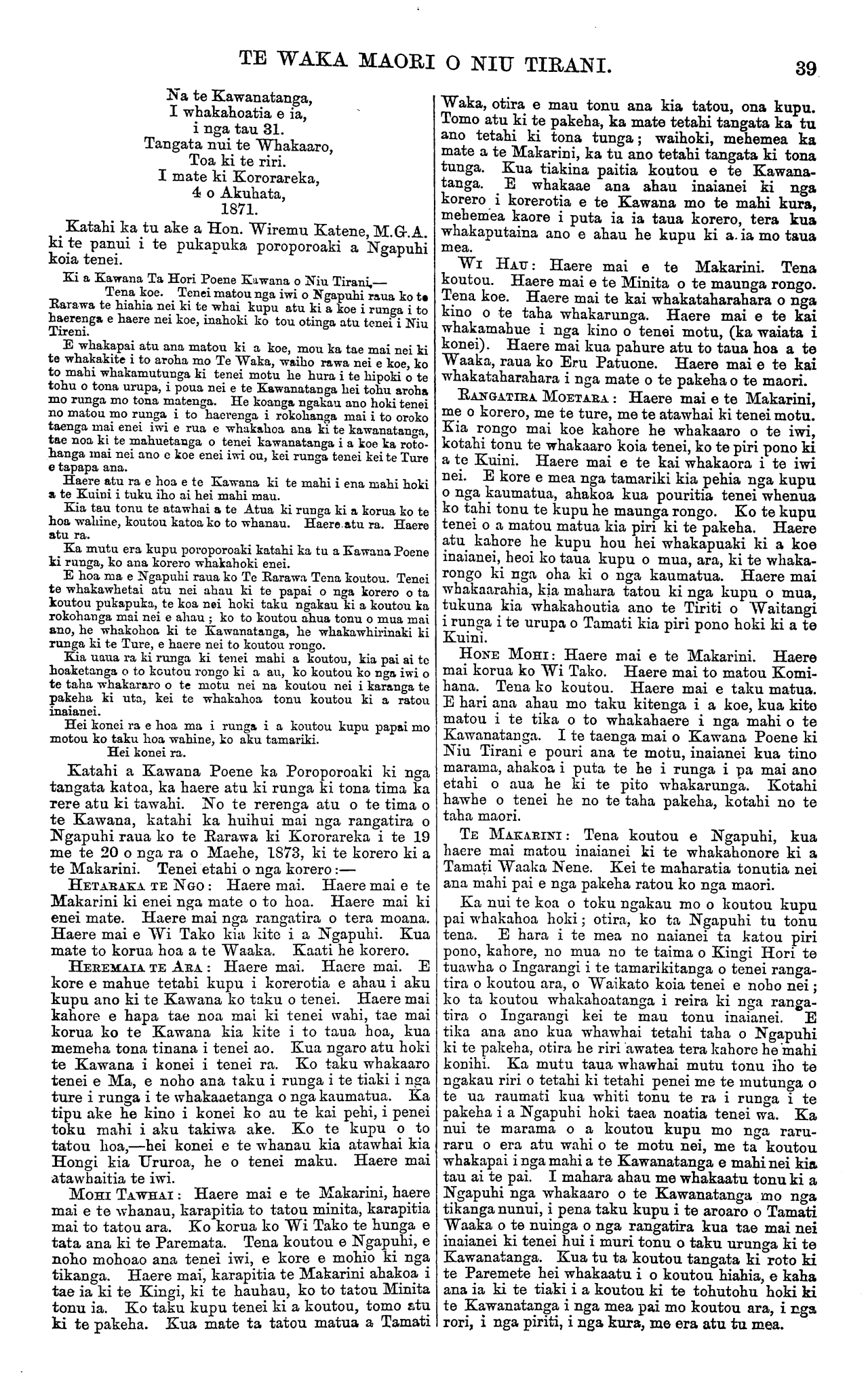 TE WAKA MAORI O NIU TIRANI. 41 rakau, ka kiia e Maniapoto mana e whakau. I te wahi I e matutu ana te turoro ka taea pea te whakaaro tena, inaianei kua takoto te tupapaku e kore e taea te I whakaora. WI PIRIHONA: Haere mai e te Makarini. Haere mai e Wi Tako. Haere mai nga tangata o te Pare- mete, nga kai whiriwhiri i nga mate o to tatou nei motu, no mua mai ano te hara. Tenei aku kupu whakahoki mo Paora ; i haere ano matou kia kite i taua turoro, otira kahore i ora. A, e taea te aha I inaianei ? Ko koe e Paora i whakaaro me whai tikanga matou mo tenei mea, i ki koe ma matou e rapu i tetahi tikanga hei whakaoti i tenei raruraru. Kua whakamatauria nuitia e matau otira kahore i puta he pai. Ahakoa tae atu ano a te Makarini kahore kau he tikanga; mehemea i whakaaetia to matou kupu kua oti noa atu. E mate ana te tangata a riro ana te whenua. Tena i a matou i te reo tua- tahi ka mau te rongo, a whakaaetia tonutia. Ki taku whakaaro ko nga tangata na Tatou i timata te riri ma ratou tonu te kupu tuatahi ki te karanga i te kupu o te maunga rongo. WI TE TEETE: Tena koe e te Makarini, haere mai kia kite i to iwi i a Ngapuhi, haere mai nga rangatira o tera pito, o waenganui, haere mai ki te whakarongo i nga kupu o Ngapuhi, whakarongo ki tenei kupu, i hara ano a Ngapuhi i mua, ko taua rakau te take, ko nga tangata katoa i wa ki taua whawhai i kite i te mate; e kore e taea e au te whakaaro i te kupu a Paora. Waiho te tika ki nga iwi e noho na koe—ko to iwi he pakeha. He mea hou te ture o naianei kia matou, e mau tonu ana kia matou nga ohaki o o matou tupuna, ko o ratou hoa korero hoki i mua he Kingi. Ko au te hoa o te Waaka i tona haerenga ki Kohimarama, ki atu maua ki a ratou ki a turakina te rakau, ki mai ana Tatou e kore e whakarerea, whakamaharatia hoki e maua te Tiriti o Waitangi ki a ratou. E Ma he kupu tenei ki a koe homai he moni hei hanga i nga rori o Ngapuhi. Mehemea i pai nga huarahi i tenei taima kua nui atu nga tangata i enei kua tae mai ki tenei huihuinga. HIRINI TAIWHANGA : E kore au e whai kupu i runga i nga korero kua korerotia nei. E whakawhetai atu ana ahau ki a koe mo o kupu, kua whakakotahitia nga iwi e rua. Mehemea ka pa te mate ki tetahi wahi o te tinana, ka rapu te tangata i tetahi rongoa hei whakaora. Ko te kupu a te Makarini me tohe, ko ta Wi Tako he ripeneta. Ki te kore taea enei me waiho ma te matauranga. HON. WI KATENE : Haere mai e te Makarini me o hoa. I taku hokinga mai i Poneke ka noho au ki te whakapuaki i nga tikanga o te Kawanatanga, me nga korero o te Paremete ki a Ngapuhi. E hara toku urunga ki roto ki te Paremete mo taku takiwa ake, erangi i UTU au hei whakahaere i nga tikanga mo te motu katoa. I te taenga o Kawana Poene raua ko te Makarini ki te Waimate ka puta taku kupu ki a te Kawana kia wetekia te here i taku hope. Ka ki mai ia ki au, " ahakoa kawana au, kei raro au i te ture, ko te ture kei runga i au." He minita au inaianei na te kawanatanga, he mangai o te katoa haunga o taku takiwa ake. Kei ki koutou e penei ana aku korero no te mea e tu ana au i te taha o te Makarini, kahore, noku ake enei whakaaro e whakapuakina nei e au. Kahore ahau i tino kite i te pai o tenei kawanatanga i tera tau, engari kua kite au i te tika o to Tatou wha- kahaere inaianei, a no reira i kaha ai ahau ki te wha- kahoa i a Tatou. E whakaae ana ahau ki tenei kupu mo te murunga hara, kahore ahau e mea mo taku takiwa anake te murunga hara, erangi mo te motu katoa, ara, ko nga kai kohuru i a Manukau kia murua to ratou hara. No te mea i korero ano maua ko Kawana Poene i Poneke mo taua mea, ki ana au kia te Kawana, ko taku hiahia kia murua aua hara katoa. Engari ehara i te mea naku anake taua kupu mo te murunga hara. I whakaputa ano nga tangata katoa i Toto i te Paremete i taua kupu. I tae mai ki au te pukapuka a te Morenga mo te pakeha i kohurutia i Ahipara, kia whakaputa ahau i taku mana mo te maori nana i kohuru, ara kia whakaputaina mai ia i roto i te whare herehere. Ko taku kupu ki a koutou katoa, e kore ahau e pokanoa ki te whai kupu mo te tikanga penei, inahoki na to Kooti Hupirimi i whakawa, i kite i tona hara. Mehe- mea ka pokanoa ahau ki te mea pena, he whakanoa tena naku i te mana o te ture. Kahore i au te mana. I tuhi mai hoki a Hare Nepia mo tenei mea. Mehe- mea e noho ana taua tangata i waho o te mana o te ture, hei reira pea te taea ai e ahau te whakaputa i tetahi ritenga mona. APERAHAMA TAONUI: Ka kiia nei ka houhia te rongo ki Waikato, me tuku i te whenua. Ki te whakaaetia e te Makarini, ka honoa nga rohe o te whenua. TE MAKARINI : E kore e taea tena whakaaro, e kore rawa nga whenua e whakahokia, otira, mehemea ka tonoa e Tatou tetahi wahi hei oranga ma ratou, hei reira pea tetahi wahi iti te hoatu ai. Tena ko te whakahokinga i Waikato e kore tena e taea. MANGONUI: Haere mai e te Makarini, Haere mai me o hoa. Kua mate a te Waaka. Haere mai ki Peiwhairangi tangata kore. Haere mai e Wi Tako, nau ano tenei tunga waewae. Kahore he tangata hei karanga ki a koe i te kaha o te paringa o te tai. I haere take kore mai koe inahoki kua mana te ture. IHAKA TE TAI : Tena ko koutou haere mai kia kite i te iwi kua warewaretia nei pea e koe. E miharo ana ahau no te mea i roto i nga tau e 40 e tu nei he Kawana mo tenei motu mo Niu Tirani, ka rima anake ano pea o ratou taenga mai kia kite i a matou. Me koe ano hoki pea ka toru, ka wha, o taenga mai ki konei. Ka mutu nga korero i konei mo taua ra. TAETE MAEHE 20, 1873. HORI HARETI: Katahi au ka hamumu ki taku matua i runga i taku pani. Kei te mahara tonu au ki nga kupu a te Waaka, i korerotia e ia ki au. Kia pena to atawhai kia au me taku matua me Patuone. Ko nga mea nunui me waiho ma te iwi—he pani ahau. PIRIHONGO : Whakaturia e koe tetahi tangata i to matou takiwa hei whakaputa raihana hoko paura kia matou. Tenei maku e whakaatu kia koe i tetahi tangata pai mo tena mahi. TE MAKARINI : Kua oti i au te korero ki a Wi Katene mo taua tikanga. HONE MOHI : E tautoko ana ahau i te kupu a Hori. Kua mate a Waaka, kia atawhai koe i a matou kua ma