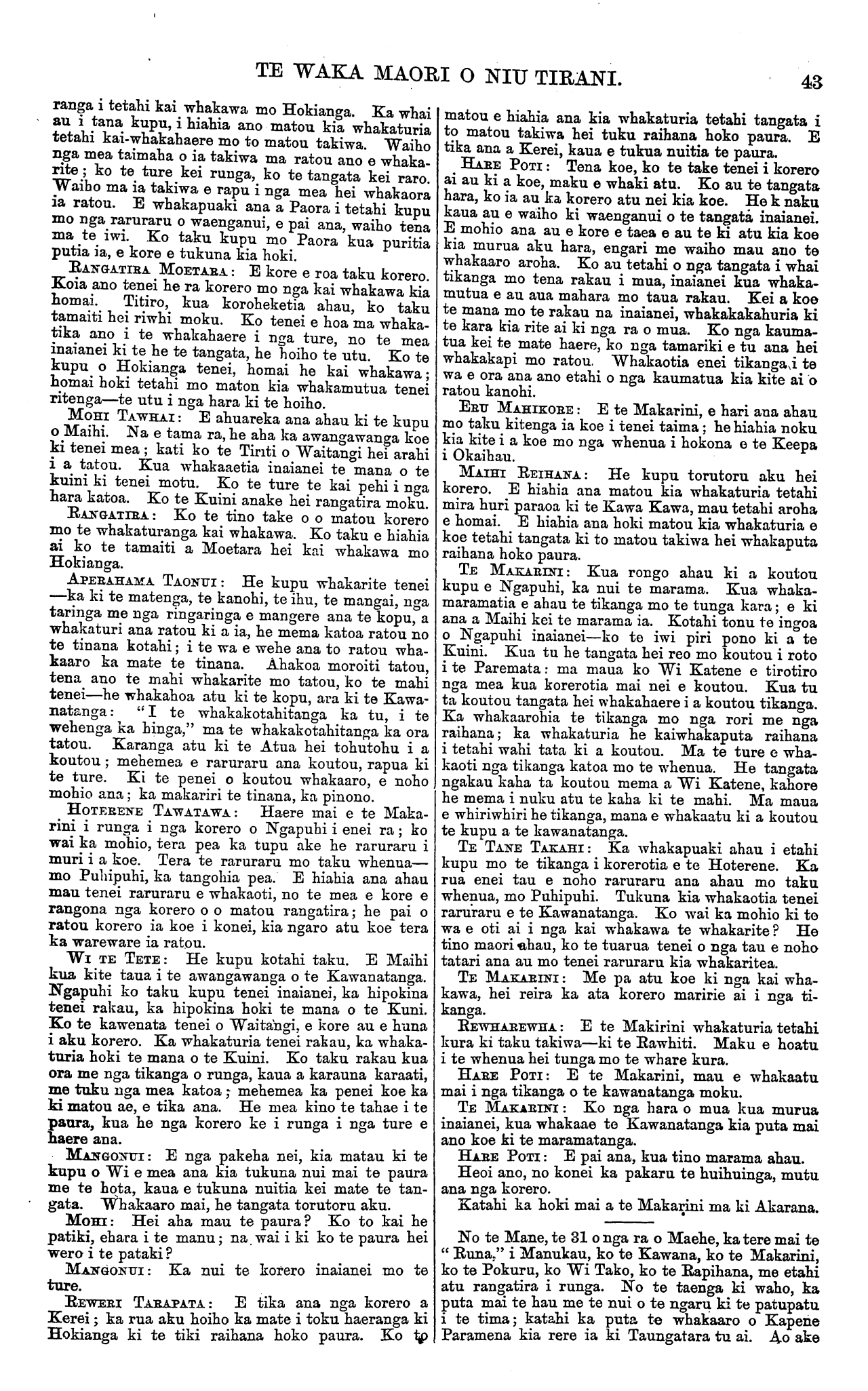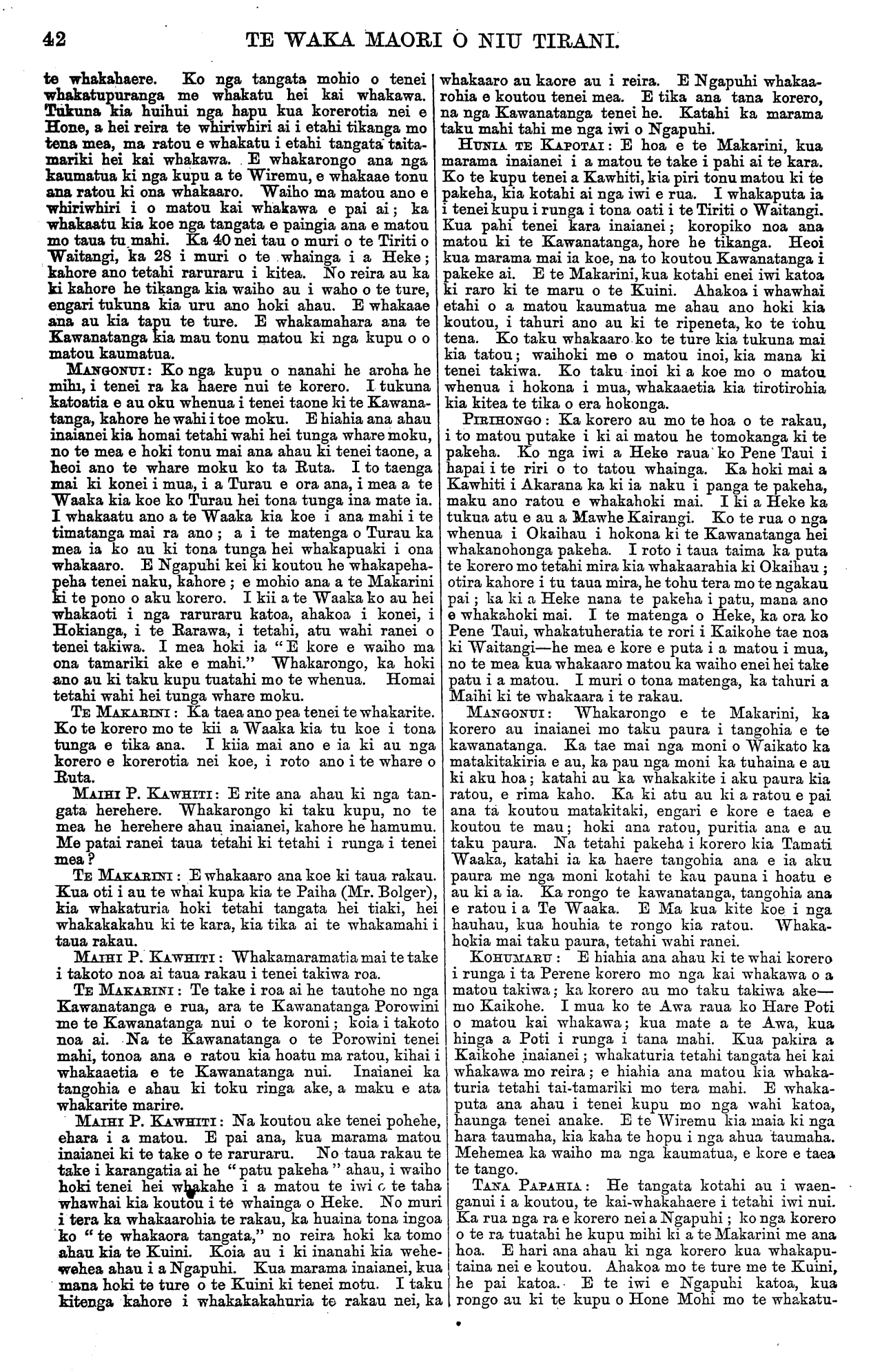 TE WAKA MAORI O NIU TIRANI. ranga i tetahi kai whakawa mo Hokianga. Ka whai au i tana kupu, i hiahia ano matou kia whakaturia tetahi kai-whakahaere mo to matou takiwa. Waiho nga mea taimaha o ia takiwa ma ratou ano e whaka- rite ; ko te tare kei runga, ko te tangata kei raro. Waiho ma ia takiwa e rapu i nga mea hei whakaora ia ratou. E whakapuaki ana a Paora i tetahi kupu mo nga raruraru o waenganui, e pai ana, waiho tena ma te iwi. Ko taku kupu mo Paora kua puritia putia ia, e kore e tukuna kia hoki. RANGATIRA MOETARA: : E kore e roa taku korero. Koia ano tenei he ra korero mo nga kai whakawa kia homai. Titiro, kua koroheketia ahau, ko taku tamaiti hei riwhi moku. Ko tenei e hoa ma whaka- tika ano i te whakahaere i nga ture, no te mea inaianei ki te he te tangata, he hoiho te utu. Ko te kupu o Hokianga tenei, homai he kai whakawa; homai hoki tetahi mo ratou kia whakamutua tenei ritenga—te utu i nga hara ki te hoiho. MOHI TAWHAI : E ahuareka ana ahau ki te kupu o Maihi. Na e tama ra, he aha ka awangawanga koe ki tenei mea ; kati ko te Tiriti o Waitangi hei arahi i a tatou. Kua whakaaetia inaianei te mana o te kuini ki tenei motu. Ko te ture te kai pehi i nga hara katoa. Ko te Kuini anake hei rangatira moku. RANGATIRA.: Ko te tino take o o matou korero mo te whakaturanga kai whakawa. Ko taku e hiahia ai ko te tamaiti a Moetara hei kai whakawa mo Hokianga. APERAHAMA TAONUI: He kupu whakarite tenei —ka ki te matenga, te kanohi, te ihu, te mangai, nga taringa me nga ringaringa e mangere ana te kopu, a whakaturi ana ratou ki a ia, he mema katoa ratou no te tinana kotahi; i te wa e wehe ana to ratou wha- kaaro ka mate te tinana. Ahakoa moroiti tatou, tena ano te mahi whakarite mo tatou, ko te mahi tenei—he whakahoa atu ki te kopu, ara ki te Kawa- natanga : " I te whakakotahitanga ka tu, i te wehenga ka hinga," ma te whakakotahitanga ka ora tatou. Karanga atu ki te Atua hei tohutohu i a koutou; mehemea e raruraru ana koutou, rapua ki te ture. Ki te penei o koutou whakaaro, e noho mohio ana; ka makariri te tinana, ka pinono. HOTERENE TAWATAWA: Haere mai e te Maka- rini i runga i nga korero o Ngapuhi i enei ra; ko wai ka mohio, tera pea ka tupu ake he raruraru i muri i a koe. Tera te raruraru mo taku whenua— mo Puhipuhi, ka tangohia pea. E hiahia ana ahau mau tenei raruraru e whakaoti, no te mea e kore e rangona nga korero o o matou rangatira; he pai o ratou korero ia koe i konei, kia ngaro atu koe tera ka wareware ia ratou. WI TE TETE: He kupu kotahi taku. E Maihi kua kite taua i te awangawanga o te Kawanatanga. Ngapuhi ko taku kupu tenei inaianei, ka hipokina tenei rakau, ka hipokina hoki te mana o te Kuini. Ko te kawenata tenei o Waitangi, e kore au e huna i aku korero. Ka whakaturia tenei rakau, ka whaka- turia hoki te mana o te Kuini. Ko taku rakau kua ora me nga tikanga o runga, kaua a karauna karaati, me tuku nga mea katoa; mehemea ka penei koe ka ki matou ae, e tika ana. He mea kino te tahae i te panra, kua he nga korero ke i runga i nga ture e haere ana. MANGONUI: E nga pakeha nei, kia matau ki te kupu o Wi e mea ana kia tukuna nui mai te paura me te hota, kaua e tukuna nuitia kei mate te tan- gata. Whakaaro mai, he tangata torutoru aku. MOHI: Hei aha mau te paura? Ko to kai he patiki, ehara i te manu; na.wai i ki ko te paura hei wero i te pataki ? MANGONUI: Ka nui te korero inaianei mo te ture. REWERI TARAPATA: E tika ana nga korero a Kerei; ka rua aku hoiho ka mate i toku haeranga ki Hokianga ki te tiki raihana hoko paura. Ko to matou e hiahia ana kia whakaturia tetahi tangata i to matou takiwa hei tuku raihana hoko paura. E tika ana a Kerei, kaua e tukua nuitia te paura. HARE POTI : Tena koe, ko te take tenei i korero ai au ki a koe, maku e whaki atu. Ko au te tangata hara, ko ia au ka korero atu nei kia koe. He k naku kaua au e waiho ki waenganui o te tangata inaianei. E mohio ana au e kore e taea e au te ki atu kia koe kia murua aku hara, engari me waiho mau ano te whakaaro aroha. Ko au tetahi o nga tangata i whai tikanga mo tena rakau i mua, inaianei kua whaka- mutua e au aua mahara mo taua rakau. Kei a koe te mana mo te rakau na inaianei, whakakakahuria ki te kara kia rite ai ki nga ra o mua. Ko nga kauma- tua kei te mate haere, ko nga tamariki e tu ana hei whakakapi mo ratou, Whakaotia enei tikanga i te wa e ora ana ano etahi o nga kaumatua kia kite ai o ratou kanohi. ERU MAHIKORE : E te Makarini, e hari ana ahau mo taku kitenga ia koe i tenei taima; he hiahia noku kia kite i a koe mo nga whenua i hokona o te Keepa i Okaihau. MAIHI REIHANA: He kupu torutoru aku hei korero. E hiahia ana matou kia whakaturia tetahi mira huri paraoa ki te Kawa Kawa, mau tetahi aroha e homai. E hiahia ana hoki matou kia whakaturia e koe tetahi tangata ki to matou takiwa hei whakaputa raihana hoko paura. TE MAKARINI: Kua rongo ahau ki a koutou kupu e Ngapuhi, ka nui te marama. Kua whaka- maramatia e ahau te tikanga mo te tunga kara; e ki ana a Maihi kei te marama ia. Kotahi tonu te ingoa o Ngapuhi inaianei—ko te iwi piri pono ki a te Kuini. Kua tu he tangata hei reo mo koutou i roto i te Paremata: ma maua ko Wi Katene e tirotiro nga mea kua korerotia mai nei e koutou. Kua tu ta koutou tangata hei whakahaere i a koutou tikanga. Ka whakaarohia te tikanga mo nga rori me nga raihana; ka whakaturia he kaiwhakaputa mihana i tetahi wahi tata ki a koutou. Ma te ture e wha- kaoti nga tikanga katoa mo te whenua. He tangata ngakau kaha ta koutou mema a Wi Katene, kahore he mema i nuku atu te kaha ki te mahi. Ma maua e whiriwhiri he tikanga, mana e whakaatu ki a koutou te kupu a te kawanatanga. TE TANE TAKAHI: Ka whakapuaki ahau i etahi kupu mo te tikanga i korerotia e te Hoterene. Ka rua enei tau e noho raruraru ana ahau mo taku whenua, mo Puhipuhi. Tukuna kia whakaotia tenei raruraru e te Kawanatanga. Ko wai ka mohio ki te wa e oti ai i nga kai whakawa te whakarite ? He tino maori ahau, ko te tuarua tenei o nga tau e noho tatari ana au mo tenei raruraru kia whakaritea. TE MAKARINI : Me pa atu koe ki n