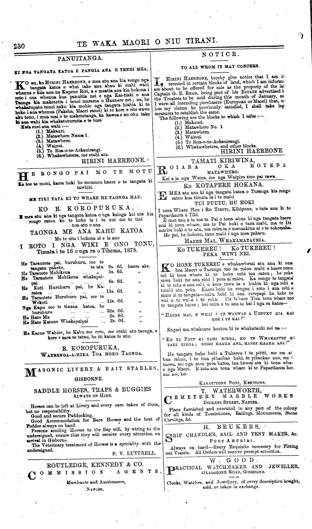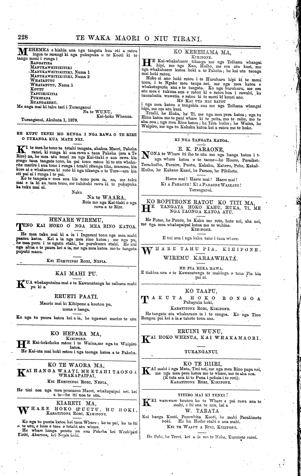 Turanganui, Akuhata 1, 1878.