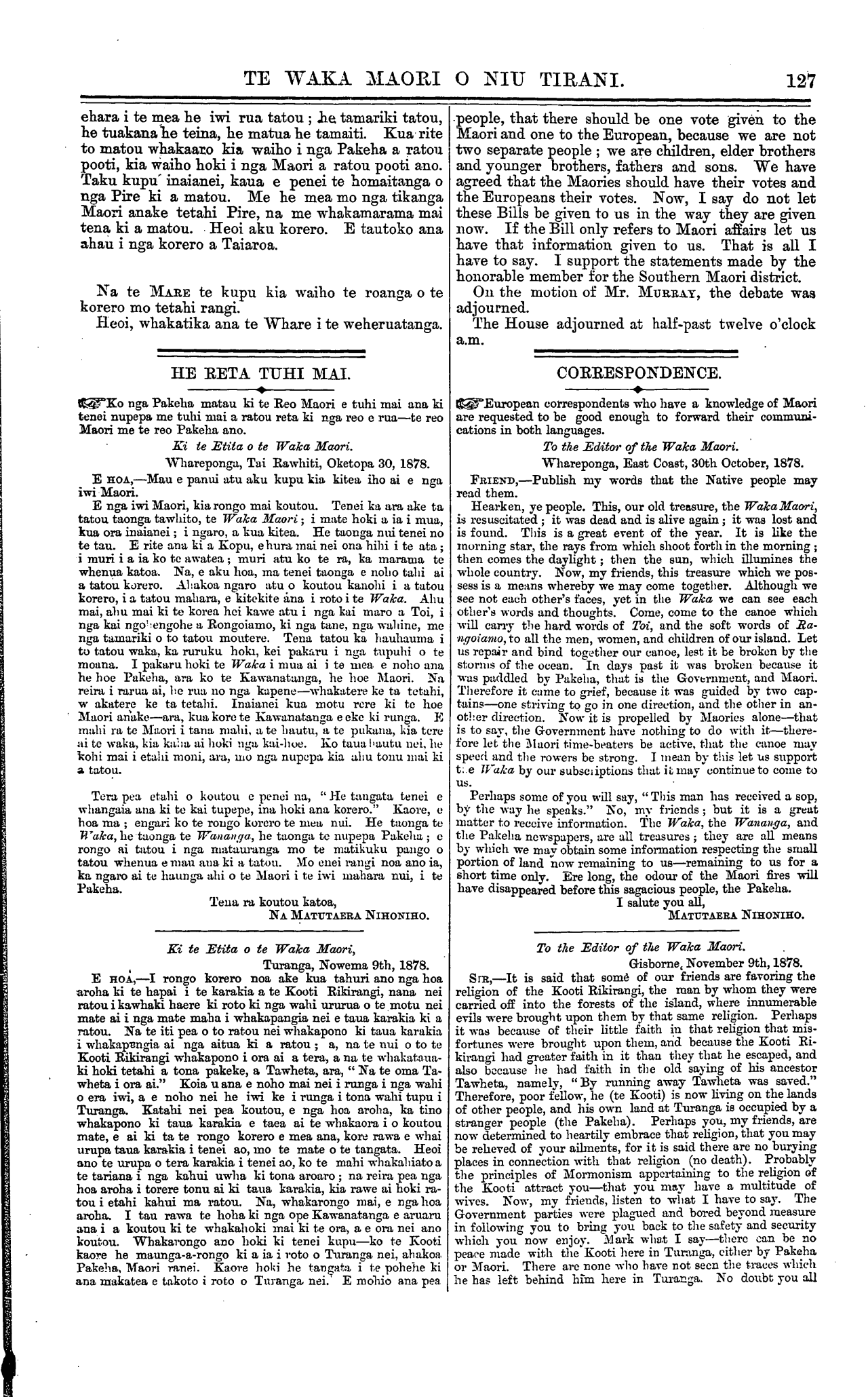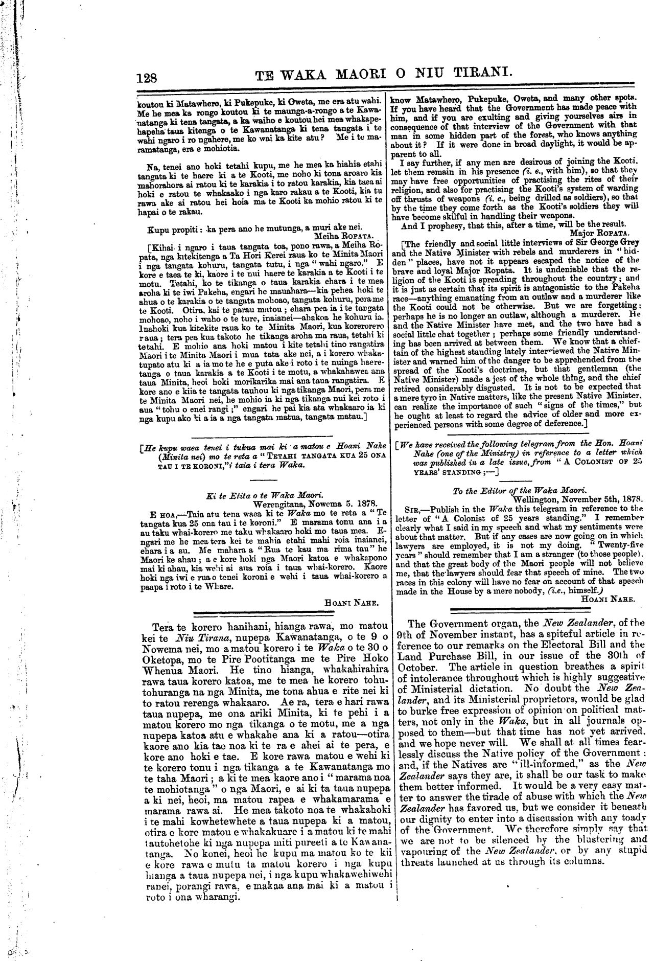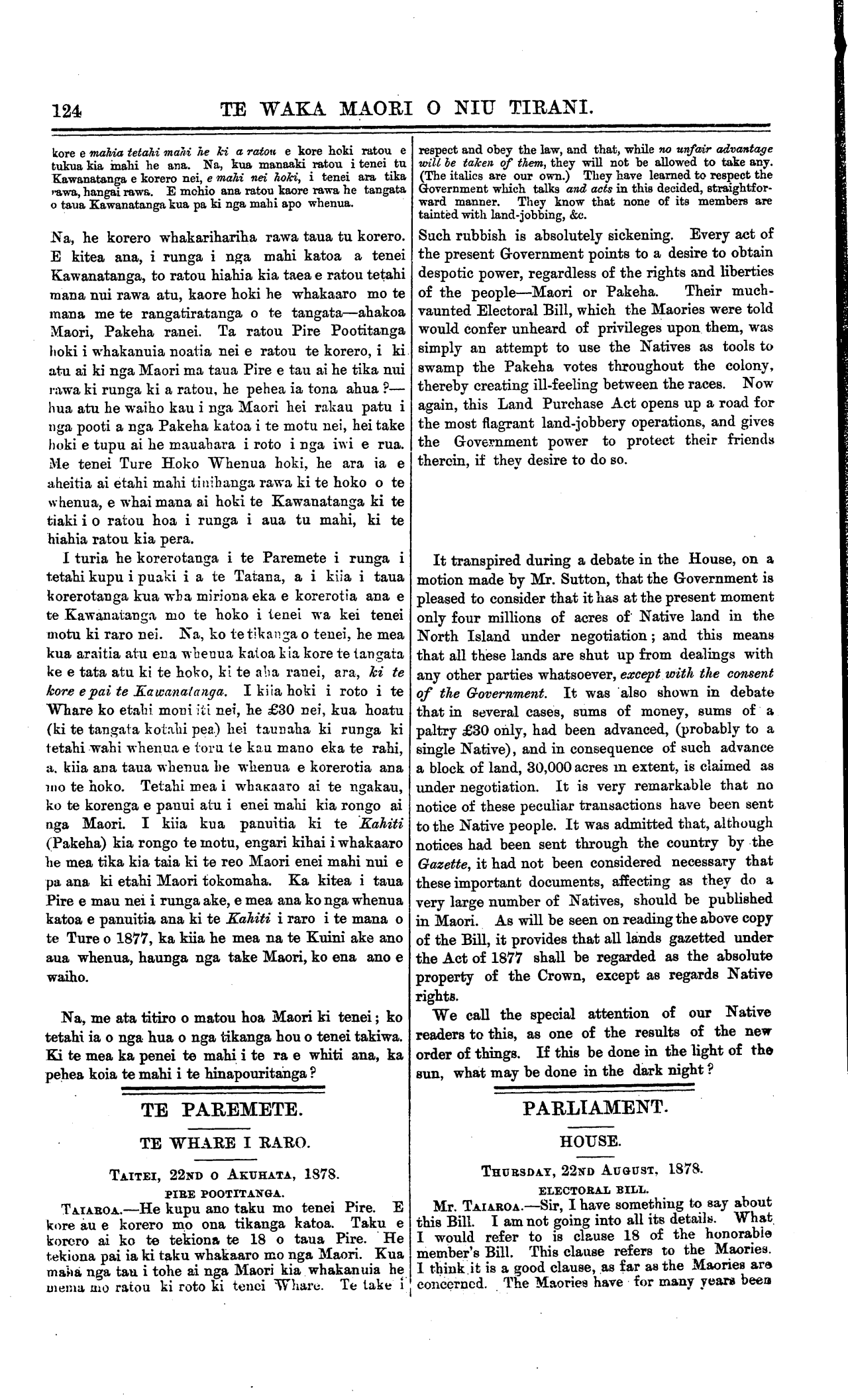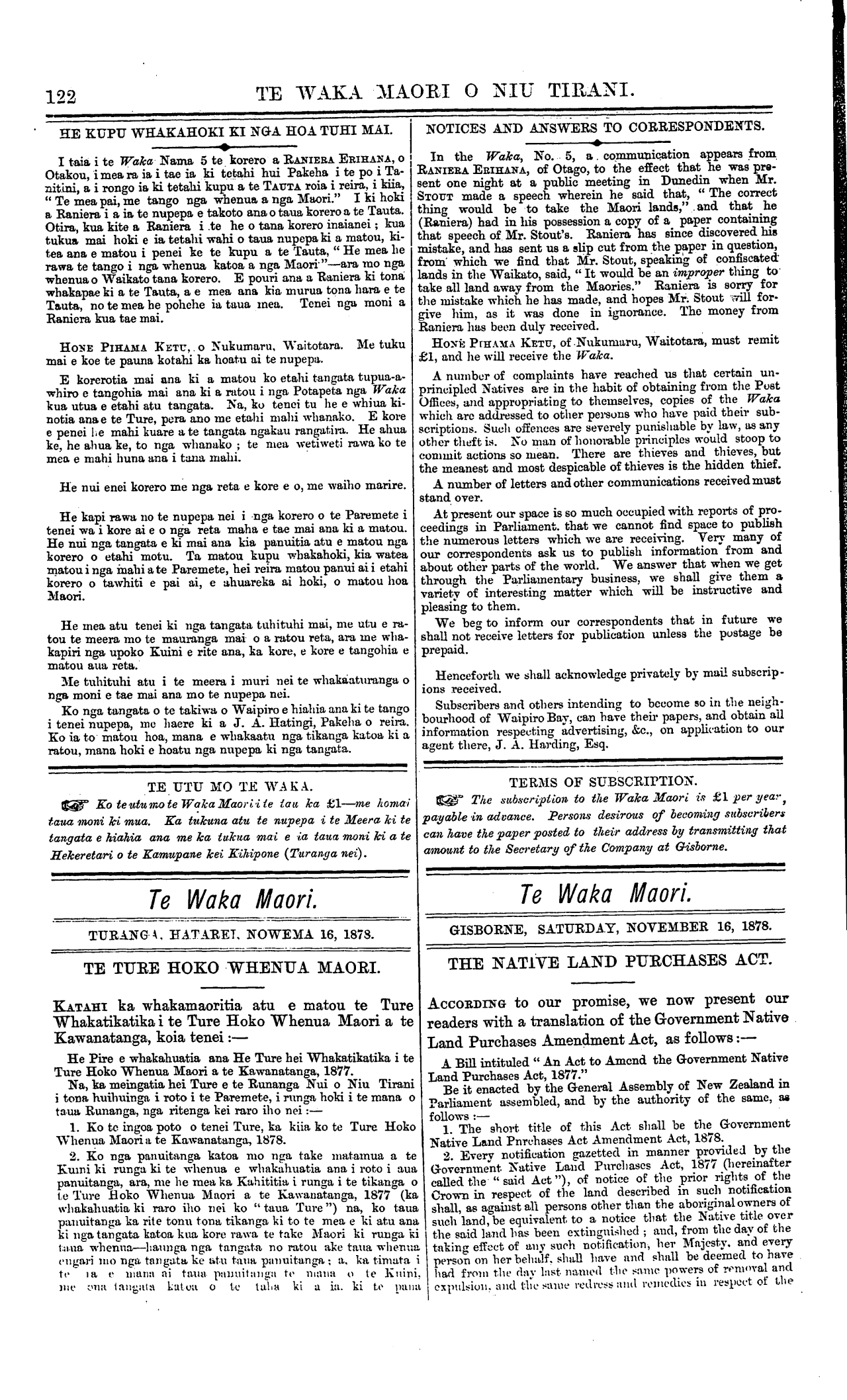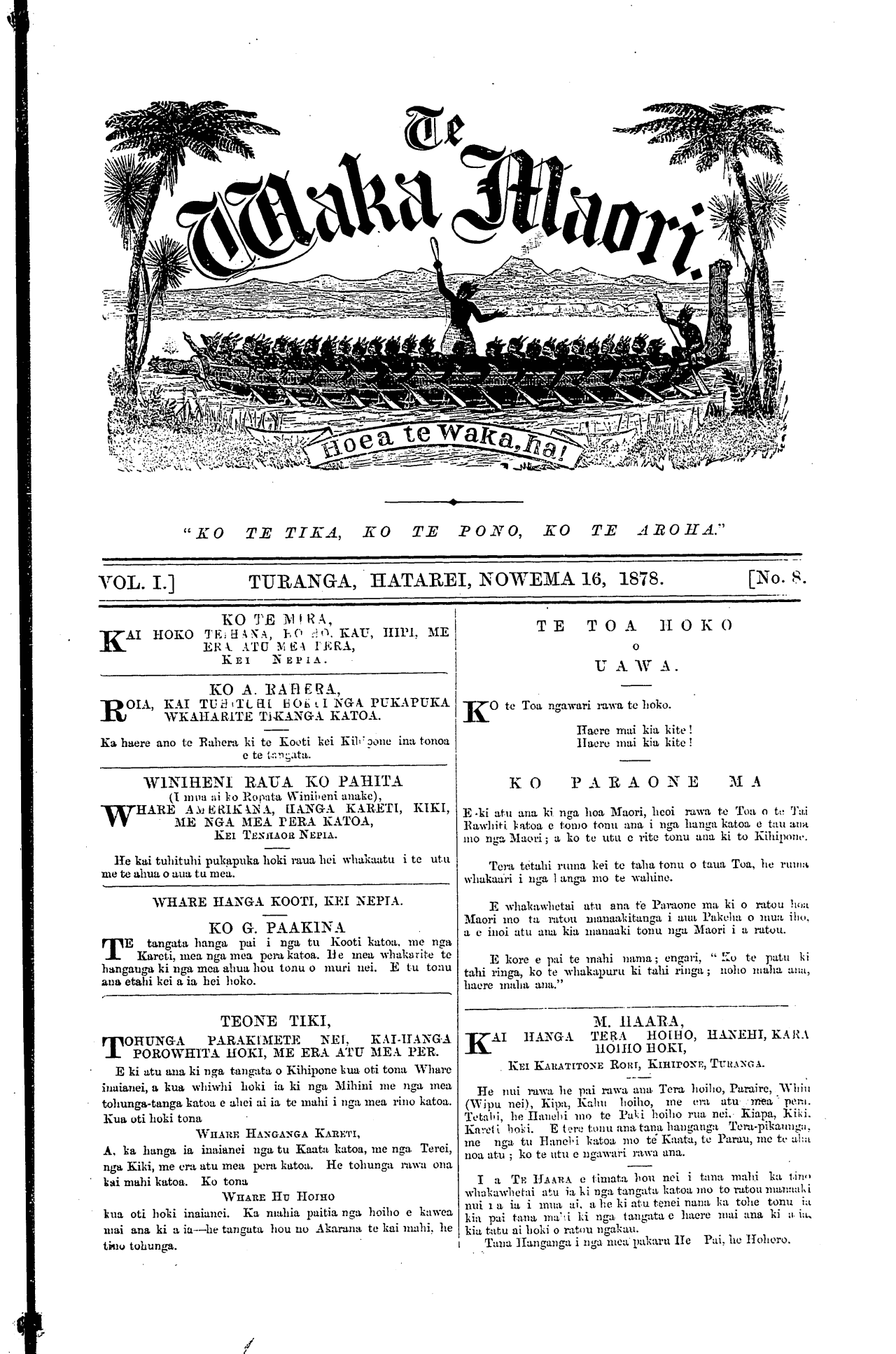Te Waka Maori o Niu Tirani 1878-1879: Volume 1, Number 8. 16 November 1878 |