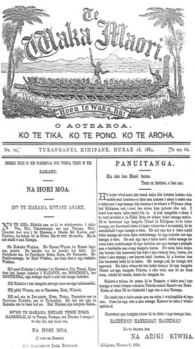 TE WAKA MAORI. Hoea te Waka, ha! O A O T E A R O A. KO TE TIKA. KO TE PONO. KO TE AROHA. NO 10 TURANGANUI, KIHIPANE, HURAE 18, 1884. Te utu 6d. HOKO NUI 0 TE TAONGA ME TONA TINI O TE KAKAHU. NA HORI MOA. MO TE MARAMA KOTAHI ANAKE. NO te mea, E hiahia ia au ki te whakawatea i taku Toa, Hei Takotoranga mo nga Taonga, Hou, Ehara mai ana i te marama o Maehe Ko Katoa aku Taonga, ka tukua ki te Hoko mo te utu iti rawa. Ko ia nei etahi o ana Taonga. He kakahu wahine, he kaone wuuru he kaone kara ma, puuru. He kareko ma he kareko hei hiiti. He Pairakete ma, he Paraikete raka, kara, he Paranene. He Peehi moenga, he kori wahine, me tona tino o nga kakahu wahine. Ko enei Kakahu i whatua i te Koroni o Niu Tireni, e nga tino kai hanga kakahu i Kaiapoi, me Rohirena, me Mohikera, nga kainga mahi o aua kai hanga kakahu. He Kakahu i ata hangaia mo nga tane menga taitamariki. He pihi Wuuru, mo te Tarutete, koti, wekoti. He nui atu te Ingarihi, koti, tuira, tarautete mo te tangata pakeke mo te tamariki. He nui ata nga tu kakahu mo te tane kei au. Kai Mahara nga tangata katoa. NO HORI MA. (I mua na Renata) KEI KARATITONE RORI, KIHIPANE. PANUITANGA. Kia aku hoa Maori katoa. Tena ra koutou, e hoa ma. He kupu whakaatu atu tenei naku kia koutou katoa kia mohio mai koutou e kite ana koutou I ahau e noho ona e hoko ma I nga taonga kia koutou i te whare e Wiremu Atea kei Kihipana nei, i enei tau etoru kua pahure ake nei. I tenei kua mutu taku mahi kia ia. A kua tangohia e ahau i te tari tawhito, o te Rihi Roia te whare hoko taonga moku Ki te haere mai nga tangata Maori ki Kihipana ki te hoko me haere mai ratou ki taku whare toa, i te tuatahi ki Matakitaki i nga taonga o roto. He nui nga tahi o taku mahi hoko taonga no reira taku mohiotanga ki nga kakahu me nga taonga o roto. He nui ki tau o taku mahi hoko taonga no reira taku mohiotanga ki nga kakahu me nga taonga e paingia ana e hiahiatia aua e nga tangata katoa. No reira taku kupu kia koutou kia haere mai kia kite aku taonga hou katoa, me hoko i aku taonga, me korero hoki koutou ki a koutou hoa kia haere mai hoki ki te hoko. He taonga pai te taonga utu ngawari, Ko taku whare he toa hoko taonga ki nga tangata Maori me nga tangata Pakeha e rite tona ana ki au raua erua, tetahi ki tetahi kaore te tangata ke. Kahore e tukua ke nama ki te Tangata e hoko ana i nga taonga o tenei whare, ahakoa Pakeha maori ranei, Konei Kaha ai ahau Ki te whakaiti i nga utu aku taonga. Ko etahi tou e tuku nama ana na reira I whakapikia ai nga utu. Tena ko nga utu aku taonga Kahore he take i whakapikia ai. Haere mai nga tangata katoa ki te titiro i nga taonga hou. HAERE MAI, HAERE MAI, HAERE MAI. Na ta koutou hoa NA ARIKI KIWHA. Kihipane, Tihema 5, 1884. ÿ