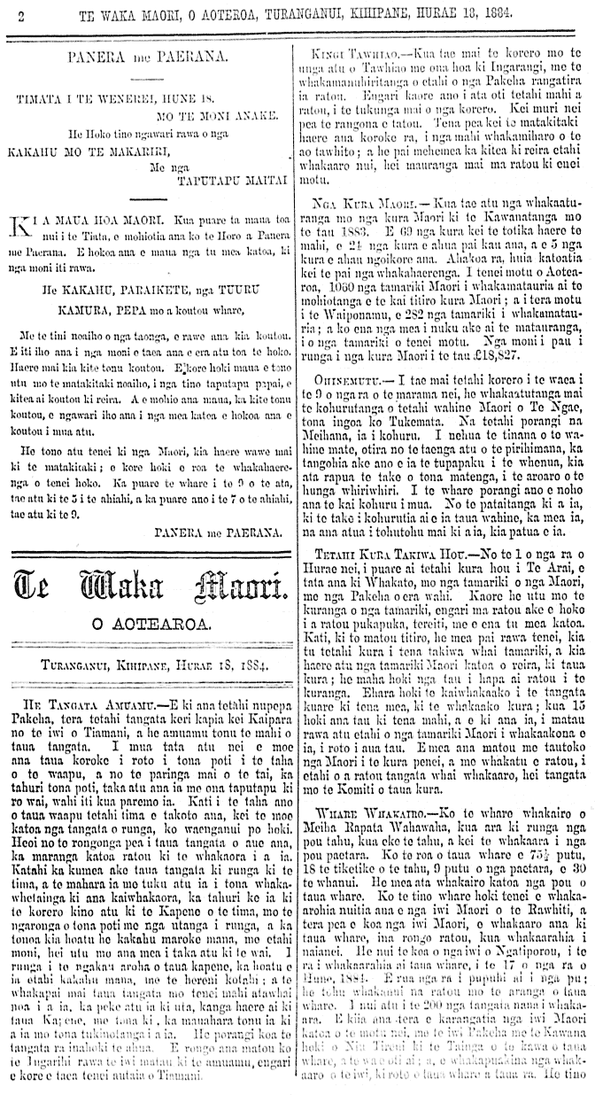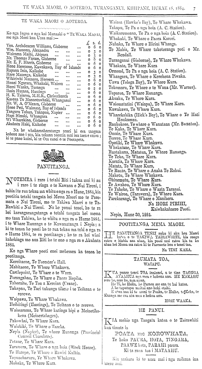 TE WAKA MAORI O AOTEAROA. Ko nga ingoa o nga kai Manaaki o Te Waka Maori, me nga moni kua utua mai; Ven. Archdeacon Williams, Gisborne Wm. Hamona, Alexandra Wairama Maihi, Ahipara Mr Thomas Faram, Gisborne Mr E.F.Harris, Gisborne Hone Hotene, Kawakawa, Bay of Islands Rapana Inia, Kaikohe Wikiriwhi Matauru, Horoera Hoani Ngarara, Whakaki, Wairoa Hemi Waaka, Turanga Ihaia Hutana, Hastings H.K.Taiaroa, M.H.R, Christchurch Karena Te Manaotawhaki, Wanganui Mr W.A.OÕmeara, Gisborne Wi Wharekino, Gisborne Akuhata Haki, Gisborne Na he whakamaharatanga tenei ki era tangata kahore ano i utu, kia tukunga tonutia mai ina taea e ratou ki te pane kuini, ki te Ota ranei te Pootapeta. PANUITANGA No te mea i raro i tetahi Riti i tukua mai ki au i raro i te ringa o te Kawana o Nui Tireni, i tuhia i te rua tekau ma whitu o nga ra o Hune 1884, kia pootita tetahi tangata hei Mema Maori mo te Paremata o Nui Tireni, mo te takiwa maori o te Tairawhiti o Nui Tireni. Na he panui tenei, ko te ra hei karangarangatanga o tetahi tangata hei mema mo taua takiwa ko te whitu o nga ra o Hurae, 1884, i te whare runanga o te Kawanatanga i Nepia, a ki te tonoa he pooti ko te ria tekau ma tahi o nga ra o Hurae 1884, te ra pootitanga ko te ra hei whai kahokinga mo aua Riti ko te ono o nga ra o Akuhata 1884. Ko nga Whare pooti enei mehemea ka tonoa he pootitanga. Kereitaone, Te Foresters Hall Mahitaone, te whare whakawa Castlepoint, Te whare o te waea Porangahau, Te whare o Paora Ropiha Tahorite, Te toa a Kereina (Crane) Takapau, Te Tari tukunga tikete i te Teihana o te rerewe Waipawa, Te whare whakawa Heihitingi, Te teihana o to rerewe Waimarama, Te whare kutinga hipi o Meinetihakena Pakowhai, Te whare kura Nepia, Te whare runanga Petane, Te whare kura Tarawera, Te whare o nga hoia Te Hatepe, Te whare o Rawiri Kaihia Tapuaoharuru, Te whare whakawa Mohaka, Te whare kura Wairoa, Te whare whakawa Takapu, Te Pa o nga hoia Waikaremoana, Te Pa o nga hoia Whakaki, Te whare o Paora Karori Nuhaka, Te whare o Hirini Whanga Turanganui, Te whare whakawa Whakato, Te whare kura Ormond, Te Pa o nga hoia Whangara, Te whare o Kerehona Piwaka Uawa (Tolaga Bay) Te whare kura Tokemaru, Te whare o te Wana Tuparoa, Te whare runanga Akuaku, Te whare kura Waiomatatini, Te whare kura Kawakawa, Te whare kura Wharekahika, Te whare o Te Hati Houkamau Raukokore, Te whare o Wanatana Te Kaha, Te whare kura Omaio, Te whare kura Torere, Te whare kura Opotiki, Te whare whakawa Whakatane, Te whare kura Ruatahuna, Matatua, Te whare runanga Te Teko, Te whare kura Karatia, Te whare kura Matata, Te whare kura Te Ruato, Te whare o Anaha Te Rahui Maketu, Te whare whakawa Ohinemutu, Te whare kura Te Takahe, Te whare o Waata Taranui Te wairoa, Te whare kura Parekarangi, Te whare o Maihera NA HORI PIRIHI Kaiwhakahaere Pooti. Nepia, Hune 30, 1884 POOTITANGA MEMA MAORI. He panuitanga tenei naku ki aku hoa maori katoa o te takiwa Tairawhiti, kia rongo ratou e hiahia ana ahau, kia pooti mai ratou kia tu ko ahau hei Mema ma ratou ki te Paremete hou o tenei tau. NA TIMI KARA. TAUMATA TOA, WAIPU. Kua puare tenei toa inaianei, a te tino Taonga ataahua nga mea e hokona ana. He kakahu rere ke rere ke, nga ahua. He ti. he huka, he paraoa me ena tu kai katoa. A he taputapu maitai ano hoki etahi. E utua ana ki te moni te Poaka te hoiho, te keka, te Kaanga me era atu mea e hokoa ana. HORI WAAKA. HE PANUI, Kia mohio nga tangat katoa o te Tairawhiti kua timata ia POATA ME KOROWHATA, TE HOKO PAURA, HOTA, TINGARA, PAAWE HOTA, PARAHI PAURA. KI TA RAUA TOA I MATAAHU. Kia mahara ki te mau mai i nga raihana ina haere mai. ÿ