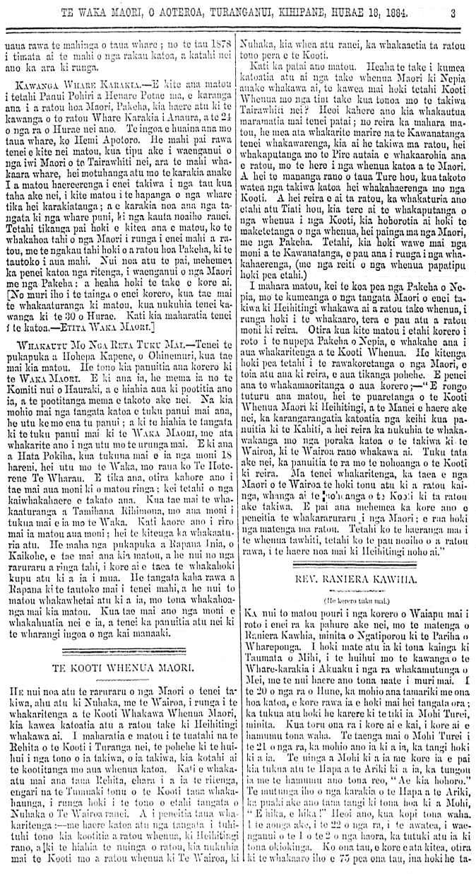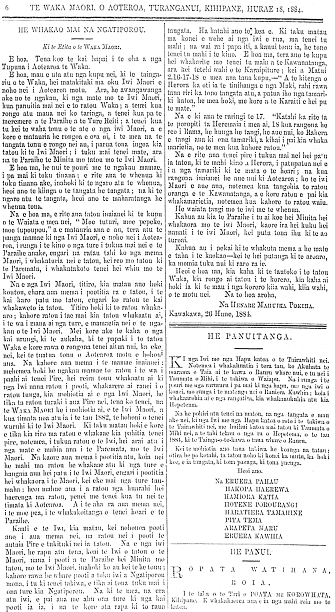 HE WHAKAO MAI NA NIGATIPOROU. Ki te etita o te Waka Maori. E hoa, Tena koe te kai hapai, i te oha a nga tupuna i Aotearoa te Waka. E hoa mau o uta atu nga kupu nei ki te taingariu o te Waka, hei matakitaki ma, oku Iwi Maori e noho nei i Aotearoa motu. Ara, he awangawanga ake no te ngakau ki nga mate mo te Iwi Maori, kua panuitia mai nei e to ratou Waka, a tenei kua rongo atu maua nei ko taringa a tenei kua pa te mertemere a te Paraihe a te Ture Reiti, a tenei kua tu kei te waha tonu o te ata o nga iwi Maori a e kore e matauria he rongo e ora ai, i te mea na te tangata tonu e rongo nei au, i parua tona ingoa kia tatou ki te Iwi Maori, i tuku mai tenei mate, ara na te Paraihe te Minita mo tatou mo te Iwi Maori. E hoa ma he nui te pouri me te ngakau mamae, i pa mai ki toku tinana e rite ana te whenua ki toku tinana ake, inahoki ki te ngaro atu te whenua, heoi ano te kiinga o te tangata he tangata na ki te ngaro atu te tangata, heoi ano te maharatanga he whenua tona. Na e hoa ma rite ana tatou inaianei ki te kupu o te waiata e mea nei, Moe tuturi moe pepeke, moe tupoupou, a e matauria ana e au, tera atu te panga mamae ki nga Iwi Maori, e noho nei i Aotearoa, i runga i te kino o nga ture i tukua mai nei e te Paraihe anake, engari na ratou tahi ko nga mema Maori, i whakaturia nei e tatou, heoi reo mo tatou ki te Paremata, i whakatakoto tenei hei whiu mo te Iwi Maori. Na e nga Iwi Maori, titiro kia matau ano hoki koutou ehara aua mema i pootitia ra e tatou, i te kai karo patu mo tatou, engari ko ratou te kai whakaweto ai tatou. Titiro hoki ki to ratou whakaaro kahore ratou i tae mai kia tatou whakaatu ai, i te wa i mana ai nga ture, e mamaetia nei e te ngakau o te Iwi Maori. Mei kore ake te kaha o nga kai urungi, ki te aukaha ki te papaki i to tatou Waka e kore rawa e rongona tenei aitua nui, ka eke nei, kei te tuatua tonu o Aotearoa motu e houhou ana. Na kahore aua mema i te mamae inaianei, mehemea hoki he ngakau mamae to ratou i te wa i paahi ai tenei Pire, hei reira tonu whakaatu ai ki nga iwi nana ratou i pooti, whakarere ai ranei i o ratou tunga, kia mohiotia ai e nga iwi Maori, he tika ta ratou turaki i aua Pire nei, tena ko tenei, na te Waka Maori ke i mohiotia ai, e te iwi maori. A kua timata noa atu ia i te tau 1882, te hohoni o tenei wuruhi ki te iwi maori. Ki taku matau hoki e kore e tika kia riro ma ratou e whakaae kia pahitia tenei pire, notemea i tukua ratou e te iwi, hei arai atu i nga mate e mahia ana i te Paremata ma te Iwi maori. Na kaore aua mema i pootitia atu, koia nei he mahi ma ratou he whakaae atu ki nga ture e hangaia aua he patu i te iwi maori engari i pootitia hei whakaora i te maori kei eke mai nga ture taumaha heoi mahue ana i a ratou nga huarahi hei haerenga ma ratou, penei me tenei kua tu nei te timata ki Aotearoa. A i te aha ra ana mema nei, i te moe pea, i te whakakoitanga o tenei hoari e te Paraihe. Kaati e te iwi, kia matau, kei nohonga pooti ano i aua mema nei, na ratou nei i pooti te autaia Pire e tukituki nei ia tatou. Na e nga iwi maori, he rapu atu tena koni te iwi o tatou o te maori nana i pooti a te Paraihe hei Minita mo tatou, mo te iwi maori, inahoki ko au kei te he tonu kahore rawa he whare pooti a toku iwi a Ngatiporou mona i tu ki tenei takiwa, e tika ai tona tuku mai i ona ture kia Mgatiporou. Na ki te mea, na era atu iwi, e pai aua me ahu ona ture ki nga kai pooti ia ia, i na te kore ata rapa ki to raua tangata. He katahi ano to kea e. Ki taku matau ma konei e wehe ai nga iwi e rua, ma tenei tu mahi na wai wa i papa iti a kanui tonu ia he tono tenei tu mahi i te kino. E hoa ma tera ano te kupu hei whakarite mo tenei tu mahi a te Kawanatanga, ara kei tetehi wahi o te Karaipiture, kei a Matiu 2, 16-17-18 o mea ana taua kupu, A te kitenga o Herora ka oti ia te tinihanga e nga Maki, rahi rawa tana riri ka tono tangata atu a patua iho nga tamariki katoa he mea hoki me kore a te Karaiti e hei pu te mate. Na e ki ana te raringi te 17. Katahi ka rite ta te poropiti ta Heremaia i mea ai, 18 kua rangona he reo i Rama he hunga he tangi, he aue nui, ko Rahera e tangi ana ki ona tamariki, a kihai i pai kia whaka marietia, no te mea kua kahore ratou. Na e rite ana tenei pire i tukua mai nei hei patu ia tatou, ki te mahi kino a Herora i patupatua nei e i a nga tamariki ki te mata o te hoari, na kua rangona inaianei he aue nui ki Aotearoa, ko te iwi maori e aue ana notemea kua tangohia to ratou oranga e te Kawanatanga a e kore ratou e pai kia whakamarietia, notemea kua kahore to ratouy waiu. He waiata tangi mo te iwi me te whenua. Kahua au kia te Paraihe i tu ai koe hei Minita hei whakaora mo te iwi maori, kaore ira hei kuku hei nanati i te iwi maori, kei puta tona ihu ki te ao turoa. Kahua au i pokai ki te whakuta mema a he mate e taha i te kaokao kei te hei putanga ki te aroaro, ka memia tuku nui ki raro ra e. Heoi e hoa ma, kia kaha ki te tautoko i to tatou waka, kia rongo ai tatou i te korero, kia kaha ai hoki ia ki te mau i nga korero kiia wahi, kiia wahi, o te motu nei. Na to hoa aroha, NA HENARE MAHUIKA POKIHA Kawakawa, 26 o Hune, 1884. HE PANUITANGA. Ki nga iwi me nga hapu katoa o te Tairawhiti nei. Notemea i whakahuatia i tera tau, ko Akuhata te marama e taia ai te kawa o Rauru whare nui, e tu nei i Taumata o Mihi, i tu takewa o Waiapu. Na i runga i te pouri me nga raruraru i pa mai ki nga hapu, me nga iwi o konei, mo runga i te matenga nei o Raniera Kawhia, koia i whakaarohia ai e nga rangatira, kia whakanukuhia atu kia Hepetema. Na he pohiri atu tenei na matou, na nga tangata e mau ake nei ki nga iwi me nga Hapu katoa o roto i te takiwa o te Tairawhiti nei, me huihui katoa mai tatou ki taumata o Mihi nei, a te tahi tekau o nga ra o Hepetema, o te tau 1884, ki te Tainga-o-te-kawa o tana whare o Rauru. Kei te mohiotia ano taua takiwa he koanga na tatou, otira he po kotahi ta taou noho ki konei ka mutu, ka hoki i koe, e ia tangata, ki tona paenga ki tona paenga. Heoi ano, NA ERUERA PAHAU HAKOPA HAEREWA HAMIORA KATIA HOTENE POROURANGI HARATIERA TAMAHINE P