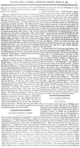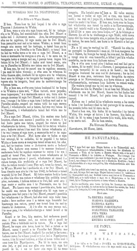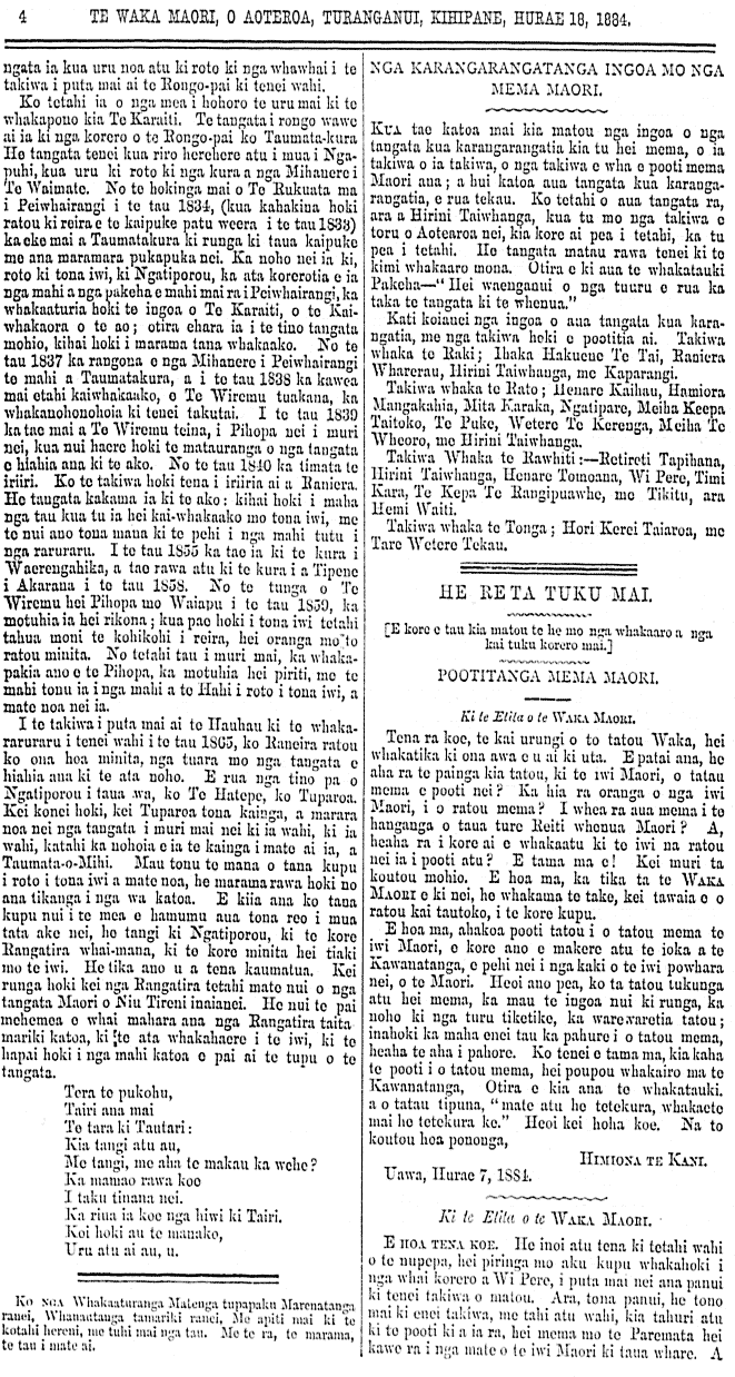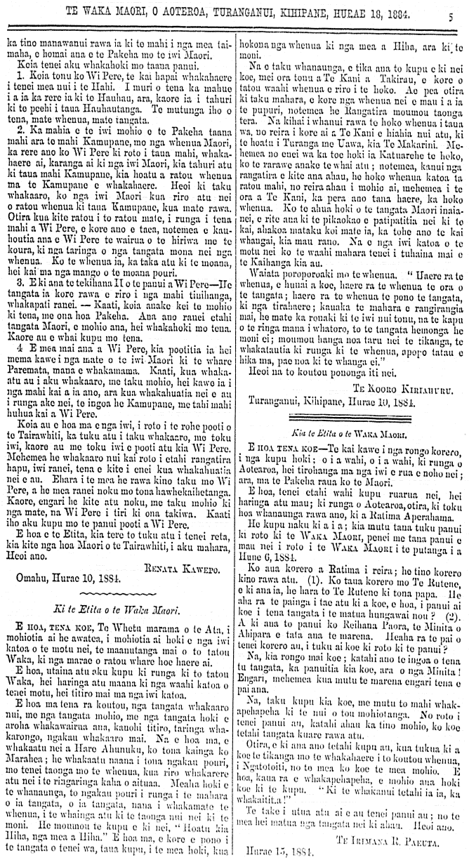 ka tino manawanui rawa ia ki te mahi i nga mea taimahana homai ana e te Pakeha ma te iwi Maori. Koia tenei aku whakahoki mo taana panui. 1. Koia tonu ko Wi Pere, te kai hapai whakahaere i tenei mea nui i te Hahi. I murui o tena mahue i a ia ka rere ia ki te Hauhau, ara, kaore ia i tahuri ki te peehi i taua Hauhautanga. Te mutunga iho o tena, mate whenua, mate tangata. 2. Ka mahia e te iwi mohio a te Pakeha mana mahi ara te mahi Kamupane mo nga whenua Maori, ka rere ano ko Wi Pere ki roto i taua mahi, whakahaere ai, karanga ai ki nga iwi Maori kia tahuri atu ki taua mahi Kamupaue kia hoatu a ratou whoutia ana te Kamupane e whakahaere. Heoi ki taku whakaaro, ko nga iwi Maori kua riro atu nei a ratou whenua ki taua Kamupane, kua mate rawa. Otira kua kite ratou to ratou mate i runga i tona mahi a Wi Pere, a kore ano e taea notemea e kauhoutia ana a Wi Pere te wairua e te hiriwa me te koura ki nga taringa e nga tangata mona nei nga whenua. Ko te whenua ia, ka taku atu ki te moana, hei kai ma nga mango o te moana pouri. 3. E ki ana te tekihana II o te panui a Wi Pere - He a tangata ia kore rawa a riro i nga mahi tinihanga whakapatu ranei. Kaati koia anake kei te mohio ki tona tae ona hoa Pakeha. Ana ano ranei etahi tangata Maori, e mohio ana, hei whakahoki mo taua. Kaore au e whai kupu mo tena. 4. E mea mai ana a Wi Pere, kia pooatia ia hei memo kawe i nga mate o te iwi Maori ki te whare Paremata, mana a whakamama. Kaati kua whakaatu whakaaro ana taka mohio hei kawe ia i nga mahi kai e ia ano ara kua whakahuatia nei au i runga ako nei, te ingoa he Kamupane, me tahi mahi huhua kai a Wi Pere. Koia ana hoa ma e nga iwi i roto i te rohe peoti a te Tairaiwhiti, ka tuku atu i taku whakaaro, me toku iwi, kaore au me toku iwi e pooti atu kia Wi Pere. Mehemea he whakaaro nui kai roto i etahi rangatira hapu, iwi ranei, tena e kite i enei kua whakahuatia nei e au. Ehara i te mea he rawa kino taku mo Wi Pere, a he mea ranei noku mo tona hawhekaihetanga. Kaore engari he kite ata noku, me taku mohio o ki nga mate, na Wi Pere tiri ki ona takiwa. Kaati iho aku kupu mo te panui pooti a Wi Pere. E hoa e te Etita, kia tere te tuku atu tenei reta kia kite nga hoa Maori e te Tairawhiti i aku mahara Heoi ano. RENATA KAWEPO. Omahu, Hurae 10, 1884. Ki te Etita o te Waka Maori. E hoa, tena koe, Te whetu marama o te Ata, i mhiotia ai he awatea, i mohiotia ai hoki e nga iwi katoa o te motu nei, te maanutanga mai o to tatou Waka, ki nga marae o ratou whare hoe haere ai. E hoa utaina ata aku hupu ki runga ki to tatou Waka, hei haringa atu maana ki nga waahi katoa o tenei motu, hei titiro mai ana nga iwi katoa. E hoa ma tena ra koutou nga tangata whakaaro nui, me nga tangata mohio me nga tangata hoki e aroha whakawairua ana, kanohi titiro tarunga whakarongo, ngakau whakaaro mai. Na e hoa ma, e whakaatu nei a Hare Ahunuku ko tona kainga ko Marahea, he whakaatu naana i tona ngakau pouri, mo tenei taonga mo te whenua kua riro whakarero atu nei i te ringaringa kaha o aitua. Meaha hoki e te whanaunga, to ngakau pouri i runga i te mahara o ia tangata, o ia tangata, nana i whakamate te whenua, i te whainga atu ki to taonga nui ki te moni. He moumou te kupu e ki nei, hoatu kia Hiha nga mea a Hiha. E hoa ma, e koro e pono i te tangata o tenei wa, taua kupu, i te mea hoki, kua hokona nga whenua ki nga mea a Hiha, ara ki te moni. Na e taku whanaunga a tika a te kupu o ki nei koe, mei ora tonu ta Te Mak a Takirau, e kore e tatou waahi whenua a riro i te hoko. Ae pea, otira ki taku mahara, e kore nga whenua nei e mau i a ia te pupuri, notemea he Rangira moumou taonga tera. Na kihai i whanui rawa te hoko whenua i taua wa, no reira i kore ai a Te Kani e hiahia nui aki ki to hoatu i Turanga me Uawa kia Te Makarini. Me. hemea no enei wiki toe hoki ia Katuarehe te hoko, ko te rarawe anake te whai atu, notemea kanui nga rangatira e kite ana ahau, he hoko whenua katoa ai ratou mahi he reira ahau i mohio mmehemea i te ora o Te Kani, ka pera ano tana haere, kua hoko whenua. Ko te ahua hoki o te tangata Maori inaianei, e rite ana ki te pikaokao e patipatitia nei ki te kai, ahakoa mataku koi mate ia, ka tohe ano te kai whangai, kia mau rano. Na e nga iwi katoa o te motu nei ko te waahi mahara tenei i tuhaina mai e te Kaihanga kia au. Waiata poroporoaki mo te whenua. Haere ra te whenua, e hunai a koe, haere ra te whenua te ora o te tangata, haere ra te whenua te pono te tangata ki nga tirahaere, kauaka te mahara e rangirangia mai, he mate ka rouaki ki te iwi nui tonu, na te kapu o te ringa mana i whatoro to te tangata heomonga he moni ei, moumou hanga noa taru nei te tikanga te whakatautia ki runga ki te whenua, aporo tatau e hika ma, pae noa ki te whanga nei. Heoi na to koutou pononga iti nei. TE KOORO KIRIAHURU. Turanganui, Kihipane, Hurae 10, 1884. Ki te Etita o te Waka Maori. E hoa, tena koe. Te kai kawe i nga rongo korero, i nga kupu hoki, o i a wahi, o i a wahi, ki runga o Aotearoa, hei tirohanga ma nga iwi e rua e noho nei, ara, ma te Pakeha raua ko te maori. E hoa tenei etahi wahi kupu ruarua nei, hei haringa atu mau, ki runga o Aotearoa, otira, ki toku hoa whanaunga rawa ano, ki a Ratima Aperahama. He kupu naku ki a i a, kia mutu tana tuku panui ki roto ki te Waka Maori, penei me tana panui e mau nei i roto i te Waka Maori i te putanga i a Hune 6, 1884. Ko ana korero a Ratima i reira, he tino korero kino rawa atu. (1) Ko tana korero mo Te Rutene, e ki ana ia, he hara to Te Rutene ki tona papa. He aha ra te painga i tae atu ki a koe, e hoa, i panui ai koe i tena tangata i te matua hungawai nou. (2) A ki ana to panui ko Reihana Paora, te Minita o Ahipara e tata ana te marena. Heaha ra te pai o tenei korero au, i tuku ai koe ki roto ki te panui. Na, kia rongo mai koe, katahi ano te ingoa o tena tu tangata, ka panuitia kia koe, ara o nga Minita. Engari, mehemea kua mutu te marena engari tena e pai ana. Na, kia rongo mai koe, katahi ano te ingoa o tena tu tangata, ka panuitia kia koe, ara o nga Minita. Engari, mehemea kua mutu te marena engari