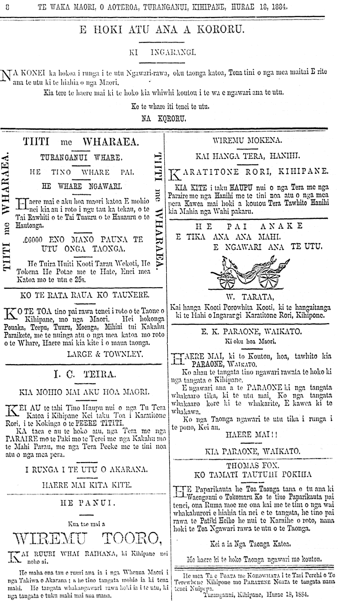 E HOKI ATU ANA A KORORU. KI INGARANGI. NA KONEI ka hokoa i runga i te utu Ngawari rawa, oku taonga katoa Tona tini o nga mea maitai, E rite ana te utu ki te hiahia e nga Maori. Kia tere te haere mai ki te hoko kia whiwhi koutou i te wa e ngawari ana te utu. Ko te whare ai tenei te utu. NA KORORU. TIITI me WHARAEA. TURANGANUI WHARE HE TNO WHARE PAI HE WHARE NGAWARI. Haere mai e aku hoa maori katoa E mohio nei kia au i roto i nga tau ka tekau o te a Tai Rawhiti o te Tai Tuauru o te Hauauru o te Hautonga. 6000 ENO MANO PAUNA TE UTU ONGA TAONGA. He Tuira Huiti Kooti Tarau Wekoti, He Tokena. He Potae me te Hate, Enei mea Katoa mo te utu e 25s. KO TE RATA RAUA KO TAUNERE. Ko te toa tino pai rawa tenei rute o te Taone o Kihipane mo nga Maori. Hei hokonga Pouaka, Teepu, Tuuru, Moenga, Mihini tui Kakahu, Paraikete, me te nui nga atu o nga mea katoa mo roto o te Whare, Haere mai kia kite i o maua taonga. LARGE & TOWNLEY I. C. TEIRA. KIA MOHIO MAI AKU HOA MAORI. Kei au te tahi Tino Haupu nui o nga Tu Tera Katoa i Kihipane Kei taku Tera i Karatitone Rori, i te Kokinga o te PEERE TITITI. Ka taea e au te hoko atu nga Tera me nga PARAIRE mo te Paki mo te Terei me nga Kakahu mo te mahi Parau, me nga Tera Peeke me te tini noa atu i nga mea pera. I RUNGA I TE UTU O AKARANA. HAERE MAI KITA KITE. HE PANUI. Kua tae mai a WIREMU TOORO, Kai ruuri whai raihana ka Kihipane nei noho ai. He maha ona tau e ruuri ana ia i nga Whenua Maori i nga Takiwa o Akarana, a he tino tangata mohio ia ki tena mahi. He tangata whakangawari rawa hoki ia i te utu, ki nga tangata e tuku mahi mai aua mana. WIREMU MOKENA. KAI HANGA TERA, HANIHI. Haere mai ki te Whare whero (te Pei) Karatitone Rori, Kihipane. Kia kite i taku haupu nui o nga Tera me nga Paraire me nga Haihi me te tini noa atu o nga mea pera Kawea mai hoki a koutou Tera Tawhito Hanihi kia Mahia nga Wahi pakaru. HE PAI ANAKE E TIKA ANA ANA MAHI. E NGAWARI ANA TE UTU. W. TARATA KAI hanga Kooti Porowhita Kooti ki te hangaitanga kite Hahi o Ingarangi Karatitone Rori, Kihipone. E K PARONE WAIKATO. Ki oku hoa Maori Haere mai ki to Koutou, hoa, tawhito kia PARAONE, Waikato. Ko ahau te tangata tino ngawari rawata te hoko ki nga tangata o Kihipane. E ngawari ana a te Paraone ki nga tangata whakaaro tika, ki te utu mai, Ko nga tangata whakaaro kore ki te whakarite, E kawea ki te whakawa. Ko nga Taonga ngawari te utu tika i runga i te pono, Kei au. HAERE MAI! KIA PARAONE, WAIKATO. THOMAS FOX. KO TAMATI TAITUHI POKIHA HE Paparikauta he Toa Taonga tana e tu ana ki Waenganui o Tokomaru Ko te tino Paparikauta Pai tenei, ona Ruma moe me ona kai me te tini o nga wai whakahurori hiahia tia nei e te tangata, te tino pai rawa te Patiki Hoiho he nui te Karaihe o roto, nana hoki te Toa Ngawari rawa te utu o te Taonga. Kei a ia Nga taonga Katoa. Me haere ki te hoko Taonga ngawari mo koutou. He mea Ta e Poata me Korowhata i te Tari Perehi o Te Terewhene Kihipane mo Paratene Ngata te tangata nana tenei Nuipepa. Turanganui, Kihipane, Hurae 18, 1884. ÿ