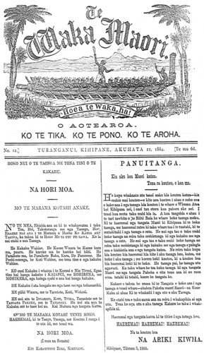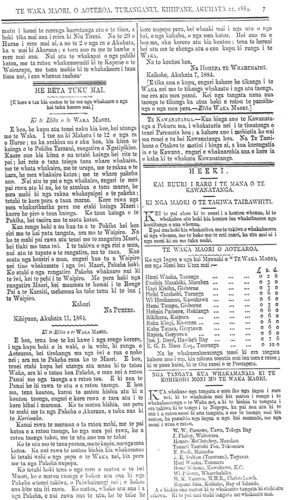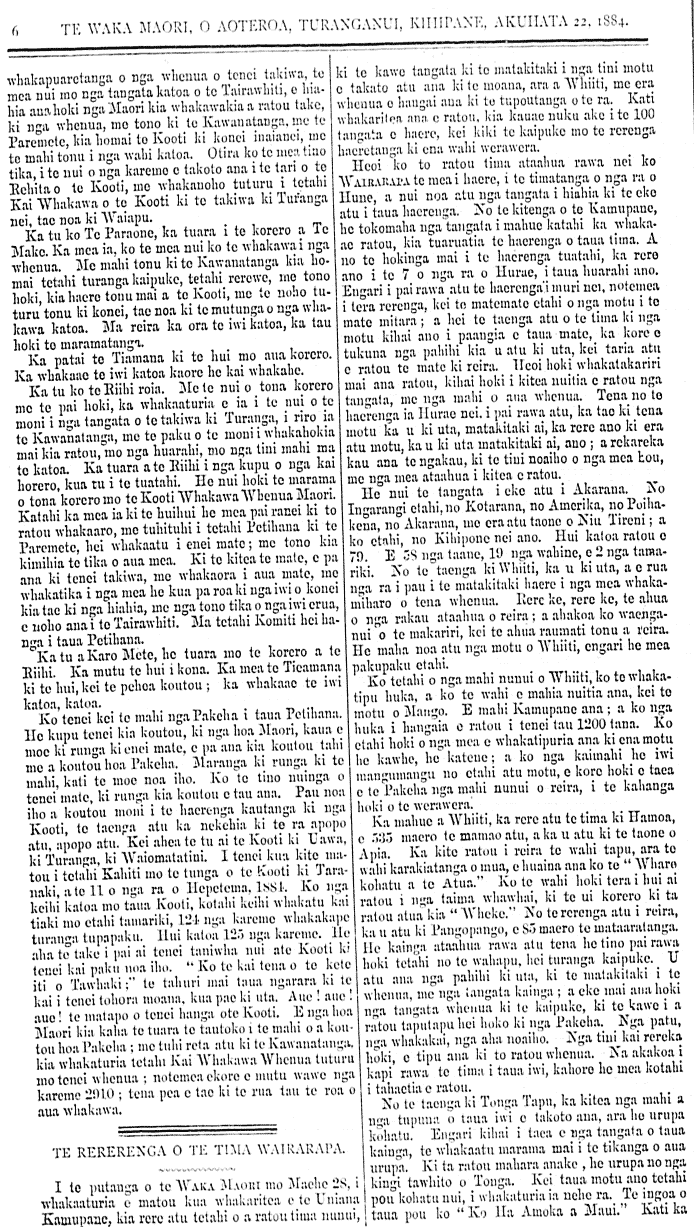mutu i konei te rerenga haeretanga atu o te tima, a hoki tika mai ana i reira ki Niu Tireni. No te 29 o Hurae i rere mai ai, a no te 2 o nga ra o Akuhata, ka u mai ki Akarana e toru ano ra me te hawhe e rere mai ana. Nui atu te whakapai o nga pahihi katoa me ta ratou whakamoemiti ki te Kapene o te Wairarapa, mo tona mohio ki te whakahere i taua tima nui, i ena whenua tauhou. HE RETA TUKU MAI. [E kore o tau kia matou te he mo nga whakaaro a nga kai tuku korero mai.] Ki te etita o te Waka Maori. E hoa, he kupu atu tenei naku kia koe, hei utanga mo te waka. I tae au ki Maketu i te 12 o nga ra o Hurae, na ka arahina au e aku hoa, kia kitea te kainga o te Pokiha Taranui, rangatira o Ngatipikiao. Kaore ano kia kitea e au tetahi kainga hei rite te pai, kei roto o tana taiepa tana whare whakairo, me te whata whakairo katoa, me te rakau o te kara he mea whakairo katoa me te whare pakeha ano. Nui atu te pai o nga whakiro engari te mea pai rawa atu ki au, ko te ataahua o tana marae, he mea mahi ki nga rakau whakapaipai o te pakeha, tetahi te kore paru o taua marae. Kore rawa nga mea whakarihariha pera me etahi kainga Maori, kahore he piro o taua kainga. Ko taua kainga o te Pokiha, hei tauira mo te motu katoa. Kua rongo hoki e au kua tu a te Pokiha hei hoa riri mo te kai patu tangata ara mo te Waipiro. Na ko te mahi pai rawa atu tenei mo te rangatira Maori hei tiaki mo tana iwi. I te takiwa o nga riri o mua nui atu te tupato o te rangatira mo te taua. Kua mutu nga hoariri o mua, engari kua tu a Waipiro nei tino whakamate i nga iwi Maori, Pakeha hoki. Ko etahi o nga rangatira Pakeha whakaaro nui ki te iwi, kei te pehi i te Waipiro. Me pera hoki nga rangatira Maori kei maumau te homai i te Rongo Pai a te Karaiti, mehemea ka tohe tonu ki te inu i te Waipiro. Kahuri, NA PIRERE. Kihipane, Akuhata 11, 1884. Ki te etita o te Waka Maori. E hoa tena koe te kai kawe i nga rongo korero, i nga kupu hoki o ia wahi, o ia wahi, ki runga o Aotearoa, hei tirohanga ma nga iwi e rua e noho nei ara ma te Pakeha raua ko te Maori. E hoa, tenei etahi kupu hei utanga atu mau ki to tatou Waka ara ki o tatou hoa Pakeha e mau nei a ratou Panui mo nga taonga o a ratou toa. E ki ana te Panui he iti rawa te utu o a ratou taonga. E hoa ma, tena koutou kanui to matou hiahia atu ki a koutou taonga, engari e kore rawa e taea atu i te kore kihai i marama. Ko to matau hiahia me pera te mahi me ta nga Pakeha o Akarana, e tuku ana ki te Korimako. Kanui rawa te marama o ta ratou mahi me te pai katoa o a ratou taonga, ko nga mea pai rawa ko a ratou taonga takai, me te utu ano mo te takai. Ko te utu mo te tana parapa, mo te kapia mo nga mea katoa. Ka nui rawa to matou hiahia kia whakamaua ki tetahi wahi o nga pepa o te waka nei, kia pera me ta nga Pakeha nupepa. Ko tetahi hoki tena o nga raru o matou o te iwi Maori ko o matou taonga e hokoa atu ana ki nga Pakeha o tenei takiwa, o Pewhairangi nei e hokoa ana kite utu iti rawa. Ko matou e hoko atu ana i a nga Pakeha e nui rawa ana te utu, ko te take he kore nupepa pera, hei whaaki mai i nga utu o nga kai, o nga kakahu, o nga mea katoa. Heoi ano ra e hoa ma akku korero atu ki a koutou tena te hereni hei utu mo te ekenga atu o ena kupu ki runga i te Waka. Na to koutou hoa, NA HOHEPA TE WHAREMAIHI. Kaikore, Akuhata 7, 1884 [E tika ana o kupu engari kahore he tikanga i te Waka nei, mo te tikanga whakaatu i nga utu taonga, me era atu mea panui. Kei nga tangata nana aua taonga te tikanga ka utua hoki e ratou te panuitanga o nga mea pera. - Etita o Waka Maori.] TE KAWANATANGA.- Kua hinga ano te Kawanatanga a Pokuru ma, i whakaturia nei i te timatanga o tenei Paremata hou, a kahore ano i mohiotia ko wai ma ranei e tu hei Kawanatanga hou. Na Te Tamihana Otakou te motini i hinga ai, a kua karangatia ia e te kawana, engai e whakaarohia ana e kore ia e kaha ki te whakatu Kawanatanga. HEEKI. KAI RUURI I RARO I TE MANA O TE KAWANATANGA. KI NGA MAORI O TE TAKIWA TAIRAWHITI. Kei te pai ahau ki te ruuri i a koutou whenua, ki te whakahoa atu hoki kia koutou ina whakahaerea nga kootitanga o aua whenua. E pai ana hoki kia whakaritea mo te takiwa e whaka haerea ai nga whenua, mo te hoko mo te reti ranei, ka utu mai ai i nga moni ki au mo taku mahi. TE WAKA MAORI O AOTEAROA. Ko nga ingoa o nga kai Manaaki o te Waka Maori, me nga moni kua utua mai:- Heemi Waaka, Turanga Eraihia Matahiki, Marahea Hapi Kiniha, Gisborne Pirihi Tutekohi, Turanga Wi Houkamau, Kawakawa Hemi Tutapu, Gisborne Hohaia Patuone, Hokianga Rikihana, Kaipara Ruka Kingi, Riverton Kahu Tutara, Greytown Rapira, Greytown J.Boyd, Hawkes bay E.G.B.Moss Esq, Tauranga Na he whakamaharatanga tenei ki era tangata kahore ano i utu, kia tukuna tonutia mai ina taea e ratou ki te pane kuini ki te Ota ranei o te pootapeta. NGA TANGATA KUA WHAKAMANAIA KI TE KOHIKOHI MONI MO TE WAKA MAORI. Kua whakaae nga tangata e mau iho nga ingoa i raro nei ki te whakahoa mai kia matou i runga i te whakahaerenga o te Waka nei, a ki te hiahia te tangata i era takiwa ki te tanga o te Nupepa , ka pao noa atu ki te utu i a ratou moni ki aua tangata, a mo te taenga mai kia matou, ka panuitia nga ingoa o nga kai manaaki, me nga moni i utua e ratou. W.W.Paraone, Uawa, Tologa Bay J.Finlay, Waitotara Henare McClutchey, Marahea Tamati Tautuhi Fox, Tokomaru F.Pook, Mataahu J.E.Dalton, Tuparoa Hori Waaka, Taumata Rene Mokena, Kawakawa Wi Pahera, Wharekahika H.K.Taiaroa, Christchurch Rupana Inia, Kaikohe, Bay of Islands. A e hiahia ana matou ki te whakarite tangata ki etahi atu takiwa. Ki te pai mai etahi tangata me whakaatu mai. ÿ