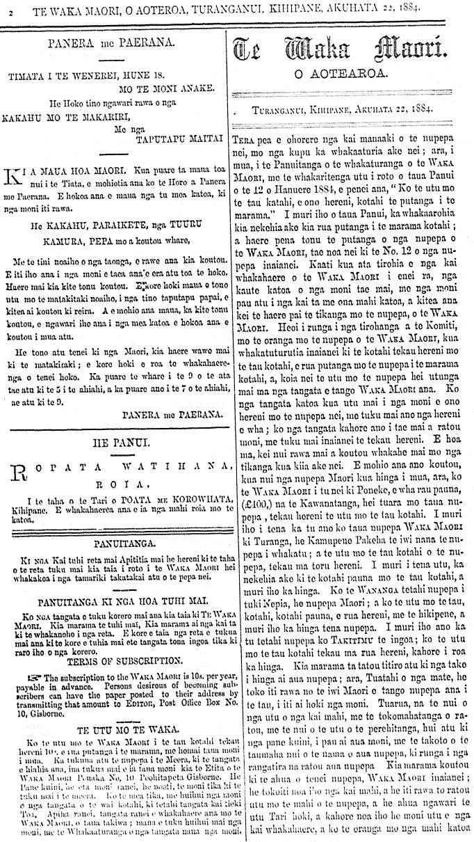 PANERA ME PAERANA. Timata i te Wenerei, Hune 18. Mo te moni anake. He hoko tino ngawari rawa o nga Kakahu mo te Makariri, me nga TAPUTAPU MAITAI. Ki a maua hoa maori. Kua puare ta maua toa nui i te Tiata, e mohiotia ana ko te Horo a Panera me Paerana. E hokoa ana e maua nga tu mea katoa, ki nga moni iti rawa. He kakahu, paraikete, nga tuuru Kamura, pepa mo a koutou whare, Me te tini noaiho o nga taonga, e rawe ana kia koutou. E iti iho ana i nga moni e taea ana e era atu toa te hoko. Haere mai kia kite tonu koutou. E kore hoki maua e tono utu mo te matakitaki noaiho, i nga tino taputapu papai, e kitea ai koutou ki reira. A e mohio ana maua ka kite tonu koutou, e ngawari iho ana i nga mea katoa e hoko ana e koutou i mua atu. He tono atu tenei ki nga Maori, kia haere wawe mai ki te matakitaki, e koro hoki e roa te whakahaerenga o tenei hoko. Ka puare te whare i te 9 o te ata, tae atu ki te 5 i te ahiahi, a ka puare ano i te 7 o te ahiahi, tae atu ki te 9. PANERA ME PAERANA. HE PANUI. ROPATA WATIHANA ROIA. I te taha o te Tari o Poata me Korowhata, Kihipane, E whakahaerea ana e ia nga mahi roia mo te katoa. PANUITANGA. Ki nga kai tuhi reta mai Apititia mai he hereni ki te taha o te reta tuku mai kia taia i roto i te WAKA MAORI hei whakakoa i nga tamariki takatakai atu a te pepa nei. PANUITANGA KI NGA HOA TUHI MAI. Ko nga tangata e tuku korero mai ana kia taia ki Te WAKA MAORI. Kia marama te tuhi mai, kia marama ai nga kai ta ki te whakanoho i nga reta. E kore e taia nga reta e tukua mai ana kite kore e tuhia mai e te tangata tona ingoa tika raro iho o nga korero. TERMS OF SUBSCRIPTION. The subscription to the Waka Maori is 6s. per year, payable in advance. Persons desirous of becoming sunscribers can have the paper posted to their address by transmitting that amount to Editor, Post Office Box No. 10, Gisborne. TE UTU MO TE WAKA. KO te utu mo te WAKA MAORI i te tau e ono hereni, me homai taua moni ki mua. Ka tukuna atu te nuipepa i te Meara ki te tangata e hiahia ana me ka tukua mai e ia tana moni ki a te Kaituhi o te Waka Maori. Pouaka, No.10, Poohitapeta, Gisborne. He pane kuini, He ote moni ranei te moni tika ki te tuku mai te meera. Ko te mea tika rawa me huihui nga moni o E tangata o te Wahi Kotahi. Ki te tahi tangata Kaitiaki Toa, Apiha ranei o tana takiwa mana e tuku huihui mai nga moni. Mo te whakaaturanga o nga tangata nana nga moni. TE WAKA MAORI O AOTEAROA. TURANGANUI, KIHIPANE, AKUHATA 22, 1884. Tera pea e ohorere nga kai manaaki o te nupepa nei mo nga kupu ka whakaaturia ake nei, ara i mua i te Panuitanga o te whakaturanga o te Waka Maori me te whakaritenga utu i roto o taua Panui o te 12 o Hanuere 1884, e penei ana, Ko te utu mo te tau kotahi, e ono hereni, kotahi te putanga i te marama. I muri iho o taua Panui, ka whakaarohia kia nekehia ake kia rua putanga i te marama kotahi, a haere pena tonu te putanga o nga nupepa o te Waka Maori, tae noa nei ki te no.12 o nga nupepa inaianei. Kaati kua ata tirohia e nga kai whakahaere o te Waka Maori i enei ra, nga kaute katoa o nga moni tae mai, me nga moni pau atu i nga kai ta me ona mahi katoa, a kitea ana kei te haere pai te tikanga mo te nupepa o te Waka Maori. Heoi i runga i nga tirohanga a te Komiti, me te oranga mo te nupepa o te Waka Maori, kua whakatuturutia inaianei ki te kotahi tekau hereni mo te tau kotahi e rua putanga mo te nupepa i te marama kotahi a, koia nei te utu mo te nupepa hei utunga mai ma nga tangata e tango Waka Maori ana. Ko nga tangata katoa kua utu mai i nga moni e ono hereni mo te nupepa nei me tuku mai ano nga hereni e wha, ko nga tangata kahore ano i tae mai a ratou moni, me tuku mai inaianei te tekau hereni. E hoa ma, kei nui rawa mai a koutou whakahe mai mo nga tikanga kua kiia ake nei. E mohio ana ano koutou, kua nui nga nupepa Maori kua hinga i mua, ara, ko te Waka Maori i tu nei ki Poneke, e wha rau pauna, 400, na te Kawanatanga, hei tuara mo taua nupepa tekau hereni te utu mo te tau kotahi. I muri iho i tena ka tu ano ko taua nupepa Waka Maori ki Turanga, he Kamupene Pakeha te iwi nana te nupepa i whakatu a te utu mo te tau kotahi o te nupepa tekau ma toru hereni. I muri tena utu, ka nekehia ake ki te kotahi pauna mo te tau kotahi, a muri iho ka hinga. Ko te Wananga tetahi nupepa i tuki Nepia he nupepa maori, a ko te utu mo te tau, kotahi, kotahi pauna e rua hereni me te hikipene a muri iho ka hinga tena nupepa. I muri iho ano ka tu tetahi nupepa ko Takitimu te ingoa, ko te utu mo te tau kotahi tekau ma rua hereni, kahore i roa ka hinga. Kia marama ta tatou titiro atu ki nga take i hinga ai aua nupepa ara, Tuatahi o nga mate, he toko iti rawa no te iwi Maori e tango nupepa ana i te tau, i iti ai hoki nga moni. Tuarua na te nui o nga utu o nga kai mahi, me te tokomahatanga o tatou me te nui o te utu o te perehitanga, hui atu ki nga pane kuini, i pau ai aua moni, me te takoto o te taumaha nui o te nama o aua nupepa ki runga i nga rangatira na ratou aua nupepa, Waka Maori inaianei, he tokoiti noa iho nga kai mahi a he iti rawa to ratou utu mo te mahi o te nupepa a h eahua ngawari te utu Tari, hoki a kahore noa iho he moni utu e nga kai whakahaere, a ko te oranga mo nga mahi katoa ÿ