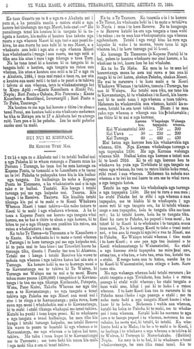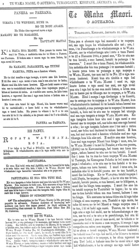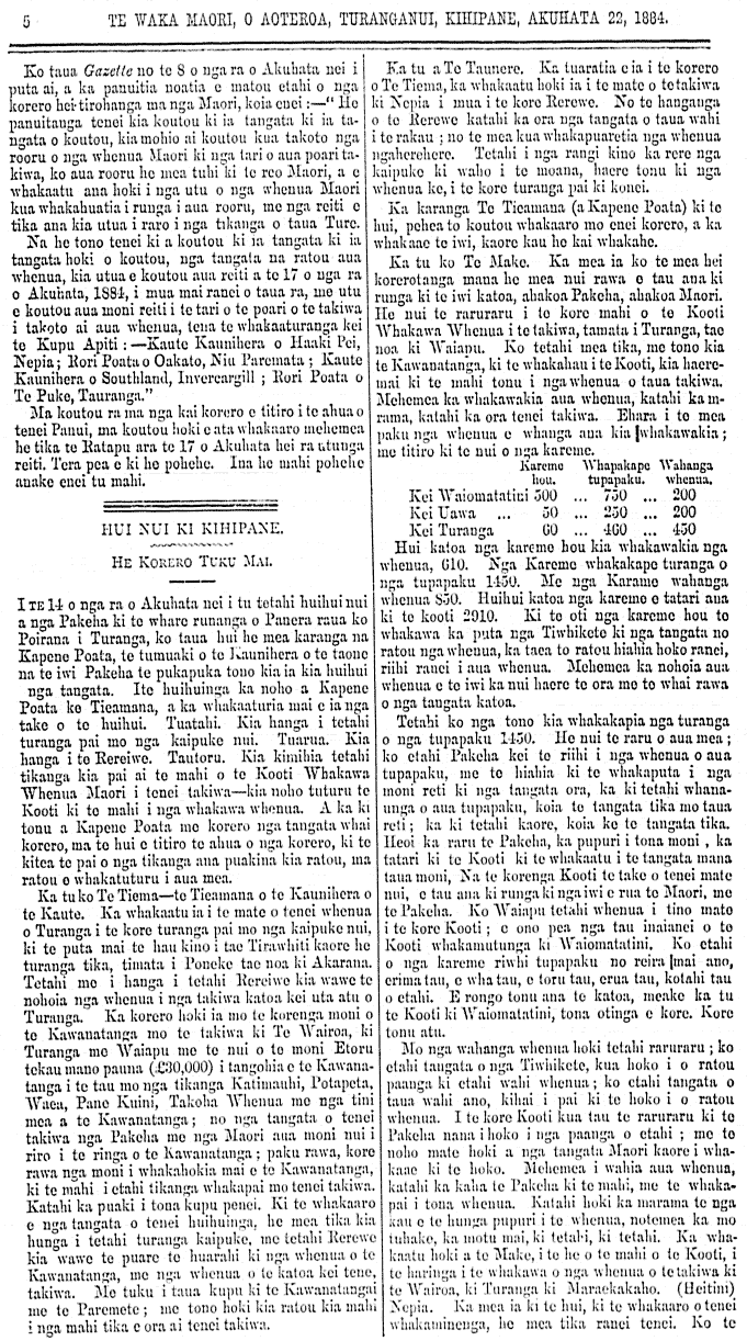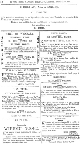 Ko taua Gazette no te 8 o nga ra o Ahuhata nei i puta ai, a ka panuitia noatia e matou etahi o nga korero kia tirohanga ma nga Maori, koia enei a He panuitanga tenei kia koutou ki ia tangata ki ia tangata o koutou, kia mohio ai koutou kua takoto nga rooru o nga whenua Maori ki nga tari o aua poari takiwa ko aua rooru he mea tuhi ki te reo Maori, a e whakaatu aua hoki i nga utu o nga whenua Maori kua whakahuatia i runga i aua rooru me nga reiti e tika ana kia utua i raro i nga tikanga o taua Ture. Na he tono tenei ki a koutou ki ia tangata ki ia tangata hoki o koutou nga tangata na ratou aua whenua, kia utua e koutou aua reiti a te 17 o nga ra o Akuhata 1884, i mua mai ranei e taua ra, me utu e koutou a moni reiti i te tari o te poari o te takiwa takoto ai aua whenua, tena te whakaaturanga kei te Kupu Apiti:- Kaute Kaunihera o Haaki Pei, Nepia, Rori Poata o Oakato, Niu Paremata, Kaute Kaunihera o Southland, Invercargill, Rori Poata o Te Puke, Tauranga. Ma koutou ra ma nga kaikorero e titiro i te ahua o tenei Panui, ma koutou hoki e ata whakaaro mehemea he tika te Ratapu ara te 17 o Akuhata hei ra utunga reiti. Tera pea e ki he pohehe. Ina he mahi pohehe anake enei tu mahi. HUI NUI KI KIHIPANE. HE KORERO TUKU MAI. I te 14 o nga ra o Akuhata nei i tu tetahi huihui nui a nga Pakeha ki te whare runanga o Panera raua ko Poirana i Turanga, ko taua hui he mea karanga na Kapene Poata, te tumuaki o te Kaunihera o te taone na te iwi Pakeha te pukapuka tono kia ia kia huihui nga tangata. I te huihuinga ka noho a Kapene Poata ke Tieamana, a ka whakaaturia mai e ia nga take o te huihui. Tuatahi, kia hanga i tetahi turanga pai mo nga kaipuke nui. Tuarua, kia hanga i te Rereiwe. Tuatoru, kia kimihia tetahi tikanga kia pai ai te mahi o te Kooti Whakawa Whenua Maori i tenei takiwa kia noho tuturu te Kooti ki te mahi i nga whakawa whenua. A ka ki tonu a Kapene Poata me korero nga tangata whai korero, ma te hui e titiro te ahua o nga korero, ki te kitea te pai o nga tikanga ana puakina kia ratou, ma ratou e whakatuturu i aua mea. Ka tu Te Tiema-te Tieamana o te Kaunihera o te Kaute. Ka whakaatu ia i te mate o tenei whenua Turanga i te kore turanga pai mo nga kaipuke nui ki te puta mai te hau kino i tae Tirawhiti kaore he turanga tika, timata i Poneke tae noa ki Akarana. Tetahi me i hanga i tetahi Rereiwe kia wawe te nohoia nga whenua i nga takiwa katoa kei uta atu o Turanga. Ka korero hoki ia mo te korenga moni o te Kawanatanga mo te takiwa ki Te Waiora, ki Turanga me Waiapu me te nui o te moni Etoru tekau mano pauna 30,000 tangohia e te Kawanatanga i te tau mo nga tikanga Katimauhi, Potapeta, Waea, Pane Kuini, Takoha Whenua mo noa tini mea e te Kawanatanga no nga tangata o tenei takiwa nga Pakeha me nga Maori aua moni nui i riro i te ringa o te Kawanatanga, paku rawa, kore rawa nga moni i whakahokia mai e te Kawanatanga, ki te mahi i etahi tikanga whakapai mo tenei takiwa. Katahi ka puaki i tona kupu penei. Ki te whakaaro e nga tangata o tenei huihuinga he mea tika kia hunga i tetahi turanga kaipuke, me tetahi Rerewe kia wawe te puare te huarahi ki nga whenua o te Kawanatanga, me nga whenua o te katoa kei tenei takiwa. Me tuku i taua kupu ki te Kawanatanga me te Paremete, me tono hoki kia ratou kia mahi i nga mahi tika e ora ai tenei takiwa. Ka tu a Te Taunere. Ka tuaratia e ia i te korero o Te Tiema, ka whakaatu hoki ia i te mate o te takiwa ki Nepia i mua i te kore Rerewe. No te hanganga o te Rerewe katahi ka ora nga tangata o taua wahi i te rakau, no te mea kua whakapuaretia nga whenua ngaherehere. Tetahi i nga rangi kino ka rere nga kaipuke ki waho i te moana, haere tonu ki nga whenua ke, i te kore turanga pai ki konei. Ka karanga Te Tiemana a Kapene Poata ki te hui pehea to koutou whakaaro mo enei korero, a ka whakaae te iwi, kaore kau he kai whakahe. Ka tu ko Te Make. Ka mea ia ko te mea hei korerotanga maua he mea nui rawa e tau ana ki runga ki te iwi katoa, ahakoa Pakeha, ahakoa Maori. He nui te raruraru i te kore mahi o te Kooti Whakawa Whenua i te takiwa tamata i Turanga, tae noa ki Waiapu. Ko tetahi mea tika me tono kia te Kawanatanga ki te whakahau i te Kooti, kia haere mai ki te mahi tonu i nga whenua o taua takiwa. Mehemea ka whakawakia aua whenua katahi ka marama katahi ka ora tenei takiwa. Ehara i te mea paku nga whenua e whanga ana kia whakawakia, me titiro ki te nui o nga kareme. Kei Waiomatatini 500 750 200 Kei Uawa 50 250 200 Kei Turanga 60 460 450 Hui katoa nga kareme hou kia whakawakia nga whenua 610. Nga Kareme whakakape turanga o nga tupapaku 1450. Me nga Karame wahanga whenua 850. Huihui katoa nga kareme e tatari ana ki te kooti 2010. Ki te oti nga kareme hou to whakawa ka puta nga Tiwhikete ki nga tangata no ratou nga whenua, ka taea te ratou hiahia hoko ranei, riihi ranei i aua whenua. Mehemea ka nohoia aua whenua e te iwi ka nui haere te ora me te whai rawa o nga tangata katoa. Tetahi ko nga tono kia whakakapia nga turanga o nga tupapaku 1450. He nui te raru o aua mea, etahi Pakeha kei te riihi i nga whenua o aua tupapaku, me te hiahia ki te whakaputa i nga moni reti ki nga tangata ora ka ki tetahi whanaunga o aua tupapaku koia te tangata mo taua reti ka ki tetahi kaore koia ke te tangata tika. Heoi ka raru te Pakeha ka pupuri tona moni, ka tatari ki te Kooti ki te whakaatu i te tangata mana taua moni Na te korenga Kooti te take o tenei mate nui e tau ana ki runga ki nga iwi e rua te Maori me te Pakeha. Ko Waiapu tetahi whenua i tino mate i te kore Kooti, e ono pea nga tau inaianei e to Kooti whakamutunga ki Waiomatatini. Ko etahi o nga kareme riwhi tupapaku no reira mai ano e rima tau, e wha tau, e toru tau, e rua tau, kotahi tau, o etahi. E rongo tonu ana te katoa, meake ka tu te Kooti ki Waiomatatini, tona otinga e kore. Kore tonu atu. Mo nga wahanga whenua hoki tetahi raruraru, ko etahi tangata o nga Tiwhikete, kua hoko i o ratou paanga ki etahi wahi whenua, ko etahi tangata o taua wahi ano, kihai i pai ki te hoko i o ratou whenua. I te kore Kooti kua tau te raruraru ki te P