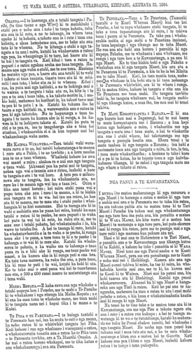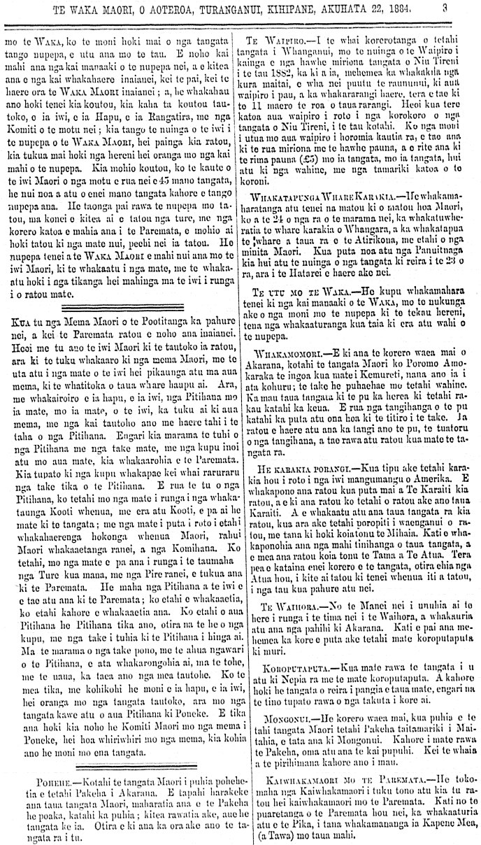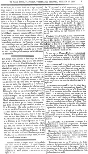 mo te waka, ko te moni hoki mai o nga tangata tango nupepa e utu ana mo te tau. E noho kai mahi ana nga kai manaaki o te nupepa nei, a e kitea ana e nga kai whakahaere inaianei, kei te pai, kei te haere ora te Waka Maori inaianei, a he whakahau ano hoki tenei kia koutou, kia kaha ta koutou tautoko e ia iwi, e ia Hapu, e ia rangatira, me nga Komiti o te motu nei, kia tango to nuinga o te iwi i te nupepa o te Waka Maori, hei painga kia ratou, kia tukua mai hoki nga hereni hei oranga mo nga kai mahi o nupepa. Kia mohio koutou, ko te kaute o te iwi Maori o nga motu e rua nei e 45 mano tangata, he nui noa a atu o enei mano tangata kahore e tango nupepa ana. He taonga pai rawa te nupepa mo tatou ma konei e kitea ai e tatou nga ture, me nga korero katoa e mahia ana i te Paremata, e mohio ai hoki tatou ki nga mate nui peehi nei ia tatou. He nupepa tenei a te Waka Maori e mahi nui ana mo te iwi Maori, ki te whakaatu i nga mate, me te whakaatu hoki i nga tikanga hei mahinga ma te iwi i runga i o ratou mate. Kua tu nga mema maori o te Pootitanga ka pahure nei, a kei te Paremata ratou e noho aua inaianei. Heoi me tu ano te iwi Maori ki te tautoko ia ratou, ara ki te tuku whakaaro ki nga mema Maori me te uta atu i nga mate o te iwi hei pikaunga atu ma aua mema, ki te whatitoka o taua whare haupu ai. Ara, me whakairoiro e ia hapu, e ia iwi, nga Pitihana mo ia mate, mo ia mate, o te iwi ka tuku ai ki aua mema me nga kai tautoho ano me haere tahi i te taha o nga Pitihana. Engari kia marama te tuhi o nga Pitihana me nga take mate, me nga kupu inoi atu mo aua mate, kia whakaarohia e te Paremata. Kia tupato ki nga kupu whakapae kei whai raruraru nga take tika o te Pitihana. E rua te tu o nga Pitihana ko tetahi mo nga mate i runga i nga whaka taunga Kooti whenua, me era atu Kooti e pa ai he mate ki te tangata, me nga mate i puta i roto i etahi whakahaerenga hokonga whenua Maori rahui Maori whakanetanga ranei a nga Komihana. Ko tetahi mo nga mate e pa ana i runga i te taumaha nga Ture kua mana me nga Pire ranei, e tukua ana ki te Paremata. He maha nga Pitihana a te iwi e tae atu ana ki te Paremata, ko etahi e whakaaetia ko etahi kahore e whakaaeria ana. Ko etahi o aua Pitihana he Pitihana tika ano, otira na te he o nga kupu me nga take i tuhia ki te Pitihana i hinga ai. Ma te marama o nga take pono me te ahua ngawari o te Pitihana e ata whakarongohia ai, ma te tohe e te uaua, ka taea ano nga mea tautohe. Ko te mea tika me kohikohi he moni e ia hapu, e ia iwi, hei oranga mo nga tangata tautoko, ara mo nga tangata kawe atu o aua Pitihana ki Poneke. E tika ana hoki kia noho he Komiti Maori mo nga mema i Poneke hei hoa whiriwhiri mo nga mema, kia kohia ano he moni mo ena tangata. POHEHE- Katahi te tangata Maori i puhia pohehetia e tetahi Pakeha i Akarana. E tapahi harakeke aua taua tangata Maori maharatia ana e te pakeha he poaka katahi ka puhia kitea rawatia ake, au he tangata ke ia. Otira e ki ana ka ora ake ano te tangata ra i tu. TE WAIPIRO.- I te whai korerotanga o tetahi tangata i Whanganui, mo te nuinga o te Waipiro i kainga o nga hawhe miriona tangata o Niu Tireni i te tau 1882, ka ki a ia, mehemea ka whakakita nga kura maitai, e wha nei puutu te raununui, ki aua waipiro i pau a ka whakararangi haere, tera e tae ki te 11 maero te roa o taua rarangi. Heoi kua tere katoa aua waipiro i roto i nga korokoro o nga tangata o Niu Tireni, i te tau kotahi. Ko nga moni i utua mo aua waipiro i horomia kautia rak e tae ana ki te rua miriona me te hawhe pauna, a e rite ana ki te rima pauna 4 mo ia tangata mo ia tangata, hui atu ki nga wahine, me nga tamariki katoa o te koroni. WHAKATAPENGA WHARE KARAKIA.- He whakamaharatanga atu tenei na matou ki o matou hoa Maori, ko a te 24 o nga ra o te marama nei, ka whakatuwheratia te whare karakia o Whangara, a ka whakatapua te whare a taua ra e te Atirikona, me etahi o nga minita Maori. Kua puta noa atu nga Panuitanga kia hui atu te nuinga o nga tangata ki reira i te 23 o ra, i te Hatarei e haere ake nei. TE UTU MO TE WAKA.- He kupu whakamahara tenei ki nga kai manaaki o te Waka, mo te nukunga ake o nga moni mo te nupepa ki te tekau hereni, tena nga whakaaturanga jua taia ki era atu wahi o te nupepa. WHAKAMOMORI.- E ki ana te korero waea mai o Akarana kotahi te tangata Maori ko Poromo Amokaraka te ingoa kua mate i Kemureti nana ano ia i ata kohuru, te take he puhaehae mo tetahi wahine. Ka mau taua tangata ki te pu ka herea ki tetahi rakau katahi ka keua. E rua nga tangihanga o te pu katahi ka puta atu ona hoa ki te titiro i te take. Ma ratou e haere atu ana ka tangi ano te pu, te tuatoru o nga tangihana a tae rawa atu ratou kua mate te tangata ra. HE KARAKIA PORANGI.- Kua tipu ake tetahi karakia hou i roto i nga iwi mangumangu o Amerika. E whakapono ana ratou kua puta mai a Te Karaiti kia ratou a e ki ana ratou ko tetahi o ratou ake ano taua Karaiti. A e whakaatu atu ana taua tangata ra kia ratou kua ara ake tetahi poropiti i waenganui o ratou me tana ki hok koia tonu te Mihaia. Kati e whakaponohia ana nga mahi tinihanga o taua tangata, a e mea ana ratou koia tonu te Tama a Te Atua. Tera pea e kataina enei korero e te tangata, otira ehia nga Atua hou i kite ai tatou ki tenei whenua iti a tatou, i nga tau kua pahure atu nei. TE WAIHORA.- No te Manei nei i unuhia ai te here i runga i te tima nei i te Waihora a whakauria atu ana nga pahihi ki Akarana. Kati e pai ana mehemea ka kore e puta ake tetahi mate koroputaputa ki muri. KOHOPUTAPUTA.- Kua mate rawa te tangata i u atu ki Nepia ra me te mate koroputaputa. A kahore hoki he tangata o reira i pangia e taua mate, engari na te tino tupato rawa o nga takuta i kore ai. MONGONUI.- He korero waea mai, kua puhia e te tahi tangata Maori tetahi pakeha taitamariki i Maitahia, e tata ana ki Mongonui. Kahore i mate rawa te pakeha, okma atu ana te kai pupuhi. Kei te whaia a te pirihimana kahore ano i mau. KAIWHAKAMAORI MO TE PAREMATA.- He tokomaha nga Kaiwhakamaori i tuku tono atu kia tu ratou hei kaiwhakamaori mo te Paremata. Kati no te puar