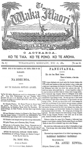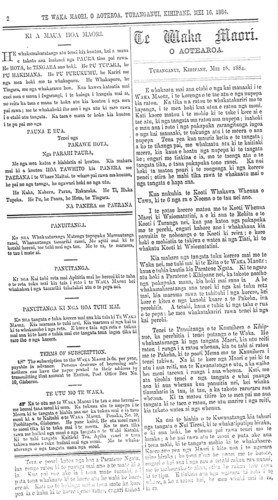 TE WAKA MAORI. Hoea te Waka, ha! O A O T E A R O A. KO TE TIKA. KO TE PONO. KO TE AROHA. NO 3 TURANGANUI, KIHIPANE, MEI 16, 1884. Te utu 6d. HOKO NUI 0 TE TAONGA ME TONA TINI O TE KAKAHU. NA HORI MOA. MO TE MARAMA KOTAHI ANAKE. NO te mea, E hiahia ia au ki te whakawatea i taku Toa, Hei Takotoranga mo nga Taonga, Hou, Ehara mai ana i te marama o Maehe Ko Katoa aku Taonga, ka tukua ki te Hoko mo te utu iti rawa. Ko ia nei etahi o ana Taonga. He kakahu wahine, he kaone wuuru he kaone kara ma, puuru. He kareko ma he kareko hei hiiti. He Pairakete ma, he Paraikete raka, kara, he Paranene. He Peehi moenga, he kori wahine, me tona tino o nga kakahu wahine. Ko enei Kakahu i whatua i te Koroni o Niu Tireni, e nga tino kai hanga kakahu i Kaiapoi, me Rohirena, me Mohikera, nga kainga mahi o aua kai hanga kakahu. He Kakahu i ata hangaia mo nga tane menga taitamariki. He pihi Wuuru, mo te Tarutete, koti, wekoti. He nui atu te Ingarihi, koti, tuira, tarautete mo te tangata pakeke mo te tamariki. He nui ata nga tu kakahu mo te tane kei au. Kai Mahara nga tangata katoa. NO HORI MA. (I mua na Renata) KEI KARATITONE RORI, KIHIPANE. PANUITANGA. Kia aku hoa Maori katoa. Tena ra koutou, e hoa ma. He kupu whakaatu atu tenei naku kia koutou katoa kia mohio mai koutou e kite ana koutou I ahau e noho ona e hoko ma I nga taonga kia koutou i te whare e Wiremu Atea kei Kihipana nei, i enei tau etoru kua pahure ake nei. I tenei kua mutu taku mahi kia ia. A kua tangohia e ahau i te tari tawhito, o te Rihi Roia te whare hoko taonga moku Ki te haere mai nga tangata Maori ki Kihipana ki te hoko me haere mai ratou ki taku whare toa, i te tuatahi ki Matakitaki i nga taonga o roto. He nui nga tahi o taku mahi hoko taonga no reira taku mohiotanga ki nga kakahu me nga taonga o roto. He nui ki tau o taku mahi hoko taonga no reira taku mohiotanga ki nga kakahu me nga taonga e paingia ana e hiahiatia aua e nga tangata katoa. No reira taku kupu kia koutou kia haere mai kia kite aku taonga hou katoa, me hoko i aku taonga, me korero hoki koutou ki a koutou hoa kia haere mai hoki ki te hoko. He taonga pai te taonga utu ngawari, Ko taku whare he toa hoko taonga ki nga tangata Maori me nga tangata Pakeha e rite tona ana ki au raua erua, tetahi ki tetahi kaore te tangata ke. Kahore e tukua ke nama ki te Tangata e hoko ana i nga taonga o tenei whare, ahakoa Pakeha maori ranei, Konei Kaha ai ahau Ki te whakaiti i nga utu aku taonga. Ko etahi tou e tuku nama ana na reira I whakapikia ai nga utu. Tena ko nga utu aku taonga Kahore he take i whakapikia ai. Haere mai nga tangata katoa ki te titiro i nga taonga hou. HAERE MAI, HAERE MAI, HAERE MAI. Na ta koutou hoa NA ARIKI KIWHA. Kihipane, Tihema 5, 1884. ÿ
