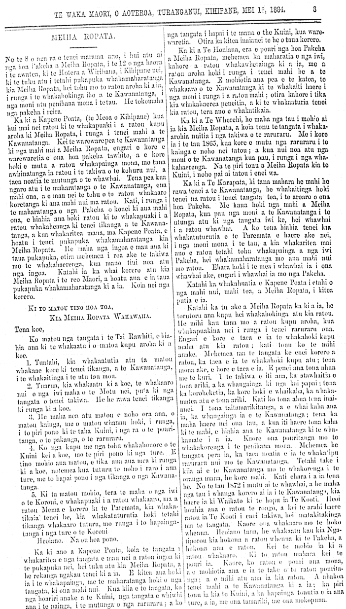 MEIHA ROPATA. No te 8 o nga ra o tenei marama ano, i hui atu ai nga hoa Pakeha a Meiha Ropata, i te 12 o nga haora i te awatea ki te Hoturoa a Wirihana, i Kihipane nei, ki te tuku atu i tetahi pukapuka whakamaharatanga kia Meiha Ropata, hei tohu mo to ratou aroha ki a ia, i runga i te whakahokinga iho a te Kawanatanga, i nga moni utu penihana mona i tetau. He tokomaha nga pakeha i reira. Ka ki a Kapene Poata, (te Meoa o Kihipane) kua hui mai nei matou ki te whakapuaki i a ratou kupu aroha ai Meiha Ropata,, i runga tenei mahi a te Kawanatanga. Kei te wareware pea te Kawanatanga ki nga mahi nui a Meiha Ropata, engari e koro e warewaretia e ona hoa pakeha tawhito a e kore hoki e mutu a ratou whakapainga mona, mo tana awhinatanga ia ratou i te takiwa o to kohuru nui a taea noatia te mutunga o te whawhai. Tena pea kua ngaro atu i te maharatanga o te Kawanatanga ena mahi ona, a e mau nei te tohu o to ratou whakaaro koretanga ki ana mahi nui ma ratou. kati i runga i te maharatanga o nga Pakeha o konei ki ana mahi ona, e hiahia ana hoki ratou ki te whakapuaki i a ratou whakaheanga ki tenei tikanga a te Kawanatanga, a kua whakaritea maua ma Kapene Poata e hoatu i tenei pukapuka whakamaharatanga kia Meiha Ropata. He aha nga ingoa e mau ana ki taua pukapuka otira mehemea i roa ake te takiwa mo te whakahaerenga, kua mano tiui noa atu nga ingoa. Katahi ia ka whai korero atu kia Meiha Ropata i te reo Maori, a hoatu ana e ia taua pukapuka whakamaharatanga ki a ia. Koia nei nga korero. KI TO MATOU TINO HOA TOA, KIA MEIHA ROPATA WAHAWAHA. Tena koe, Ko matou nga tangata i te Tai Rawhiti e hiahia ana ki te whakaatu i o matou kupu aroha ki a koe. 1. Tuatahi kia whakaatutia atu ta matou whakaae kore ki tenei tikanga a te Kawanatanga i te whakaitinga i te utu tau mou. 2. Tuarua, kia whakaatu ki a koe te whakaaro nui o nga iwi maha o te Motu nei, puta ki nga tangata o tenei takiwa. He rawa tenei tikanga ki runga ki a koe. 3. He maha mea atu matou e noho ora ana, o matou kainga me o matou whanau hoki i runga i to piri pono ki te taha Kuini i nga ra o te pouritanga o te pakanga o te raruraru. 4. Ko nga kupu me nga tohu whakahonore o te Kuini kei a koe, mo te piri pono ki nga ture. E tino mohio ana matou e tika ana aua mea ki runga ki a koe, notemea kua tuturu te noho i raro i aua ture, me te hapai pono i nga tikanga o nga Kawanatanga. 5. Ki ai matou mohio tera te maha o nga iwi o te Koroni, e whakapaaki i a ratou whakaaro ma a ratou Mema e korero ki te Paremata, kia whakatikaia tenei he, kia whakatuturutia hoki tetahi tikanga whakaaro tuturu, mo runga i to hapaingatanga i nga ture o te Koroni. Heoi ano. Na ou hoa pono. Ka ki ano a Kapene Poata koia te tangata i whakaritea e nga tangata e mau nei a ratou ingoa ki te pukapuka nei, hei tuku atu kia Meiha Ropata, a he rekanga ngakau tenei ki a ia. E kitea ana hoki ia i te whakapainga, me te maharatanga hoki o nga tangata ki ona mahi nui. Kua kiia e te tangata, ko nga hoariri anake a te Kuini nga tangata e whiwhi ana i te painga, i te mutunga o nga raruraru, a ko nga tangata I mipai I te numa e the Kuini, kua warewaretia. Otira ka kitea inainei te he taua korero. Ka ki a Te Honiana, era e pouri nga hoa Pakeha a Meiha Ropata, mehemea ka maharatia e nga iwi, kahore a ratou whakawhetaina ki a ia, me a ratou aroha hoki runga i tenei mahi he a te Kawanatanga. E mohiotia ana pea e te katoa, te whakaaro o te Kawanatanga ki te whakiti haere i nga moni i runga i a ratou mahi otira kahore i tika kia whakahaerea penetia, a ki te whakaaturia tenei kia ratou, tera ano e whakatikaia. Ka ki a Te Wherehi te maha nga tau i mohio ai ia kia Meiha Ropata, a koia tonu te e tangata i whakaarohia nuitia i nga takiwa o te raruraru. Me i kore ai i te tau 1865,kua kore e mutu nga raruraru i te kainga e noho nei tatou, a kua nui noa atu nga moni o te Kawanatanga kua pau, i runga i nga whakahaerenga, Na te piri tonu a Meiha Ropata kia te Kuini, i noho pai ai tatou i enei wa. Ka ki a Te Karapata, ki tana mahara he mahi he rawa tenei a te Kawanatanga, he whakaitinga hoki tenei na ratou i tenei tangata toa, i te aroaro o ona hoa Pakeha. Me kaua hoki nga mahi a Meiha Ropata, kua pau nga moni a te Kawanatanga i te utunga atu ki nga tangata iwi ke, hei whawhai i a ratou whawhai. A ko tona hiahia tenei kia whakatuturutia e te Paremata e haere ake nei, i nga moni mona i te tau, a kia whakaritea mai ano e ratou tetahi tohu whakapainga a nga iwi Pakeha, hei whakamaharatanga mo ana mahi nui mo ratou. Ehara hoki i te mea i whawhai ia i ona whawhai ake, engari i whawhai ia mo nga Pakeha. Katahi ka whakahuatia e Kapene Poata i etahi o nga mahi nui, mahi toa, a Meiha Ropata, i kitea putia e ia. Katahi ka tu ake a Meiha Ropata ka ki a ia he torutoru ana kupu hei whakahokinga atu kia ratou. He mihi kau tana mo a ratou kupu aroha, kua whakapuakina nei i runga i tenei raruraru ona. Engari e kore e taea e ia te whakahoki kupu maha atu kia ratou, kati tonu ko te mihi anake. Mehemea ma te tangata ke enei korero a ratou, ka taea e ia te whakahoki kupu atu, tena mona ake, e kore e taea e ia. E penei ana tona ahua me te kuri. I te takiwa e iti ana, ka atawhaitia e tona ariki, a ka whangainga ki nga kai paipa, tena ka koroheketia, ka kore hoki e whaikaha, ka whakamatea atu e tona ariki. Kati ko tona ahua tona inainei. I tona taitamarikitanga, a e whai kaha ana ia, ka whangainga ia e te Kawanatanga, tena ka maha haere nei ona tau, a kua iti haere tona kaha ki te mahi, e hiahia ana te Kawanatanga ki te whakamate i a ia. Kaore ona pouritanga mo te whakakorenga i te perihana mona. Mehemea he tangata pera ia, ka taea noatia e ia te whakatipu raruraru nui mo te Kawanatanga. Tetahi take i kiia ai e te Kawanatanga mo te whakorenga i te oranga mana, he kore mahi. Kati ehara i a ia tena he. No te tau 1872 i mutu ai te whawhai, a he maha nga tau i whanga korero ai ia i te Kawanatanga, kia haere ia ki Waikato ki te hopu ia Te Kooti. Heoi houhia ana e ratou te rongo a kei te arahi haere ratou ia Te Kooti i enei takiwa, hei matakitak
