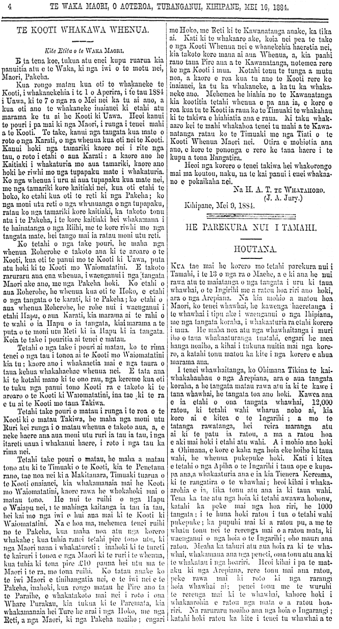 TE KOOTI WHAKAWA WHENUA. Kite Etita o te Waka Maori. E ta tena koe, tukua atu enei kupu ruarua kia panuitia atu e to Waka, ki nga iwi o te motu nei, Maori, Pakeha. Kua rongo matau kua oti te whakaneke te Kooti i whakanekehia te 1 o Aperira i te tau 1884 i Uawa ki te 7 o nga ra o Mei nei ka tu ai ano a kua oti ano te whakaneke inainei ki etahi atu marama ke tu ai he Kooti ki Uawa. Heoi kanui te pouri i pa mai ki nga maori i runga i tenei mahi a te Kooti. Te take kanui nga tangata kua mate o roto o nga Karati, e nga whenua kua oti nei te Kooti. Kanui hoki nga tamariki kaore nei i rite nga tau, o roto i etahi o aua Karati, e kaore ano he Kaitiaki i whakaturia mo aua tamariki, kaore ano hoki te riwhi mo nga tupapaku mate i whakaturia. Ko nga whenua i ora ai aua tupapaku kua mate nea me nga tamariki kore kaitiaki nei, kua oti etahi te hoko, ko etahi ka oti te reti ki nga Pakeha he nga moni utu reti o nga whanaunga o nga tupapaku, ratau he nga tamariki kore kaitiaki, ka takoto tonu atu i te Pakeha, i te kore kaitiaki hei whakamana i te hainatanga o nga Riihi he te kore riwhi mo nga tangata mate, hei tango mai ia ratou moni utu reti. Ko tetahi o nga take pouri he mana nga whenua Roherohe e takoto ana ki te aroaro o te Kooti kua oti te panui mo te Kooti ki Uawa, puta atu hoki ki te Kooti Waiomatatini. E takoto raruraru a ena whenua i waenganui i nga tangata Maori ake ano me nga Pakeha hoki, Ko etahi o a Roherohe he whenua kua oti te Hoko, e etahi e tangata o te karau, ki te Pakeha, tautahi o ana whenua Roherohe, he rohe nui i waenganui i etahi Hapu, o aua karati, kia marama ai te rahi o te wahi o ia hapu o ia tangata, kiaimarama a to puta o te moni utu Reti ki ia Hapu ki ia tangata. Koia te take i pouritia ai tenei e matau. Tetahi o nga take i pouri ai matau ki te rima tenei o nga tau tonoa ai te Kooti mo Waiomatatini kia tu kaore ano i whakaaetia mai e nga taura o taua kehua whakahaehae whenua nei. E tata ana ki te kotahi mano ki te ono rau, nga kereme kua oti te tuku nga panui tono Kooti ra e takoto ki te aroaro o te Kooti ki Waiomatatini, ina tae ki te ra e tu ai te Kooti mo taua takiwa. Tetahi take pouri e matau runga i te roa e to Kooti ki o matau takiwa te maha nga moni utu Rori kei runga i o matau whenua e takoto ana a, e neke haere ana aua moni utu run ia tau ia tau i nga itareti nana, i whakanui haere i roto i nga tau ka rima nei. Tetahi take pouri o Matau, he maha a matau tono atu ki te Tangata o te Kooti kia te Pehetana rano tae noa nei kia Makitanara, Timuaki tuarua o te Kooti onaianei, kia whakamanaia mai he Kooti mo Waiomatatini, kaore rawa he whakahoki mai o matau tono. He nui te ruihi o nga hapu o Waiapu nei i te mahinga kaitanga ia tau ia tau hei kai mo nga iwi e hui ana mai ki te Kooti ki Waiomatatini. Na e hoa ma, mehemea tenei ruihi no te Pakeha kua maha noa atu nga korero whakahe, kua tuhia ranei tetahi pire tono utu, ki nga maori nana i whakatureti, inahoki ki te tureti te kairuri i tonoa e nga Maori ki te ruri i te whenua, kua tuhia ki tona pire 10 pauna hei utu ma te Maori i te ra me tona ruihi. Ko tatau anake ko te iwi Maori o tinihangatia nei, e te iwi nei e te Pakeha, inahoki, kuka rongo matau he Pire ano ta to Paraihe, e whakatakoto mai nei i roto i ona Whare Purakau, kia tukua ki te Paremata, kia whakamanaia hei Ture he arai i nga Hoko me nga Reti, a nga Maori, ki nga Pakeha noaiho, engari mo Hoko, me Reti ki te Kawanatanga anake ka tika ai. Kati ki te whakaaro ake, koia nei pea te take o nga Kooti whenua nei e whanekehia haeretia nei, kia tukoto kore mana ai aua Whenua, a kia paahi rano taua Pire ana te Kawanatanga notemea rere ke nga Kooti i mua. Kotahi tonu te tunga a mutu noa, e kaore e roa kua tu ano te Kooti rere ka inaianei, ka tu ka whakaneke, a ka tu ka whakaneke ano. Mehemea he hiahia no te Kawanatanga kia kootitia tetahi whea e pai ana ia, e kore e roa kua tu te Kooti ia raua ko te Timuaki te whakahau ki te takiwa e hiahiatia ana e raua. Ki taku whakaaro kei te mahi whakahoa tenei tu mahi a te Kawanatanga ratau ko te Timuaki me nga Tiati o te Kooti Whenua Maori nei. Otira e mohiotia ana ano, e kore te pononga e rere ke tana haere i te kupu a tona Rangatira. Heoi nga korero o tenei takiwa hei whakarongo mai ma koutou naku, na te kai panui i enei whakaano e pokaikaha nei. NA H. A. T. TE WHATAHORO. (J. A. Jury) Kihipane, Mei 9, 1884. HE PAREKURA NUI I TAMAHI. HOUTANA Kua tae mai he korero mo tetahi parekura nui i Tamahi, i te 13 o nga ra e Maehe a e ki ana he nui rawa atu te maiatanga o nga tangata i uru ki taua whawhai o te Ingirihi me a ratou hoa riri ano hoki, ara o nga Arepiana. Na kia mohio a matou hoa Maori, ko tenei whawhai, he kawenga haeretanga i te whawhai i tipu ake i waenganui o nga Ihipiana, me nga tangata koraha, i whakauturia ra etahi korero i mua. He maha noa atu nga whawhaitanga i muri iho o taua whakaaturanga tuatahi, engari he mea hanga noaiho, a kihai i tukuna nuitia mai nga korero a katahi tonu matou ka kite i nga korero e ahua marama ana. I tenei whawhaitanga, ko Ohimana Tikina te kaiwhakahauhau o nga Arepiana, ara o aua tangata koraha, a he tangata matau rawa atu ia ki te kawe i tana whawhai, he tangata toa ano hoki. Kawea ana o ia etahi o ona tangata whawhai 12,000 ratou ki tetahi wahi wharua noho ai kia kore ai e kitea e te Ingarihi, a mo te tatanga rawatanga, hei reira maranga atu ai ki te patu ia ratou, e ma a ratou hoa e aki mahi hoki i etahi atu wahi. A i mohio ana hoki a Ohimana, e kore e kaha nga hoia eke hoiho ki taua wahi he whenua pukapuke hoki. Kati i kitea tetahi o nga Apiha o te Ingarihi i taua ope e kupapa ana whakaaturia ana e ia kia Tienera Kereama, ki te rangaitira o te whawhai, heoi kihai i whakaarohia e ia tika tonu atu ana ia ki taua wahi. Tena ka tae atu nga hoia ki tetahi awaawa hohonu, katahi ka peke mai nga hoa riri, he 1000 tangata, i te huna hoki ratou i tua o tetahi wahi pukepuke, ka pupuhi mai ki a ratou pu, a me te whata tonu nei te rerenga mai o a ratou mata, ki waenganui o nga hoia o te Ingarihi, oho maur