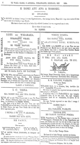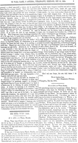 porangi a whati ana etahi o ratou, me te pupuhi haere ano ki a ratou hoarir. Tena ano nga hera mano manuao me a ratou parepo mo taua whawhai, i manatak hoki nga kaitiaki o aua pu, ki to pupuhi atu, kei mate tahi a ratou hoa me te hoariri, notemea i huihuia katoatia ratou i roto i te whawhai. A no te kitenga o nga Arepiana i aua tangata ra e tiaki kau ana i nga purepo, katahi ka akiua atu e ratou aua tangata, a riro atu ana te hoa riri nga purepo. No te kitenga hoki o nga hoia e kore e tika, kia pupuhi tonu ratou i a ratou pu, i te mea e whawhai huihui tonu ana ratou, nga hoia me nga hoariri, katahi ka tahuri ki te werowero ki nga peneti, ki te kuru atu hoki ki nga raparapa o nga pu. Heoi hinga ana taua timatanga whawhai ra o 55 nga hoia a i mate katoa a ratou apiha, me etahi hoki o nga rangatira nui o te whawhai. Ka kite te rangatira o nga hei. eke hoiho i te ahua te whawhai, katahi ka whakahaua e ia ona tangata kia haere atu hoki ratou ki te awhina i a ratou hoa. Engari nui atu te kino o taua wahi hei haerenga mo nga hoiho. Ahakoa ra, no te kitenga o nga Arepiana i taua ope nui kua tae mai ki te tautoko i a ratou hoa koia, katahi ratou ka whati a matara haere ana i runga hiwi, a te taea e nga hoiho te whai i a ratou i runga i taua whenua kino, ka makere ki te whenua nei kai eke, ka tahuri ki te pupuhi haere i aua tangata. A no te putanga mai a tetahi atu ropu hoia, katahi ka whaia haeretia e ratou te hoa riri, patupatua haeretia ana, a tae noa atu ki to ratou pa ki Tamahi, a tahutahua ana ta ratou pa e nga hoia ki te ahi. Kati e whai tonu nga haora e whawhai ana ki mua i to te awatea i mutu ai a ka haere nga hoia ki te tirotiro i nga tangata i hinga i te parekura. Tatauria ana e ratou e 4000 nga tupapaku o te hoariri, a e whakaarohia ana e 5000 hoki nga mea taotu. Ko nga tupapaku o te Ingirihi 120 e 99 hoki nga mea taotu. He iwi kino rawa atu ano hoki te Arepiana ki te whawhai, e kore hoki e tohunga e ratou nga tangata hinga i te parekura, engari i te kitenga i nga hoariri kua tu i te pu, ka motu ranei i te hoari, e takoto ana ki te whenua, ka patua kohurutia e ratou. A tetahi i te mutunga o te whawhai ina haere atu nga hoia o te Ingarihi ki te tirotiro i nga tangata i hinga i te whawhaitanga, ki te kawe mai hoki i nga mea e ora ana ki te haki, ka takoto marire nga Arepiana, kia maharatia ai e nga hoia kua hemo rawa atu ratou, a kia tata rawa atu nga hoia, katahi ka okaina mai ratou, ka werohia ranei ki te matia, e nga tangata i haere atu na ratou ki te tetahi wai mana, a no te kawenga atu e tetahi o nga hoia i te wai hei inumanga mona, katahi ka werohia mai e taua tangata kia mate tona kai atawhai. Koia i whakaritea ai taua iwi ki te wuruhi riri kino. HE RETA TUKU MAI. Ki te Etita o te Waka Maori. E hoa, Tena koe, utaina atu nga toru kupu nei ki te ihu o to tatou Waka, ki a hohoro ai ona kai hoe te maka atu ki tahaki, ki nga awa hei unga atu mona, ki nga wahi ranei e karanga mai ana kia u atu ia ki reira. Koia nei aua kupu. E hoa ma i te motu katoa Maori, Pakeha me ara atu wahi o te ao, he tino whakaaro no roto i a au, e whakaatu ana kia kite iho koutou. I enei tau ka pahure ake nei, i roto i nga tangata o tenei taha o te motu nei, i te raruraru e haere ana, ara o te Tairawhiti nei, ko te putake i tupu ai taua raruraru, na to kuri ngau tangata i arahina mai nei e o tatau hoa Pakeha ki tenei motu, kaore nei nga wahi katoa i hapa te noho e tana kuri, ko nga wahi tangata kore anake, ko tona waha anake i haere atu ki to ngau i aua wahi tangata kore. E rua ona mea i ngau ai, he tangata he whenua, koia nei i tika ai te whakatau ki enei mate tangata, mate whenua. Ko taua kuri hoki he Waipiro ko tana mahi hoki he ngengere tonu, ia po, ia ra, ia marama, ia tau, kaore tona waha e whango. Ko tana wai hoki he hinu popo no te mahuna o te Rewera, koia nei te hangai tanga o te kupu a Pita, kia mataara kia mata popohe, kei te haereere hoki to koutou hoa whawhai te Rewera, ano he ruiona tangi e ngengere ana, e rapu ana i te tangata kia horomia e ia, 1 Pita 5,8. Na konei i whakapouri nga whakaaro, i matara mai a i te oranga o te Atua. Epeha 4, 18. Ko tenei e hoa ma, kua hoki mai nga whakaaro o nga tangata o te Tairawhiti nei ki runga ki te rangimariretanga inainei, ara kua whakaputaia te uaua ki te mahi i nga mahi tika, e whiwhi ai te tangata ki nga hua o te whakapono i roto ia te Karaiti. E ki ana a Hemi, Hemi 2, 20. Ki te kore he mahi, he mea mate te whakapono. I te tau o to tatou Ariki, 1883, ka timata te haunga whare karakia, ki nga kainga kaore he whare karakia, mo te whakahou ano i nga whare tahito. Ka timata atu i Turanganui o Kiwa, ki Patangata, kei te mahi, kua oti etahi, ko tahi kai Whangara, kua oti, ko tahi kai Waipare, ko tahi kai Tokomaru ko tahi kai Waipiro, ko tahi kai Akuaku, kua Kawaia tera, ko tahi kai Reporua, ko tahi kai Ti. He whare hou katoa enei, haunga nga whare tawhito kua whakahoutia, maha atu i enei. E toru whare karakia i roto i te Pariha kotahi e rua i roto i tetahi, ara i roto i te takiwa kua whakahuatia i runga ake nei. Heoi nei ana kupu, kia ora tahi tatau i te Atua. Na to koutou hoa, REV. KEREHONA PIWAKA. Whangara, Mei 10, 1884. Ki te Etita o te Waka Maori. He panuitanga tenei no te matenga o Hone Kewa o Turanga, tona hapu ko Teitanga a Mahaki. He tangata pai ia ki te tangata, he aroha nui ki nga Pakeha ki nga Maori. Ko ona marama i takoto ai i tona mate, tekau ma tahi. I te tekau ma waru o nga ra ka mutu te manaakitanga a te Wairua o te Ariki, Atua o tona papa, ka puta ona whakaaro notemea kua pouri ia. Ka puaki tana kupu kia Tiopira Tawhiao. E hoa, tonoa atu nga tangata e noho tata ana, kia haere mai ki konei, kia rongo i taku kupu. E hoa, kua pouri au, a whea te ratapu. A tahi ra ka whakahokia mai e ia he waiata. Whakatau rawa iho te mauri, rangarangai ana kia whakatika, kia tae au kia whakakorea mai e koe i te ahiahi kia werohia mai ki te tao, ta rawa ki taku ate i. No te 20 o nga ra, ka puta ano tana kupu kia Tiopira Tawhiao. E hoa, kawea mai aku tamariki ki toku t