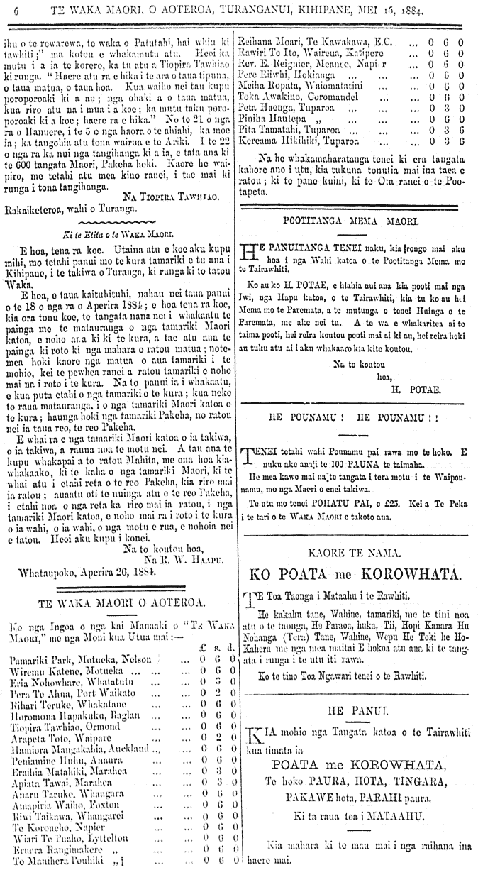 ihu o te rewarewa te waka o Patutahi, hai whiu ki tawhiti, ma kotou e whakamutu atu. Heoi ka mutu i a ia to korero, ka tu atu a Tiopira Tawhiao ki runga, haere atu ra e hika i te ara o taua tipuna, o taua matua, o taua hoa. Kua waiho nei tau kupu poroporoaki ki a au, nga ohaki a o taua matua, kua riro atu na i mua i a koe, ka mutu taku poroporoaki ki a koe, haere ra e hika. No te 21 o nga ra o Hanuere i te 5 o nga haora o te ahiahi, ka moe ia, ka tangohia atu tona wairua e te Ariki. I te 22 o nga ra ka nui nga tangihanga ki a ia, e tata ana ki te 600 tangata Maori Pakeha hoki. Kaore he waipiro me tetahi atu mea kino ranei, i tae mai ki runga i tona tangihanga. NA TIOPIRA TAWHIAO. Rakaiketeroa, wahi o Turanga. Ki te Etita o te Waka Maori. E hoa, tena ra koe. Utaina atu e koe aku kupu mihi mo tetahi panui mo te kura tamariki e tu ana i Kihipane, i te takiwa Turanga ki runga ki te tatou Waka. E hoa, o taua kaituhituhi ahau nei tana panui o te 18 o nga ra o Aperira, 1884, o hoa tena ra koe, kia ora tonu koe, te tangata nana nei i whakaatu to kainga mo te matauranga o nga tamariki Maori katoa, e noho ana ki ki te kura, a tae atu ana te painga ki roto ki nga mahara o ratou matua, notemea hoki kahoreK nga matua a tamariki i te mohio kei te pewhea ranei a ratou tamariki e noho mai na i roto i te kura. Na te panui ia i whakaatu, o kua puta etahi o nga tamariki a te kura, kua neke te ra matauranga i o nga tamariki Maori katoa o te kura haunga hoki nga tamariki Pakeha, no ratou nei ia taua reo te reo Pakeha. E whai ra e nga tamariki Maori katoa e ia takiwa, o ia takiwa, a rauna noa te motu nei. A tau ana te kupu whakapai ai to ratou Mahita, me ona hoa kia whakaako, ki te kaha o nga tamariki Maori ki to whai atu i etahi reta o te reo Pakeha, kia riro mai ta ratou auaatu oti te nuinga atu o te reo Pakeha, i etahi noa e nga reta ka riro mai ta ratou i nga tamariki Maori katoa, e noho mai ra i roto i te kura o ia wahi, o ia wahi, o nga motu e rua, e nohoia nei e tatou. Heoi aku kupu i konei. Na to koutou hoa, Na R.W.HAAPU. Whataupoko Aperira 26, 1884. TE WAKA MAORI O AOTEROA. Ko nga ingoa o nga kai Manaaki o Te Waka Maori me nga moni kua utua mai;- Pamariki Park, Motueka, Nelson Wiremu Katene, Motueka Eria Nohowhare, Whatatutu Pera Te Ahua, Port Waikato Rihari Teruke, Whakatane Horomona Hapakuku, Raglan Tiopira Tawhiao, Ormond Arapeta Toto, Waipare Hamiora Mangakahia, Auckland Peniamine Huhu, Anaura Eraihia Matahiki, Marahea Apiata Tawai, Marahea Anaru Taruke, Whangara Amapiria Waiho, Foxton Riwi Taikawa, Whangarei Te Koroneho, Napier Wiari Te Puaho, Lyttelton Eruera Rangimakere, Lyttelton Te Manihera Pouhiki, Lyttelton Reihana Moari, Te Kawakawa, E.C Rawiri Te Ito, Waireua, Katipere Rev. E. Reignier, Meanee, Napier Pero Riiwhi, Hokianga Meiha Ropata, Waiomatatini Toka Awakino, Coromandel Peta Haenga, Tuparoa Piniha Hautepa, Tuparoa Pita Tamatahi, Tuparoa Kereama Hikihiki, Tuparoa Na he whakamaharatanga tenei ki era tangata kahore ano i utu, kia tukuna tonutia mai ina taea e ratou, ki te pane kuini ki te Ota ranei e te Pootapeta. POOTITANGA MEMA MAORI. HE PANUITANGA TENEI naku, kia rongo mai aku hoa i nga wahi katoa, e te Pootitanga Mema mo te Tarawhiti. Ko au ko H. Potae, e hiahia nui ana kia pooti mai nga iwi nga Hapu katoa, o te Tairawhiti, kia tu ko au hei Mema mo te Paromata, a te mutunga o tenei Huinga o te Paremata, me ake nei tu. A te wa e whakaritea ai te taima pooti, hei reira koutou pooti mai ai ki au, hei reira hoki au tuku atu ai i aku whakaaro kia kite koutou. Na to koutou hoa, H. POTAE. HE POUNAMU HE POUNAMU Tenei tetahi wahi Pounamu pai rawa mo te hoko. E nuku ake anake te 100 pauna te taimaha. He mea kawe mai na te tangata i tera motu i te Waipounamu mo nga Maori o enei takiwa. Te utu mo tenei Pohatu Pai, e 25,. Kei a Te Peka i te tari o te Waka Maori e takoto ana. KAORE TE NAMA. KO POATA me KOROWHATA. Te Toa Taonga i Mataahu i te Rawhiti He kakahu tane, wahine, tamariki, me te tini noa atu o te taonga, he paraoa, huka, tii, hopi kauara, Hu nohonga (tera) tane, wahine, wepu he toki he Hokaheru me nga mea maitai. E hokoa atu ana ki te tangata i runga i te utu iti rawa. Ko te tino Toa Ngawari tenei o te Rawhiti. HE PANUI. Kia mohio nga Tangata katoa o te Tairawhiti kua timata ia POATA ME KOROWHATA, Te hoko PAURA, HOTA, TINGARA, PAKAWE hota, PARAHI paura. Ki ta raua toa i MATAAHU. Kia mahara ki te mau mai i nga raihana ina haere mai. ÿ