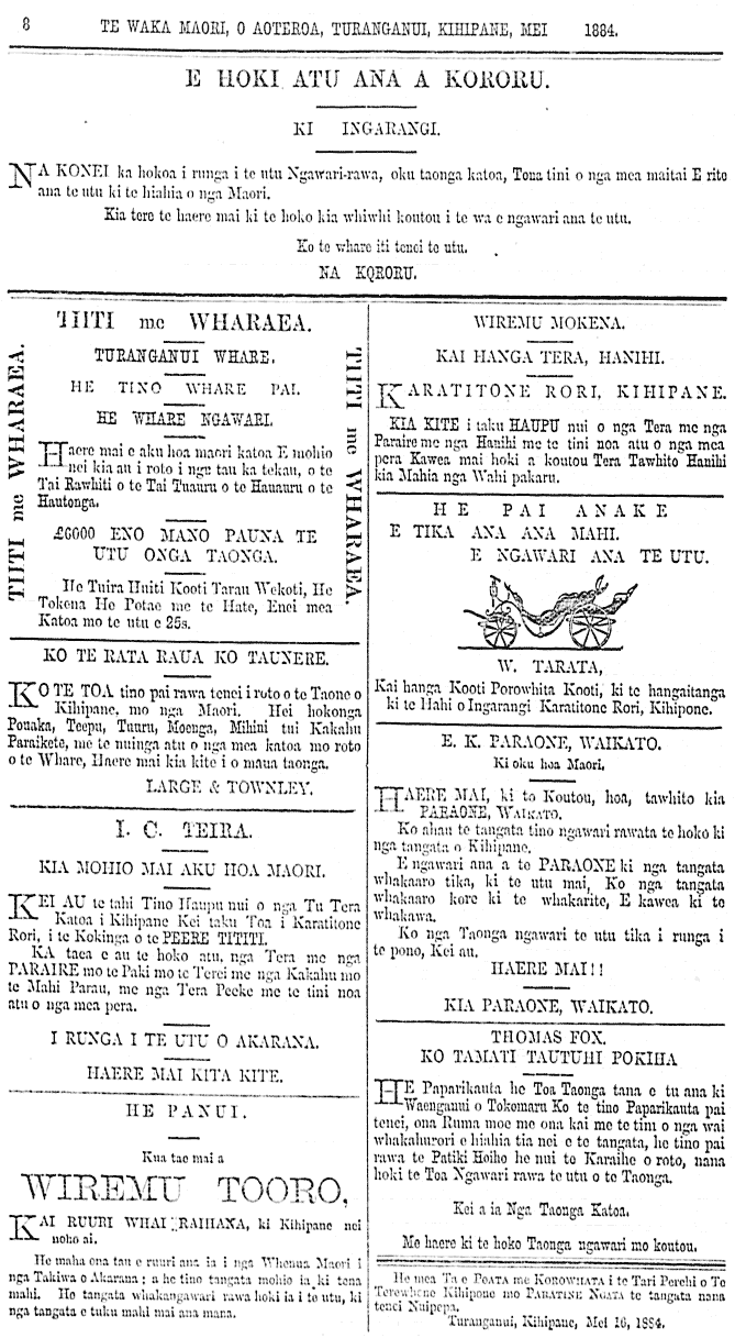 E HOKI ATU ANA A KORORU. KI INGARANGI. NA KONEI ka hokoa i runga i te utu Ngawari rawa, oku taonga katoa Tona tini o nga mea maitai, E rite ana te utu ki te hiahia e nga Maori. Kia tere te haere mai ki te hoko kia whiwhi koutou i te wa e ngawari ana te utu. Ko te whare ai tenei te utu. NA KORORU. TIITI me WHARAEA. TURANGANUI WHARE HE TNO WHARE PAI HE WHARE NGAWARI. Haere mai e aku hoa maori katoa E mohio nei kia au i roto i nga tau ka tekau o te a Tai Rawhiti o te Tai Tuauru o te Hauauru o te Hautonga. ENO MANO PAUNA TE UTU ONGA TAONGA. He Tuira Huiti Kooti Tarau Wekoti, He Tokena. He Potae me te Hate, Enei mea Katoa mo te utu e 25s. KO TE RATA RAUA KO TONORE. Ko te toa tino pai rawa tenei rute o te Taone o Kihipane mo nga Maori. Hei hokonga Pouaka, Teepu, Tuuru, Moenga, Mihini tui Kakahu, Paraikete, me te nui nga atu o nga mea katoa mo roto o te Whare, Haere mai kia kite i o maua taonga. LARGE & TOWNLEY I. C. TEIRA. KIA MOHIO MAI AKU HOA MAORI. Kei au te tahi Tino Haupu nui o nga Tu Tera Katoa i Kihipane Kei taku Tera i Karatitone Rori, i te Kokinga o te PEERE TITITI. Ka taea e au te hoko atu nga Tera me nga PARAIRE mo te Paki mo te Terei me nga Kakahu mo te mahi Parau, me nga Tera Peeke me te tini noa atu i nga mea pera. I RUNGA I TE UTU O AKARANA. HAERE MAI KITA KITE. THOMAS FOX. KO TAMATI TAITUHI POKIHA HE Paparikauta he Toa Taonga tana e tu ana ki Waenganui o Tokomaru Ko te tino Paparikauta Pai tenei, ona Ruma moe me ona kai me te tini o nga wai whakahurori hiahia tia nei e te tangata, te tino pai rawa te Patiki Hoiho he nui te Karaihe o roto, nana hoki te Toa Ngawari rawa te utu o te Taonga. Kei a ia Nga taonga Katoa. Me haere ki te hoko Taonga ngawari mo koutou. WIREMU MOKENA. KAI HANGA TERA, HANIHI. Haere mai ki te Whare whero (te Pei) Karatitone Rori, Kihipane. Kia kite i taku haupu nui o nga Tera me nga Paraire me nga Haihi me te tini noa atu o nga mea pera Kawea mai hoki a koutou Tera Tawhito Hanihi kia Mahia nga Wahi pakaru. HE PAI ANAKE E TIKA ANA ANA MAHI. E NGAWARI ANA TE UTU. W. TARATA KAI hanga Kooti Porowhita Kooti ki te hangaitanga kite Hahi o Ingarangi Karatitone Rori, Kihipone. E K PARONE WAIKATO. Ki oku hoa Maori Haere mai ki to Koutou, hoa, tawhito kia PARAONE, Waikato. Ko ahau te tangata tino ngawari rawata te hoko ki nga tangata o Kihipane. E ngawari ana a te Paraone ki nga tangata whakaaro tika, ki te utu mai, Ko nga tangata whakaaro kore ki te whakarite, E kawea ki te whakawa. Ko nga Taonga ngawari te utu tika i runga i te pono, Kei au. HAERE MAI! KIA PARAONE, WAIKATO. THOMAS FOX. KO TAMATI TAUTUHI POKIHA He Paparikauta he toa taonga tana e tu ana ki waenganui o Tokomaru. Ko te tino Paparikauta pai tenei, ona Ruma moe me ona kai me te tini o nga wai whakahurori e hiahia tia nei e te tangata, he tino pai rawa te Patiki hoiho he nui te Karaihe o roto, nana hoki te Toa Ngawari rawa te utu o te Taonga. Kei a ia Nga taonga Katoa. Me haere ki te hoko Taonga ngawari mo koutou. He mea Ta e Poata me Korowhata i te Tari Perehi o Te Terewhene Kihipane mo Paratine Ngata te tangata nana tenei Nuipepa. Turanganui, Kihipane, Mei 16, 1884. ÿ