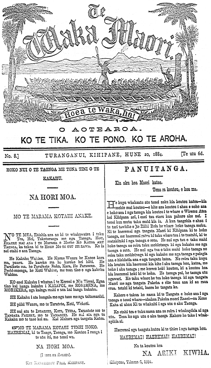 TE WAKA MAORI. Hoea te Waka, ha! O A O T E A R O A. KO TE TIKA. KO TE PONO. KO TE AROHA. NO 8 TURANGANUI, KIHIPANE, HUNE 20, 1884. Te utu 6d. HOKO NUI 0 TE TAONGA ME TONA TINI O TE KAKAHU. NA HORI MOA. MO TE MARAMA KOTAHI ANAKE. NO te mea, E hiahia ia au ki te whakawatea i taku Toa, Hei Takotoranga mo nga Taonga, Hou, Ehara mai ana i te marama o Maehe Ko Katoa aku Taonga, ka tukua ki te Hoko mo te utu iti rawa. Ko ia nei etahi o ana Taonga. He kakahu wahine, he kaone wuuru he kaone kara ma, puuru. He kareko ma he kareko hei hiiti. He Pairakete ma, he Paraikete raka, kara, he Paranene. He Peehi moenga, he kori wahine, me tona tino o nga kakahu wahine. Ko enei Kakahu i whatua i te Koroni o Niu Tireni, e nga tino kai hanga kakahu i Kaiapoi, me Rohirena, me Mohikera, nga kainga mahi o aua kai hanga kakahu. He Kakahu i ata hangaia mo nga tane menga taitamariki. He pihi Wuuru, mo te Tarutete, koti, wekoti. He nui atu te Ingarihi, koti, tuira, tarautete mo te tangata pakeke mo te tamariki. He nui ata nga tu kakahu mo te tane kei au. Kai Mahara nga tangata katoa. NO HORI MA. (I mua na Renata) KEI KARATITONE RORI, KIHIPANE. PANUITANGA. Kia aku hoa Maori katoa. Tena ra koutou, e hoa ma. He kupu whakaatu atu tenei naku kia koutou katoa kia mohio mai koutou e kite ana koutou I ahau e noho ona e hoko ma I nga taonga kia koutou i te whare e Wiremu Atea kei Kihipana nei, i enei tau etoru kua pahure ake nei. I tenei kua mutu taku mahi kia ia. A kua tangohia e ahau i te tari tawhito, o te Rihi Roia te whare hoko taonga moku Ki te haere mai nga tangata Maori ki Kihipana ki te hoko me haere mai ratou ki taku whare toa, i te tuatahi ki Matakitaki i nga taonga o roto. He nui nga tahi o taku mahi hoko taonga no reira taku mohiotanga ki nga kakahu me nga taonga o roto. He nui ki tau o taku mahi hoko taonga no reira taku mohiotanga ki nga kakahu me nga taonga e paingia ana e hiahiatia aua e nga tangata katoa. No reira taku kupu kia koutou kia haere mai kia kite aku taonga hou katoa, me hoko i aku taonga, me korero hoki koutou ki a koutou hoa kia haere mai hoki ki te hoko. He taonga pai te taonga utu ngawari, Ko taku whare he toa hoko taonga ki nga tangata Maori me nga tangata Pakeha e rite tona ana ki au raua erua, tetahi ki tetahi kaore te tangata ke. Kahore e tukua ke nama ki te Tangata e hoko ana i nga taonga o tenei whare, ahakoa Pakeha maori ranei, Konei Kaha ai ahau Ki te whakaiti i nga utu aku taonga. Ko etahi tou e tuku nama ana na reira I whakapikia ai nga utu. Tena ko nga utu aku taonga Kahore he take i whakapikia ai. Haere mai nga tangata katoa ki te titiro i nga taonga hou. HAERE MAI, HAERE MAI, HAERE MAI. Na ta koutou hoa NA ARIKI KIWHA. Kihipane, Tihema 5, 1884. ÿ