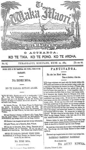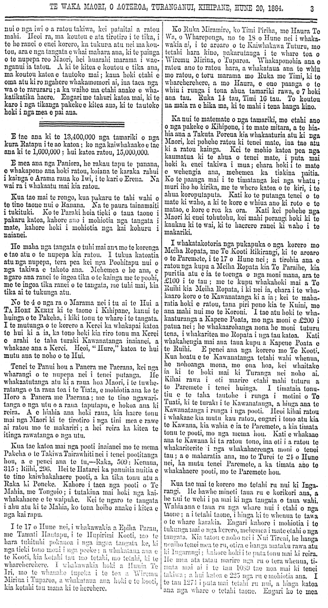 nui e nga iwi e a ratou takiwa, kei pataitai a ratou mahi. Heoi ra ma koutou e ata tirotiro i te tika i te he ranei a enei korero, ka tukuna atu nei uta koutou ara e nga tangata e whai mahara ana ki te painga o te nupepa reo Maori hei huarahi marama i waenganui ia tatou. A ki te kitea e koutou e tika ana, ma koutou katoa e tautoko mai, kaua hoki etahi a oma atu ki ro ngahere whakamomori ai ina taea nga wa e te raruraru, a ka waiho ma etahi anake e whakatikatika haere. Engari me tahuri katoa mai ki to karo i nga tikanga pakeke e kitea ana ki te tautoko hoki i nga mea e e pai ana. E tae ana ki te 13,400,000 nga tamariki o nga kura Ratapu i te ao katoa, ko nga kaiwhakaako e tae ana ki te 1,600,000, hui katoa ratou, 15,000,000. E mea ana nga Paniora, te rakau tapu to panaua e whakapono ana hoki ratou koia a te karaka rahui i kainga a Arama raua ko Iwi, i te kari o Erena. Na wai ra i whakaatu mai kia ratou. Kua tae mai te rongo kua pakaru te tahi wahi e te tino taone nui a Ranana. Na te paura tainamaiti i tukituki. Ko te Paraki hoia tieki o taua taone i pakaru katoa, kahore ano i mohiotia nga tangata i mate, kahore hoki i mohiotia nga kai kohuru inaianei. He maha nga tangata e tuhi mai ana mo te korenga o tae atu a te nupepa kia ratou. I tukua katoatia atu nga nupepa, tera pa. kei nga Poohitapu nui o nga takiwa a takoto ana. Mehemea e he ana e ngaro ana ranei te ingoa tika a te kainga me te kanohi mo te ingoa tika ranei e te tangata me tuhi mai kia tika ai te tukunga atu. No te 4 o nga ra e marama nei tu ai te Hui a Ta Hori Kerei ki te taone i Kihipane kanui te huinga o te Pakeha i kiki tonu te whare i te tangata. I te mutunga o te korero a Kerei ka whakapai katoa te hui ki a ia, ka tono hoki kia riro tonu ma Kerei e arahi te taha turaki Kawanatanga inaianei, a whakaae ana a Kerei. Heoi, Hure katoa te hui mutu ana te noho o te Hui. Tenei te panui hou a Panera me Paerana kei nga wharangi o te nupepa nei i tenei putanga. He whakaatutanga atu ki a raua hoa Maori, i te tuwheratanga o ta raua toa i te Tiata e mohiotia ana ko te Horo a Panera me Paerana, me te tino ngawaritanga o nga utu o a raua taputapu e hokoa ana ki reira. A o hiahia ana hoki raua, kia haere tonu mai nga Maori ki te tirotiro i nga tini mea e rawe ai ratou mo te makariri, a hei reira ka kitea te itinga rawatanga o nga utu. Kua tae katoa mai nga pootu inaianei mo te mema Pakeha e te takiwa Tairawhiti nei i tenei pootitanga hou a e penei ana te tu, Raka, 500, Kenana 315, Riihi 296. Hei te Hatarei ka panuitia nuitia e te tino kaiwhakahaere pooti, a ka tika tonu atu a Raka ki Poneke. Kahore i taea nga pooti o Te Mahia, me Tongoio, i tutakina mai hoki nga kaiwhakahaere o te waipuke. Kei te ngaro te tangata i ahu atu ki te Mahia ko tona hoiho anake i kitea e nga kai rapu. I te 17 o Hune nei, i whakawakia a Epiha Parau, me Tamati Hautapu, i te Hupirimi Kooti, mo te hara tuhituhi pukanoa i nga ingoa tangat ke, ki nga tieki tono moni i nga peeke, a whakataua ana e te Kooti kia kotahi tau mo tetahi, mo tetahi ki te whareherehere. I whakawakia hoki a Hunia Te Iri, mo te whanake tupeka i te toa a Wiremu Mirina i Tuparoa, a whakataua ana hoki e te kooti, kia kotahi tau mana ki te herehere. Ko Ruka Miramiro, ko Timi Piriha, me Haura Te Wa, o Whareponga, no te 18 o Hune nei i whakawakia ai, i te aroaro o te Kaiwhakawa Tuturu, mo tetahi hara kino, pakarutanga i te whare toa o Wiremu Mirina, o Tuparoa.Whakaponohia ana e ratou ano e toru marama mo Ruka me Timi ki te whareherehere, a mo Haura e ono paanga o te whiu i runga i tona ahua tamariki rawa, e 7 hoki ana tau. Ruka 14 tau, Timi 16 tau. To koutou na maia ra e hika ma, ki te mahi i tena hanga kino. Ka nui te matemate o nga tamariki, me etahi ano o nga pakeke o Kihipane, i te mate mitara, a te hiahia ana a Takuta Porena kia whakaaturia atu ki nga Maori, kei pohehe ratou ki tenei mate i a tae atu ki a ratou kainga. Kei te mohio koutou pea nga kaumatua ki te ahua e tenei mate i puta mai hoki ki enei takiwa i mua, ehara hoki i te mate e wehengia ana, mehemea ka tiakina paitia. Ko te paanga mai i te timatanga kei nga whatu, muri iho he kirika, me te whero katoa o te kiri, i te ahua koroputaputa. Kati ko te putanga tenei e te mate ki waho, a ki te kore e whiua ano ki roto i te matao, e kore e roa ka ora. Kati kei pohehe nga Maori ki enei tohutohu kei mahi porangi hoki ki te kaukau ki te wai ki te haerere ranei ki waho i te makariki. I whakatakotoria nga pukapuka a nga korero mo Meiha Ropata, mo Te Kooti Rikirangi ki te aroaro o te Paremete i te 17 a Hune nei a tirohia ana e ratou nga kupu a Meiha Ropata kia Te Paraihe, kia puritia atu e ia te toenga nga moni mana ara te 100 i te tau, me te kupu whakahoki mai a Te Ruihi kia Meiha Ropata, ki nei ia, ehara i te whakaaro kore e te Kawanatanga ki a ia, kei te maharaha hoki o ratou tana piri pono kia te Kuini, mo a mahi nui mo te Koroni. I tae ata hoia te whakaaturanga a Kapene Poata, mo nga moni 200 i patua nei he whakaarohanga nona he moni tuturu tena i whakaritea mo Ropata i nga tau katoa. Kati whakahengia mai ana taua kupu a Kapene Poata e te Ruihi. E penei ana nga korero mo Te Kooti. Kua hoatu a te Kawanatanga tetahi wahi whenua, he nohoanga mona me ona hoa, kei whaitake ia ki te hoki mai ki turanga nei noho ai. Kihai rawa i oti marire etahi mahi tuturu a te Paremete i tenei huinga. I timataia tonutia e te taha tautohe i runga i motini o Te Tuati, ki te turaki i te Kawanatanga, a hinga ana te Kawanatanga i runga i nga pooti. Heoi kihai ratou i whakaae kia mutu kau ratou, engari i tono atu kia te kawana kia wahia e ia te Paremete, a kia timata tonu te pooti, mo nga mema hou. Kati e whakaae ana te Kawana ki ta ratou tono, ina oti a ratou te whakarite i nga whakahaerenga moni o tenei tau, a e maharatia ana, mo te Ture te 24 o hune nei, ka mutu tenei Paremete, a ka timata ano te whakahaere pooti, mo te Paremete hou. Kua tae mai te korero mo tetahi ru nui ki Ingarangi. He hawhe mineti taua ra e korikori ana a he nui te wehi i pa mai ki nga tangata o taua