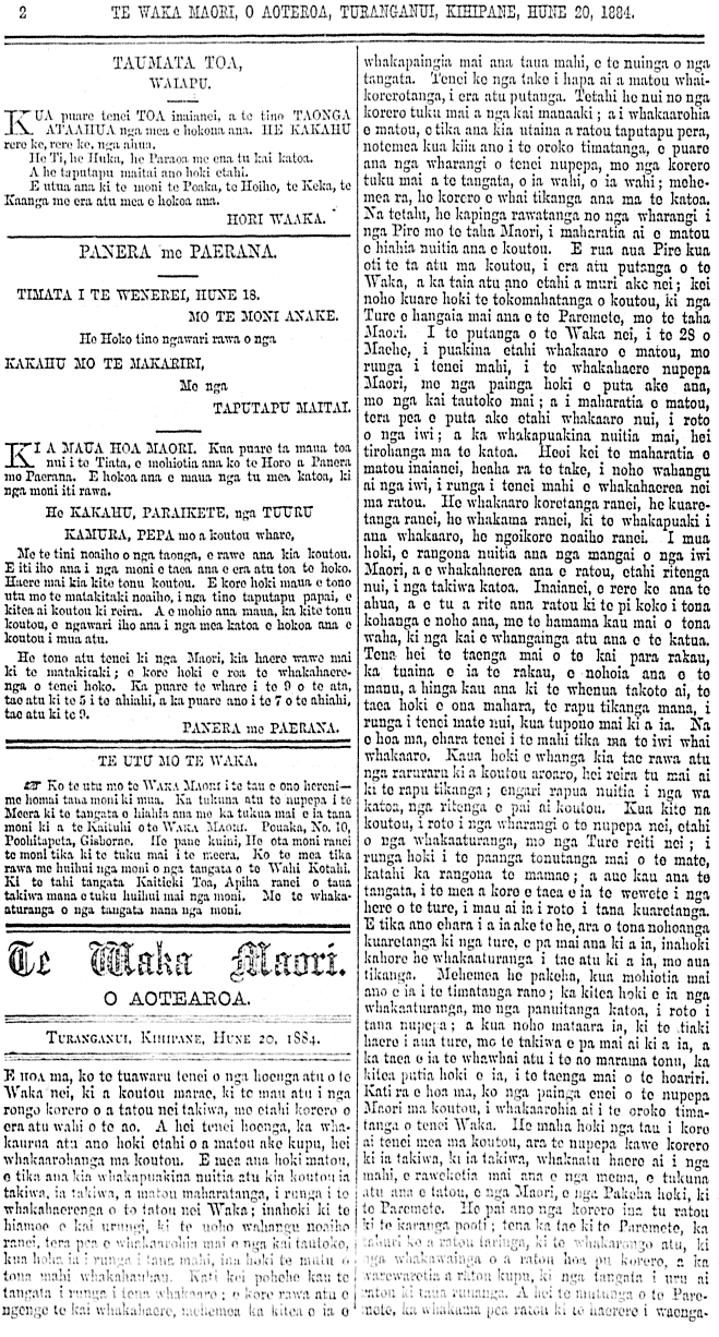 TAUMATA TOA. WAIAPU. Kua puare tenei Toa inainei, a te tino Taonga ataahua nga mea e hokona ana. He kakahu rere ke, rere ke, nga ahua. He ti, he huka, he paraoa me ena tu kai katoa. A he taputapu maitai ano hoki etahi. E utua ana ki te moni te Poaka, te hoiho, te Keka, te kaanga me era atu mea e hokoa ana. HORI WAAKA. PANERA ME PAERANA. Timata i te Wenerei, Hune 18. Mo te moni anake. He hoko tino ngawari rawa o nga Kakahu mo te Makariri, me nga TAPUTAPU MAITAI. Ki a maua hoa maori. Kua puare ta maua toa nui i te Tiata, e mohiotia ana ko te Horo a Panera me Paerana. E hokoa ana e maua nga tu mea katoa, ki nga moni iti rawa. He kakahu, paraikete, nga tuuru Kamura, pepa mo a koutou whare, Me te tini noaiho o nga taonga, e rawe ana kia koutou. E iti iho ana i nga moni e taea ana e era atu toa te hoko. Haere mai kia kite tonu koutou. E kore hoki maua e tono utu mo te matakitaki noaiho, i nga tino taputapu papai, e kitea ai koutou ki reira. A e mohio ana maua ka kite tonu koutou, e ngawari iho ana i nga mea katoa e hoko ana e koutou i mua atu. He tono atu tenei ki nga Maori, kia haere wawe mai ki te matakitaki, e koro hoki e roa te whakahaerenga o tenei hoko. Ka puare te whare i te 9 o te ata, tae atu ki te 5 i te ahiahi, a ka puare ano i te 7 o te ahiahi, tae atu ki te 9. PANERA ME PAERANA. TE UTU MO TE WAKA. KO te utu mo te WAKA MAORI i te tau e ono hereni, me homai taua moni ki mua. Ka tukuna atu te nuipepa i te Meara ki te tangata e hiahia ana me ka tukua mai e ia tana moni ki a te Kaituhi o te Waka Maori. Pouaka, No.10, Poohitapeta, Gisborne. He pane kuini, He ote moni ranei te moni tika ki te tuku mai te meera. Ko te mea tika rawa me huihui nga moni o E tangata o te Wahi Kotahi. Ki te tahi tangata Kaitiaki Toa, Apiha ranei o tana takiwa mana e tuku huihui mai nga moni. Mo te whakaaturanga o nga tangata nana nga moni. TE WAKA MAORI O AOTEAROA. Turanganui, Kihipane, Hune 20, 1884. E hoa ma, ko te tuawaru tenei o nga hoenga atu o te Waka nei, ki a koutou marae, ki te mau atu i nga rongo korero o a tatou nei takiwa, me etahi korero o era atu wahi o te ao. A hei tenei hoenga, ka whakaurua atu ano hoki etahi o a matou ake kupu, hei whakaarohanga ma koutou. E mea ana hoki matou, e tika ana kia whakapuakina nuitia atu kia koutou ia takiwa, ia takiwa, a matou maharatanga, i runga i te whakahaerenga o to tatou nei waka, inahoki ki te hiamoe e kai urangi ki te noho whakapaingia mai ana tana mahi o te nuinga, a nga tangata. Tenei ke nga take i hapa ai a matou whaikorerotanga, i era atu putanga. Tetahi he nui no nga korero tuku mai a nga kai manaaki a i whakaarohia e matou e tika ana kia utaina a ratou taputapu pera, notemea kua kiia ano i te oroko timatanga e puare ana nga wharangi o tenei nupepa mo nga korero tuku mai a te tangata o ia wahi o ia wahi mehemea ra, he korero e whai tikanga ana ma te katoa. Na tetahi he kapinga rawatanga no nga wharangi i nga Pire mo te taha Maori, i maharatia ai e matou e hiahia nuitia ana e koutou. E rua aua Pire kua oti te ta atu ma koutou, i era atu putanga o te waka, a ka taia atu ano etahi a muri ake nei kei noho kuare hoki te tokomahanatanga o koutou, ki nga Ture e hangaia mai ana e te Paremete, mo te taha maori. I te putanga o te waka nei, i te 28 o Maehe i puakina etahi whakaaro e matou, mo runga i tenei mahi i te whakahaere nupepa maori, me nga painga hoki e puta ake ana, mo nga kai tautoko mai, a i maharatia e matou, tera pea e puta ake etahi whakaaro nui i roto o nga iwi, a ka whakapuakina nuitia mai hei tirohanga ma te katoa. Heoi kei te maharatia e matou inaianei, he aha ra te take i noho wahangu ai nga iwi i runga i tenei mahi e whakahaerea nei ma ratou. He whakaaro koretanga ranei, he kuaretanga ranei te whakama ranei ki te whakapuaki i ana whakaaro te ngoikore noaiho ranei. I mua hoki a rangona nuitia ana nga mangai o nga iwi Maori, a e whakahaerea ana e ratou, etahi ritenga nui i nga takiwa katoa. Inaianei, e rere ke ana te ahua, a e tu a rite ana ratou ki te pi koko i tona kohanga a noho ana me te hamama kau mai o tona waha ki nga kai e whangainga atu ana e te katua. Tena hei te taenga mai o te kai para rakau, ko tuaina e ia te rakau e nohoia ana e te manu a hinga kau ana ki te whenua takoto ai to taea hoki a ona mahara te rapu tikanga mana i runga i tenei mate nui, kua tupono mai ki a ia. Na hoa ma ehara tenei i te mahi tika ma te iwi whai whakaaro. Kaua hoki e whanga kia tae rawa ata nga raruraru kia koutou aroaro, hei reira tu mai ai ki te rapu mianga, engari rapua nuitia i nga wa katoa nga ritenga e pai ai koutou. Kua kite na koutou i roto i nga wharangi a te nupepa nei etahi a nga whakaaturanga mo nga Ture reiti nei, i runga hoki i te paanga tonutanga mai a te mate katahi ka rangona te mamae, a aue kau ana te tangata i te mea e kore e taea e ia te wewete i nga here o te ture i mau ai ia i roto i tana kuaretanga. E tika ano ehara i a ia ake te he, ara o tona nohoanga kuaretanga ki nga ture e pa mai ana ki a ia, inahoki kahore he whakaaturanga i tae atu ki a ia, mo aua tikanga. Mehemea he pakeha, kua mohiotia mai ano e ia i te timatanga rano, ka kitea hoki e ia nga whakaaturanga, me nga panuitanga katoa, i roto i tana nupepa a kua noho mataara ia, ki te tiaki haere i aua ture mo te takiwa e pa mai ai ki a ia, a ka taea e ia te whawhai atu i te ao marama tonu, ka kitea putia hoki e ia, i te taenga mai o te hoariri. Kati ra e hoa ma, ko nga puinga enei o te nupepa maori ma koutou i whakaarohia ai i te oroko timatanga o tenei waka. He maha hoki nga tau i kore ai tenei mea ma koutou, ara te nupepa kawe korero ki ia takiwa, ki ia takiwa, whakaatu haere ai i nga mahi, e raweketia mai ana e nga mema, e tukuna atu ana matou e nga maori e nga pakeha hoki, ki te Paremete. He pai ano nga korero ma tu ratou ki te karanga pooti, tena ka tae ki te Paremete, ka ÿ