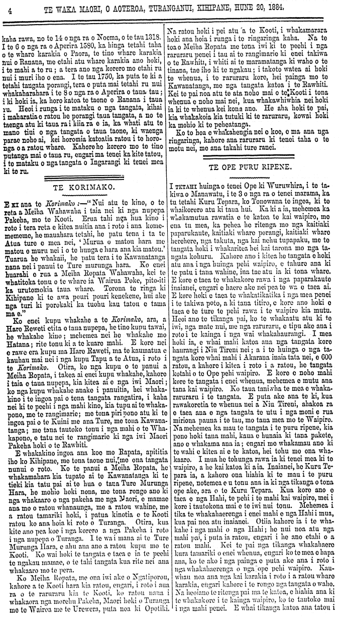 runga i nga ara e te Atua te nga ture ano hoki o te tangata ki te whakaora mai to tatou hoa tangata, ma mate i nga whakataimahatanga o te ao ki te ako hoki i a ratou ki nga mea hei painga mo ratou. Ka hore ano i kitea te kinonga ma nga tangata e uru atu ana ki nga tikanga a te Puru Ripene a nga Kuru Tepara ranei, engari nui atu nga painga. Mehemea i whakahaerea paitia nga rua miriona pauna (2,000,000), e maumauria ana e ratou mo te waipiro kua kore te rawakoretanga mo ratou inaianei. E rongo ana tatou, kei raro katoa tatou i te atawhai o te Atua e noho ana, otira kia maharatia e tatou, a tautokona mai ona e te Atua nga mahi tika a te tangata, a ka riro mai ano nga utu mo te tangata i tenei ao ano, mana ka mahi tika, ka mahi kino ranei, a kore ana tukua kia tae rano ki te rangi ki te reinga ranei whakarite ai. E koro e tika i nga taone iti nei, kia ko nui atu nga tangata ki nga whare tapu a man nei nga rama i runga ake i nga whatitoka, ahakoa he aha ranei nga ingoa e aua whare. E nui a nga moni e pau ana i te hanganga a enei whare, engari e kore e tu enei whare mehemea e kore ana nga tangata poauau hei tautoko mai. E ki ana nga takuta, mehemea he titotara katoa nga tangata, kua iti rawa te mahi ma ratou, kua kore hoki e matemate nga tangata. Na te nga tangata a whakamau ana i te puru ripene, kia pono ta ratou mahi ka ta hoki ratou hei tauira, hei tirohanga hoki ma te nuinga i runga tenei mahi pai e whakahaerea nei a ratou. E puta ake ai i roto i te kainga waipiro nga hara nui me nga raruraru nui hoki i waenganui ia tatou, otira e kore e taea te whakakore rawa tenei mahi kino inaianei. HE RETA TUKU MAI. [E kore e tau kia matou te he mo nga whakaaro a nga kai tuku korero mai.] Ki te Etita o te Waka Maori. Aperira 28, 1884. E hoa, tena koe, utaina atu ki to tatau waka, nga korero i raro iho nei. Ko te tahi 1 o Mei 1884, e haere ake nei, ka haere atu e R. Whititera Te Waiatua i Rotorua nei ki Akarana, ki te whakahaere i etahi tikanga a tae mai ai te Rerewe, o Akarana ki Rotorua, a, kia kite hoki i te whakawakanga e te Hupirimi Kooti i nga Riihitanga a te taone o Potorua, engari ki te tino take o tana haora ki Akarana, kai runga i te kupu a te Karaiti, a mea nei Kawea a koutou mate ki to Rata, kaua ki nga mahi Maori, a no reira ka whakaritea ahau e ia, hei whakakapi, mo tona turanga i te wa e ngaro ana ia. Na koia ahau ka tuku korero atu nei ki runga ki ta tatau Waka. Tenei kua kite ahau tetehi korero i roto i to Waka Maori o te 18 o Aperira nei, he maroro kokoti ihu Waka taua mo R. Whititera Te Waiatua, Na Raureti Paerau o Akarana. Na ka whakahokia e ahau taua kupu. E hoa, a Raureti, ahakoa he kaumatua te mohio koe na o korero ka tahi ka mohiotia he pepi rawa koe a te kuare hoki, notemea hoki he kimi moni anake tou take i noho ai ki Akarana, a, me haere tonu koe i nga huarahi o taua mahi, kia whiwhi koe i te kapa, kaua hai rere noa ki te huarahi o te Ariki, kai epaina koe ki te kohatu, i nga huarahu o te hunga wairangi, notemea hoki e mahara ana ano pea te Kaituhi o te Korimako. E kiki ana nga wahi katoa o te motu nei, i nga Paipera tapu o te Atua a, e tohe tonu ana ki te perehi i era korero, kia te Korimako. Na, kia kite koe i taua mahi kuare, ko te Korimako he pepa taea noaiho a ko aua pepa e takaia ana hoki ki te kai me eratu tikanga pohehe. Na, ki ta te Maori tikanga hoki kua noa au i muri. Te tuarua o nga hae, i kapi noa iho te korimako i nga korero o nga Paipera e mau atu nei, i o matau ringa a te ai te wharangi watea mo nga korero o te motu nei, no te mea ka 9 nga reta a Rotorua, me nga Pane Kuini 30 kua ngaro tonu atu i a te Korimako. Tena iana, e tohe ki te whakaki i a te Korimako ki taua huarahi o nga Apotoro aianei koe te kite ai, kua mutu te awhina e nga iwi Maori e tenei motu, tona nupepa, a ko reira koa mohio ai te tika taku korero. Na, whakarongo mai, ko R Whititera Te Waiatua, koia nei tetehi a nga rangatira taitamariki o Rotorua koia nei te Putea Wananga, te maori e te matauranga, me te kawiu e te aroha kaore rawa a mohio ki te kai Tupeka, torori ranei o te kupu mai ra ano tona matua wahine, e tae noa ki tenei ra; engari he tangata tutu he tangata haurangi ia i mua ake nei a runga i taua maharatanga ki tona rangatiratanga kai ngaro hoki atu ana ia ki te aroaro o te Hahi mo te iwi ano hoki a hihi ana ki te Paipera Tapu a te Atua, me te whakahua i enei kupu, Ko te mutunga tenei e taku haere i nga huarahi e tenei aa, a e kore ano hoki ahau e kai i nga wai whakahaurangi a muri nei a mate noa. A whakaputa ano hoki ia i tetehi kupu ki te iwi, koia tenei taua kupu. Whakarongo mai e te iwi, ko te kupu a Rawiri ka tangohia e ahau maku tenei ra, E kore rawa ahau o hoki atu ki runga ki toku moenga takoto ai te mea, kaore ano kia kitea te turanga mo te Temapara a te Atua. A, no runga i tenei kupu, whakaaetia ana e nga rangatira a tona iwi, tetehi whenua hai turanga mo te Temepara o te Atua, ki Ohinemutu. Ko nga ra e te marama e haere ake nei, ka timata te mahi e taua whare karakia, e tae ana Para ki te 250 pauna te utu mo taua whare. E hoa ma te tauira pai tenei mo tatau. Na e hoa ma, kua kore tika te korero a Raureti i uta nei i nga taumaha e tenei ao ki runga kia R. Whititera Te Waiatua. Ko tenei e hoa, e Raureti Paerau, ki a kaha rawa koe ki te pupuri i te kupu kai hoki ki runga kia koa te koha o taua mahi kai kore e taea a koe te wetewete ou taumaha i te ra whakamataku o te mamae mutunga kore. KO NGA KORERO 0 ROTORUA. No te 28 o Maehe kua taha nei, ka pootitia nga mema, mo te ture Komiti maori o te tau 1883, mo te takiwa o Rotorua na e mau ake nei nga ingoa o aua mema, me nga whika o nga tangatak i pooti kia mema, kia mema. Menehira Taiamai 60, R. Whititera Te Waiatua 53, Wiremu Ratete 49, W. Maihi Te Rangikaheke 48, Timi Wata 46, W. Keepa Te Rangipuawhe 46, Anahi Te Rahui 43, Niramona-Pini 40, Erueti Te Aoauru 40, Aporo Te Tipitipi 40, Te Mete Raukawa 38, Rota Te Wharehuia 31, Hamuera-Pango 30, Henare Werahiko 26, Hoori T. 26, Haukiwaho Piwiki 21, Te Purei Tanira 19, Matene T. 6, Ut