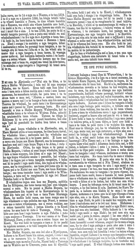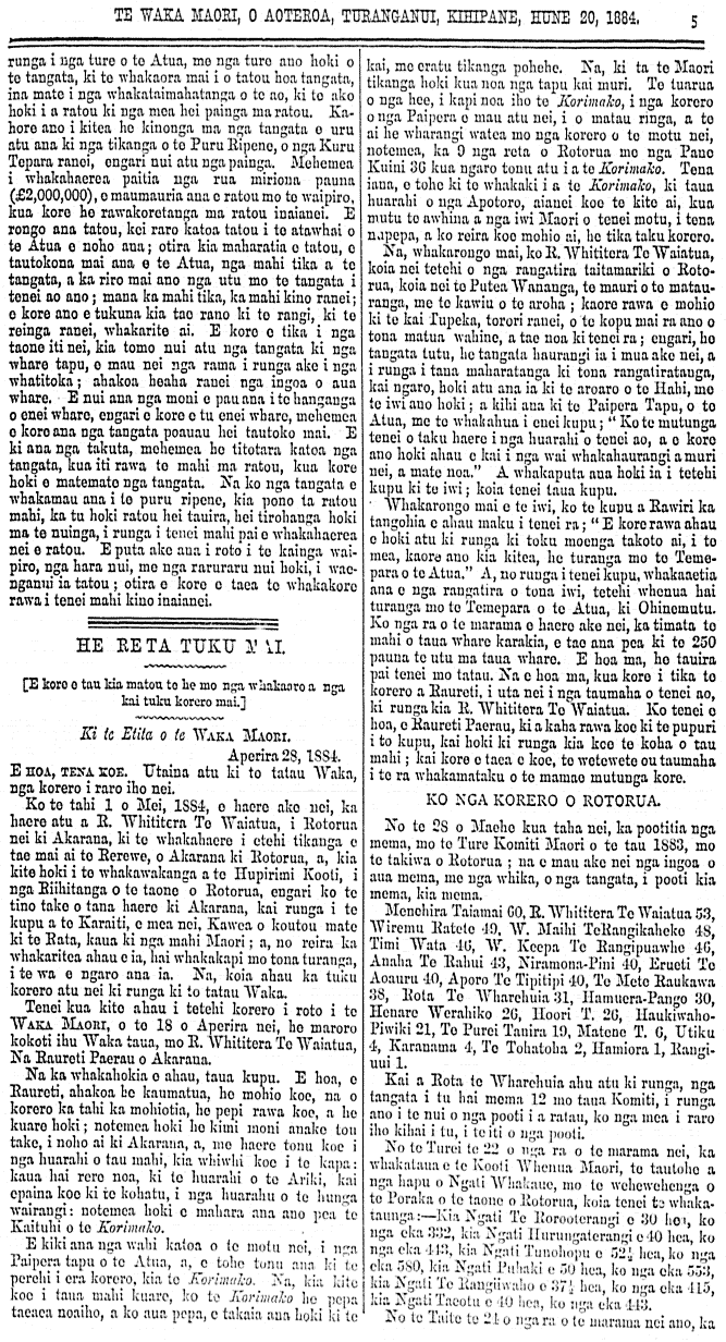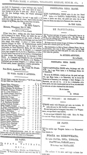 whakaputaina a te Kooti te whakamananga e tetehi atu Kooti, i nga wehewehenga a Rotorua Patetere Poroka. Ko aua wehewehenga e waru ko te Wharenui I, ko Te Puketawhero H, ko Owhatiura 9, ko Tihiotonga E, ko Te Kaitao D, ko te Rotohokahoka Poraka whenua i tuturu kia Ngati Whakaue mo aua wehewehenga i eneri ra, ko te otinga o taua mahi, ka tahi ka wehea te 20,000 eka mo te rerewe mai o Akarana ki Rotorua nei. Kati i konei kai hoha te kai whakatere o te Waka Maori. TE WHAREKIRI TE POHOROA. Ki te Etita o te Waka Maori. E hoa, tena koe, Tenei tetahi utanga mo te Waka ka manu nei kei te moana ki te kore e tau ata ki runga i to tatou waka, maka atu ki te punake e te Waka nei ki te ihu noa, otira hei waenganui tonu, note mea kua Karauna Karati au ki tenei waka, maku korero ka tuhia au ki raro ake nei. Koia nei aku utanga, 26 o Aperira i moe ai toku hoa e Katerina Taru, he wahine kitea e nga iwi e te Tairawhiti nei tona pai, aroha ki te tangata haere he wahine i whakawhirinaki ki nga waewae o nga tangata nuinui o te Hahi. Kua moe ia te moenga roa he nui nga tangata i hui mai ki a ia, he haere mai ta te tangi ki tona tinana. E tae ana ki te 250 tangata i haere mai ki te tangi kia ta ko nga hapa i haere mai, Ngaitarawhakairi, Ngatirehu, Teitangaamate, Ngatihokopaura, Te Whanauarua, Raniera Kawhia, Hamiora Katia, me etahi atu. Te whanau a karuai, Ngatihorowai, Ngatirau, no tua o Tawhiti, Te Whanau a te ao, Ngatihau, Ngatimatewaru. Ko nga Hapu tenei i haere mai ki te tangi kia ia, kei te haere mai ano etahi ona hapu. I a ia e takoto ana i runga i tona moenga ko tona mahi he korero i tana Paipera., ka rite ia ki te wahine turoro o Inia i tango nei i tana Paipera ki ana ringa ka mea kei konei toku Ariki a Ihu Karaiti, katahi ka meatia te ringa ki tona uma, ka mea kei konei taku Ariki a Ihu Karaiti a ka whakaarahia ona ringa ki runga mei te titiro whakarunga ona kanohi kamea kei reira hoki toku Ariki a Ihu Karaiti. Ko tenei e mohiotia ana, e kite ana tona kai karakia i tona Karaipiture, a tae noa mai a te Wiremu Aterikona, ka riro nana i karakia i te ahiahi ka waiata ia i tenei Waiata, 23 o nga waiata, 1,2,3,4,5,6,rarangi, ko tana kauhau ano tenei. I te ata ka karakia ano a te Wiremu kua puta mai tana kupu ki au, E ta kua whakaae nei ahau, a ka whakapono toku ngakau a ma te Atua ahau e whakaara ake i te mate, a ka ora ahau. Roma 10-9. He wahine manaaki i nga pononga a te Atua kei te mohio nga Hapu katoa he manaaki manuhiri tana mahi he karanga ki uta. HUTANA TARU. Waipiro, Mei 16, 1884. Ki te Etita o te Waka Maori Nau mai! Haere atu ra e taku karere, i runga i te komuri aroha kia te Etita. E hoa tena koe, kia ora tonu koe, me te mahara ano, ko te Karaiti to taua huarahi ki te ora ta hoa e te rangatira o te Waka e hoe haere na i nga tahataha takutai o Aotearoa. E hoa, aroha mai ki te uta atu i enei nga wahi kupu makari ake nei ra. Tenei ka mahara ahau te kai manaaki o te Waka maori kai te mahara ki tuku kupu i te tuatahi, ara ko te moni i whakarite i te tuatahi mo te nupepa e Paratene Ngata, ka tukua atu nei i roto o te Ota te moni a 6 nei nga hereni. (2) Ko Aperahama Toki te tangata i haere ki te keri kapia i Parengarenga, hei kua hokoa ana kapia i nga ra o Mei kua taha nei, a kitea ake na Te Rutene, o Pamapuria Kaitaia, no te Patu te tangata i whakakaingoatia nana tetahi onga peeke rakau kapia i tahae, ae kua tino mohiotia rapua ana a ka kite aka utua mai e te Rutene kia Aperahama te moni e 2.1s. (3) Ko Ngatotoiti te whenua kei Ahipara, e tautohetia ana e Ngatimoetonga, raua ko te Whakakohatu. Ko au tonu tenei, he whenua papatipu hoi kua tukua e oku kaumatua ki au tonu he whakahaere ritenga mo taua whenua, a i roto o enei tau, kei te rapu ritenga tonu ahau, ne te tuhi tonu i etahi ritenga, kia tukua taua whenua ki te Kooti Whakawa Whenua Maori kia wawe te mohiotia nga mahara o te ngakau. (4) Ke to matou hoa kotiro ko te Paea Hoani, i mate nei ki Rangiawhia i 29 Mei, 1883, kua taha ake nei, he kotiro tera i noho tahi matou ki te kura o Ahipara, he kotiro i aroha nuitia e ona matua, me ona whanaunga, ara e matou katoa, no reira mai ano te aroha moroki noa nei. Hei no tenei tau te 6 o Mei, 1884, ka hahua tona tinana, ara nga whenua ka kawea ki te taha o te whare karakia i Rangiawhia. (5) He nui noa atu nga tangata o Ngakahu, Kaitaia me o etahi takiwa atu, e rere nui ana ki te whenua, keri kapia o Hami, Hurai, i Paua Parengarenga. Rere ai na te tima etahi, me o ratou kumara, riwai. Ko etahi e takahi ma uta ana me nga hoiho. (6) Ko Rev. Reihana Paora, te minita o Ahipara e tata ana ki te marenatia kia Miriama Hoani, he pouaru ngatahi. Hoi kei te tukino nga whanaunga o Reihana ia ia, me ona taokete, auahine tawhiti ia ia. Ko au ia e tautoko tawhiti noa atu ana au, e pai ana ki tenei hunga. Hoiano. NA LATIMA BRAHAM. Ngakahu, Kaitaia Mei 21, 1884. Ki te Etita o te Waka Maori. Tena koe, e taku hoa Maori kua rite nei koe mo te pakeha. Ka nui taku hari mo to whakinga mai ko koe tangata maori rano te Etita o te Waka maori ka pai e hoa kia hamuhamu tahi he aha te kore noa ai, i nga aitua ki te ara ki te moana. He maharatanga ake ki tetahi utanga mo te waka, koia tenei. 1. Ko tetahi mea e whakahaerea ana e te pito ki raro nei, ara o Ngapuhi, ko te pitihana a nga iwi o te motu nei ma nga mate o te motu nei. Heoi kua puta nga panui kohi moni ki nga iwi katai a te motu nei,tena pea hoki kua tae atu ki nga iwi katoa o te motu nei, ki Ingarangi. 2. Ko nga Komiti maori, kua whakaaetia e te pito ki raro nei. Enei mea i kitea ume penei ko te haerenga a Hirini Taiwhanga ma ki Ingarangi ki te kawe i nga mate o te motu nei, he mea pitihana na te pito anake ki raro nei te pitihana. Heoi kiia mai ana e nga tangata e Ingarangi, me hoki mai ano a Hirini Taiwhinga ma, me ta ratou pitihana ki konei, kia haina nga iwi katoa e te motu nei ki te pitihana, ka tuku ai ki te Paremete o Niu Tireni, kia haina te Kawana a Niu Tireni, ka tuku ai ki Ingarangi. E takoto nei tenei wakaaro meake ka tutuki atu ki tona tutukitanga. I te haere a Ngap
