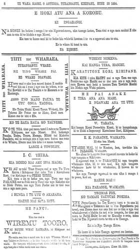 E HOKI ATU ANA A KORORU. KI INGARANGI. NA KONEI ka hokoa i runga i te utu Ngawari rawa, oku taonga katoa Tona tini o nga mea maitai, E rite ana te utu ki te hiahia e nga Maori. Kia tere te haere mai ki te hoko kia whiwhi koutou i te wa e ngawari ana te utu. Ko te whare ai tenei te utu. NA KORORU. TIITI me WHARAEA. TURANGANUI WHARE HE TNO WHARE PAI HE WHARE NGAWARI. Haere mai e aku hoa maori katoa E mohio nei kia au i roto i nga tau ka tekau o te a Tai Rawhiti o te Tai Tuauru o te Hauauru o te Hautonga. 6000 ENO MANO PAUNA TE UTU ONGA TAONGA. He Tuira Huiti Kooti Tarau Wekoti, He Tokena. He Potae me te Hate, Enei mea Katoa mo te utu e 25s. KO TE RATA RAUA KO TAUNERE. Ko te toa tino pai rawa tenei rute o te Taone o Kihipane mo nga Maori. Hei hokonga Pouaka, Teepu, Tuuru, Moenga, Mihini tui Kakahu, Paraikete, me te nui nga atu o nga mea katoa mo roto o te Whare, Haere mai kia kite i o maua taonga. LARGE & TOWNLEY I. C. TEIRA. KIA MOHIO MAI AKU HOA MAORI. Kei au te tahi Tino Haupu nui o nga Tu Tera Katoa i Kihipane Kei taku Tera i Karatitone Rori, i te Kokinga o te PEERE TITITI. Ka taea e au te hoko atu nga Tera me nga PARAIRE mo te Paki mo te Terei me nga Kakahu mo te mahi Parau, me nga Tera Peeke me te tini noa atu i nga mea pera. I RUNGA I TE UTU O AKARANA. HAERE MAI KITA KITE. HE PANUI. Kua tae mai a WIREMU TOORO, Kai ruuri whai raihana ka Kihipane nei noho ai. He maha ona tau e ruuri ana ia i nga Whenua Maori i nga Takiwa o Akarana, a he tino tangata mohio ia ki tena mahi. He tangata whakangawari rawa hoki ia i te utu, ki nga tangata e tuku mahi mai aua mana. WIREMU MOKENA. KAI HANGA TERA, HANIHI. Haere mai ki te Whare whero (te Pei) Karatitone Rori, Kihipane. Kia kite i taku haupu nui o nga Tera me nga Paraire me nga Haihi me te tini noa atu o nga mea pera Kawea mai hoki a koutou Tera Tawhito Hanihi kia Mahia nga Wahi pakaru. HE PAI ANAKE E TIKA ANA ANA MAHI. E NGAWARI ANA TE UTU. W. TARATA KAI hanga Kooti Porowhita Kooti ki te hangaitanga kite Hahi o Ingarangi Karatitone Rori, Kihipone. E K PARONE WAIKATO. Ki oku hoa Maori Haere mai ki to Koutou, hoa, tawhito kia PARAONE, Waikato. Ko ahau te tangata tino ngawari rawata te hoko ki nga tangata o Kihipane. E ngawari ana a te Paraone ki nga tangata whakaaro tika, ki te utu mai, Ko nga tangata whakaaro kore ki te whakarite, E kawea ki te whakawa. Ko nga Taonga ngawari te utu tika i runga i te pono, Kei au. HAERE MAI! KIA PARAONE, WAIKATO. THOMAS FOX. KO TAMATI TAITUHI POKIHA HE Paparikauta he Toa Taonga tana e tu ana ki Waenganui o Tokomaru Ko te tino Paparikauta Pai tenei, ona Ruma moe me ona kai me te tini o nga wai whakahurori hiahia tia nei e te tangata, te tino pai rawa te Patiki Hoiho he nui te Karaihe o roto, nana hoki te Toa Ngawari rawa te utu o te Taonga. Kei a ia Nga taonga Katoa. Me haere ki te hoko Taonga ngawari mo koutou. He mea Ta e Poata me Korowhata i te Tari Perehi o Te Terewhene Kihipane mo Paratine Ngata te tangata nana tenei Nuipepa. Turanganui, Kihipane, Hune 20, 1884. ÿ