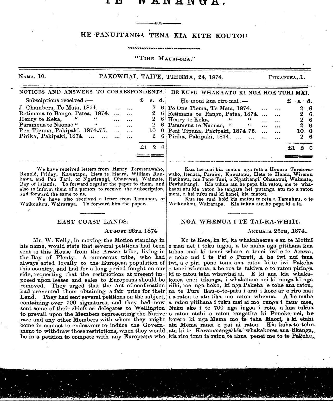 NAMA, 10. PAKOWHAI, TAITE, TIHEMA, 24, 1874. PUKAPUKA, 1,