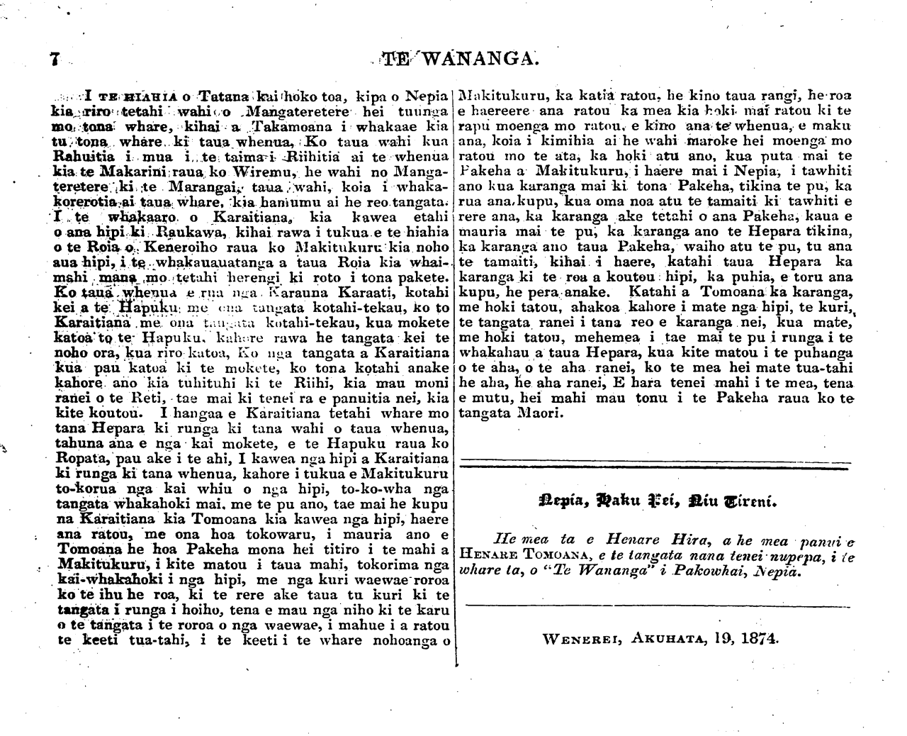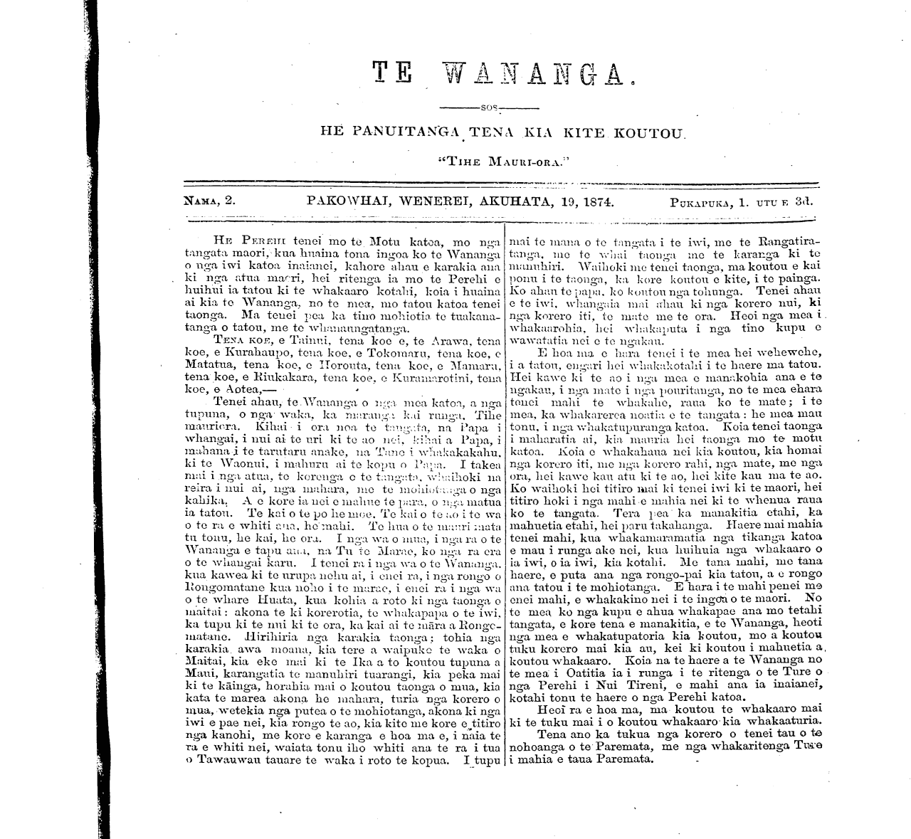 Te Wananga 1874-1878: Volume 1, Number 2. 19 August 1874 |