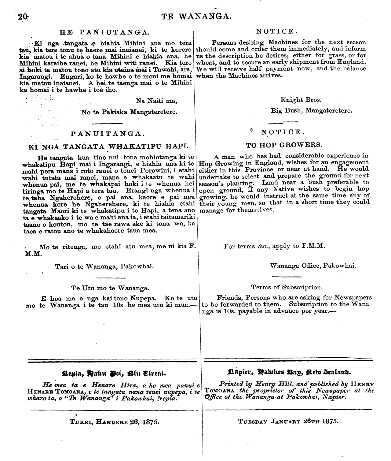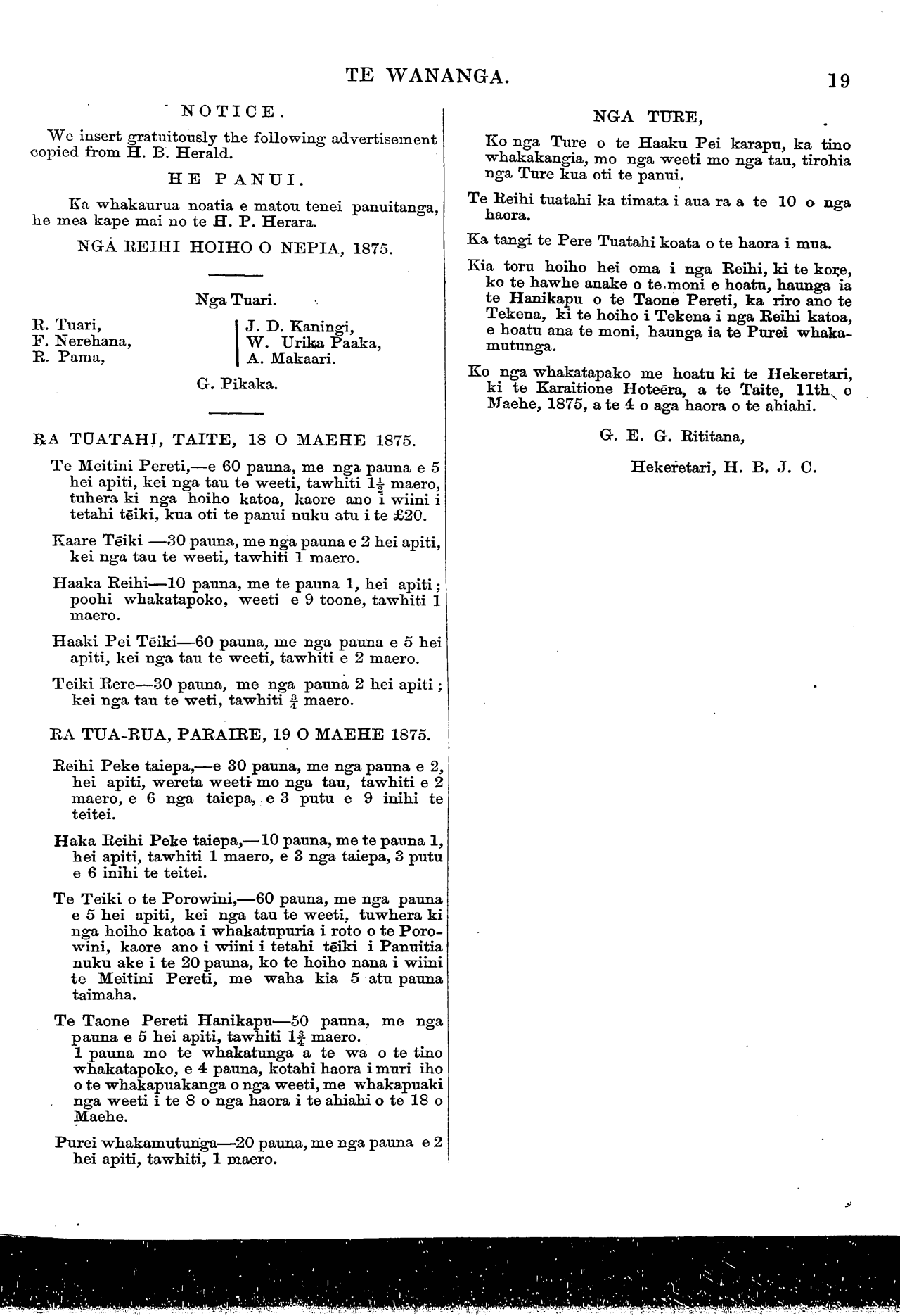 NAMA, 2. PAKOWHAI, TUREI, HANUERE, 26, 1875. PUKAPUKA, 2.