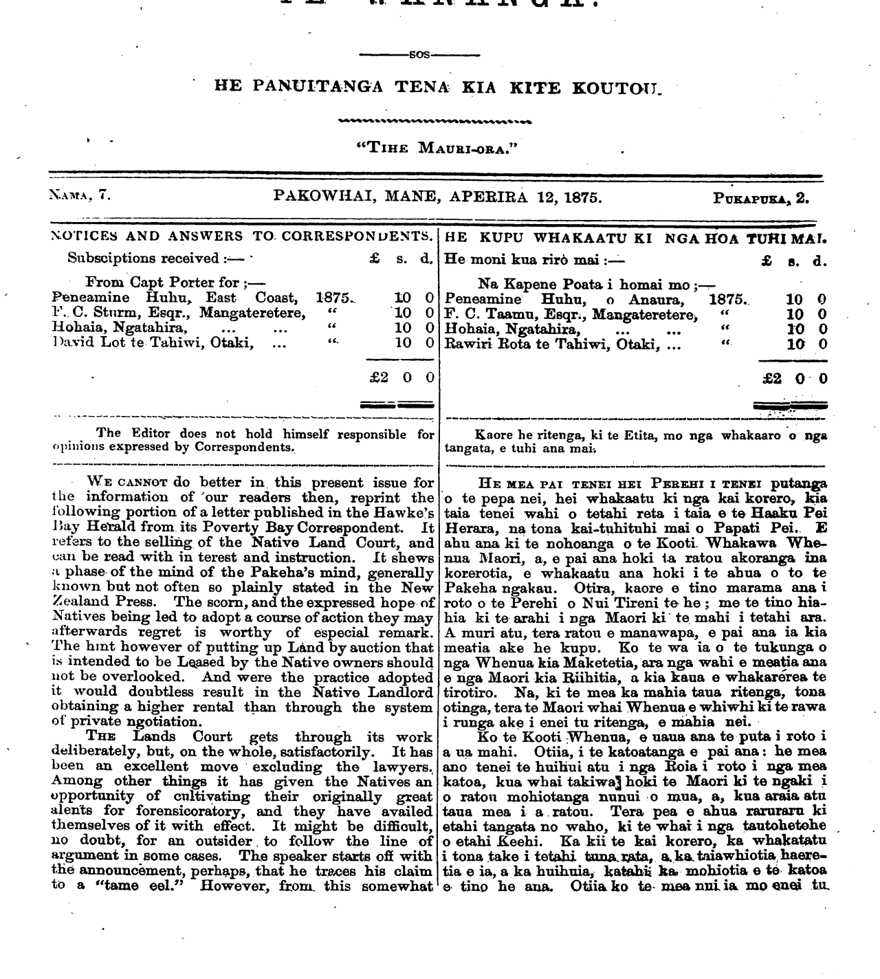 NAMA. 7. PAKOWHAI, MANE, APERIRA 12, 1875. PUKAPUKA, 2.