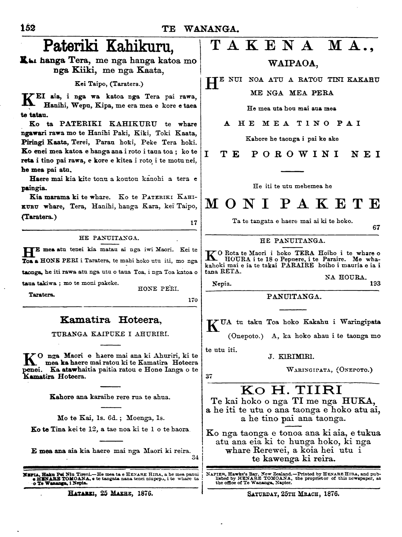 NAPIER, Hawke's Bay New Zealand.—Printed by HENARE HIRA, and pub-