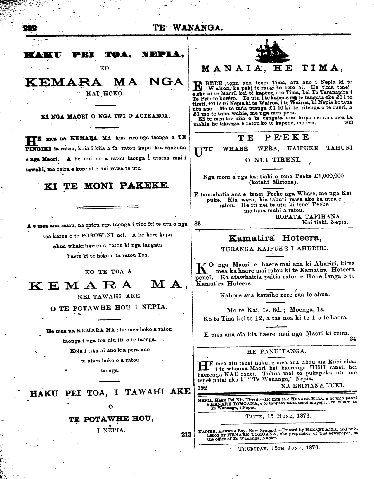 NAPIER, Hawke's Bay. New Zealand.—Printed by HENARE HIRA, and pub-