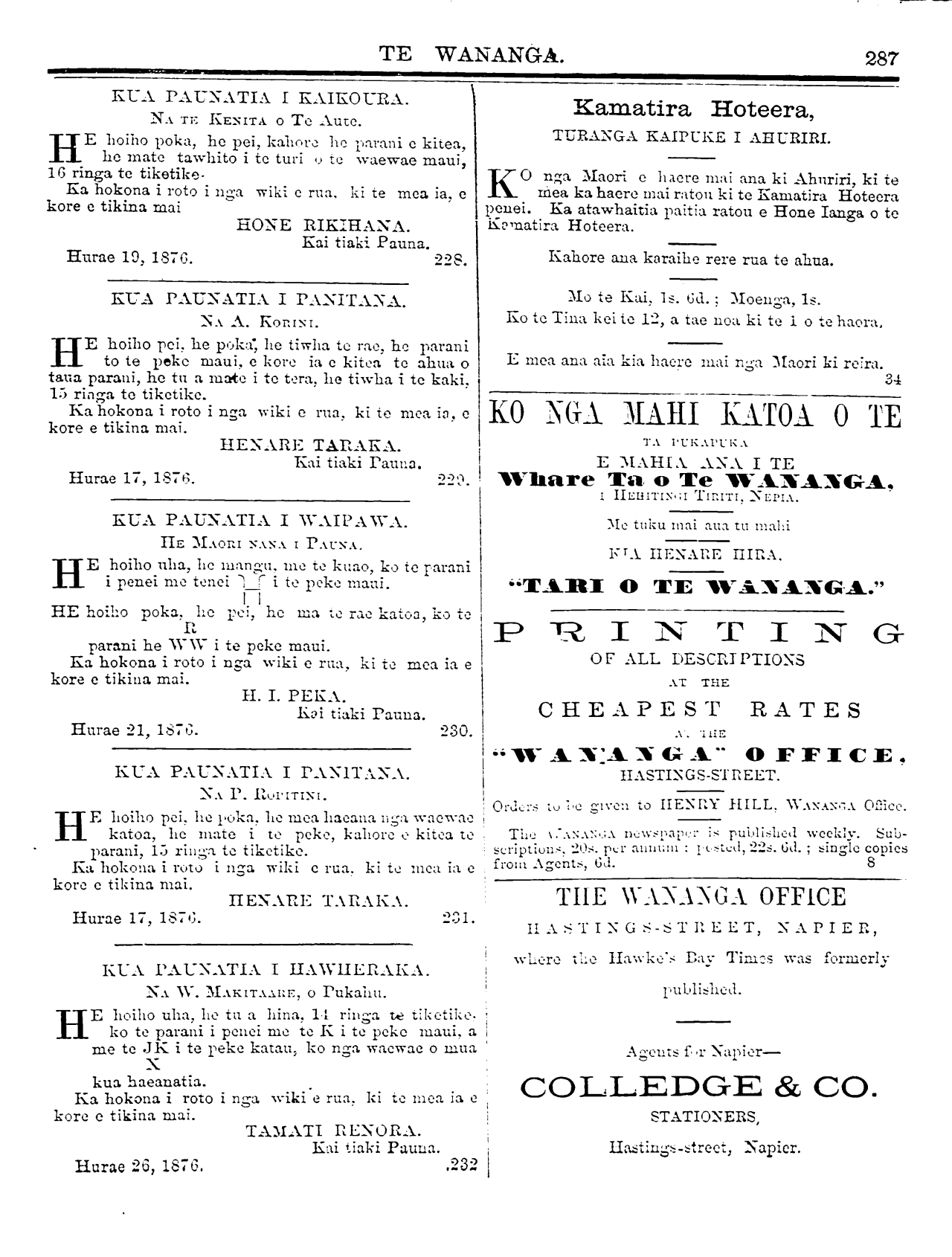 NAPIER, Hawke's Bay, New Zealand.—Printed by HENARE HIRA, and pub-