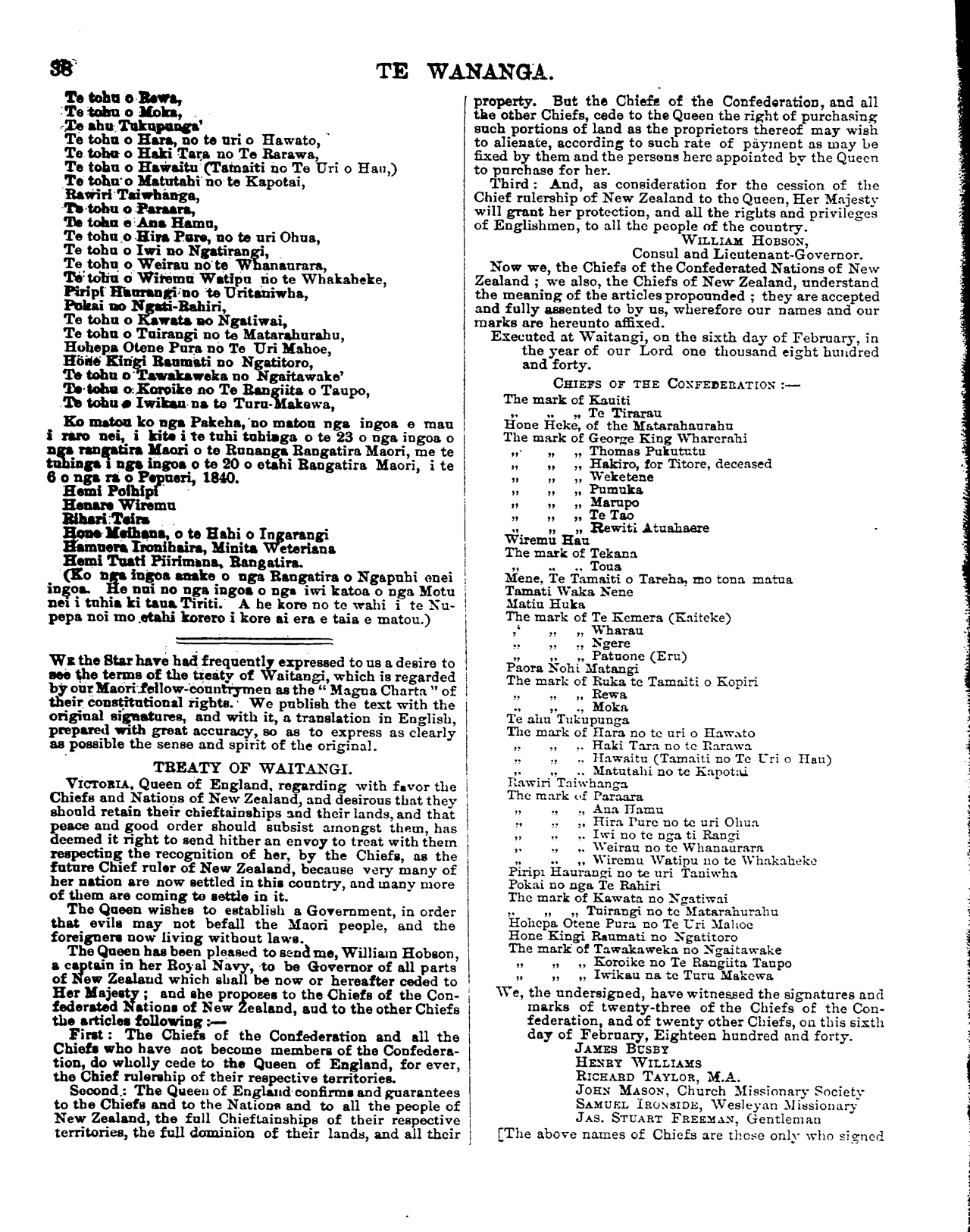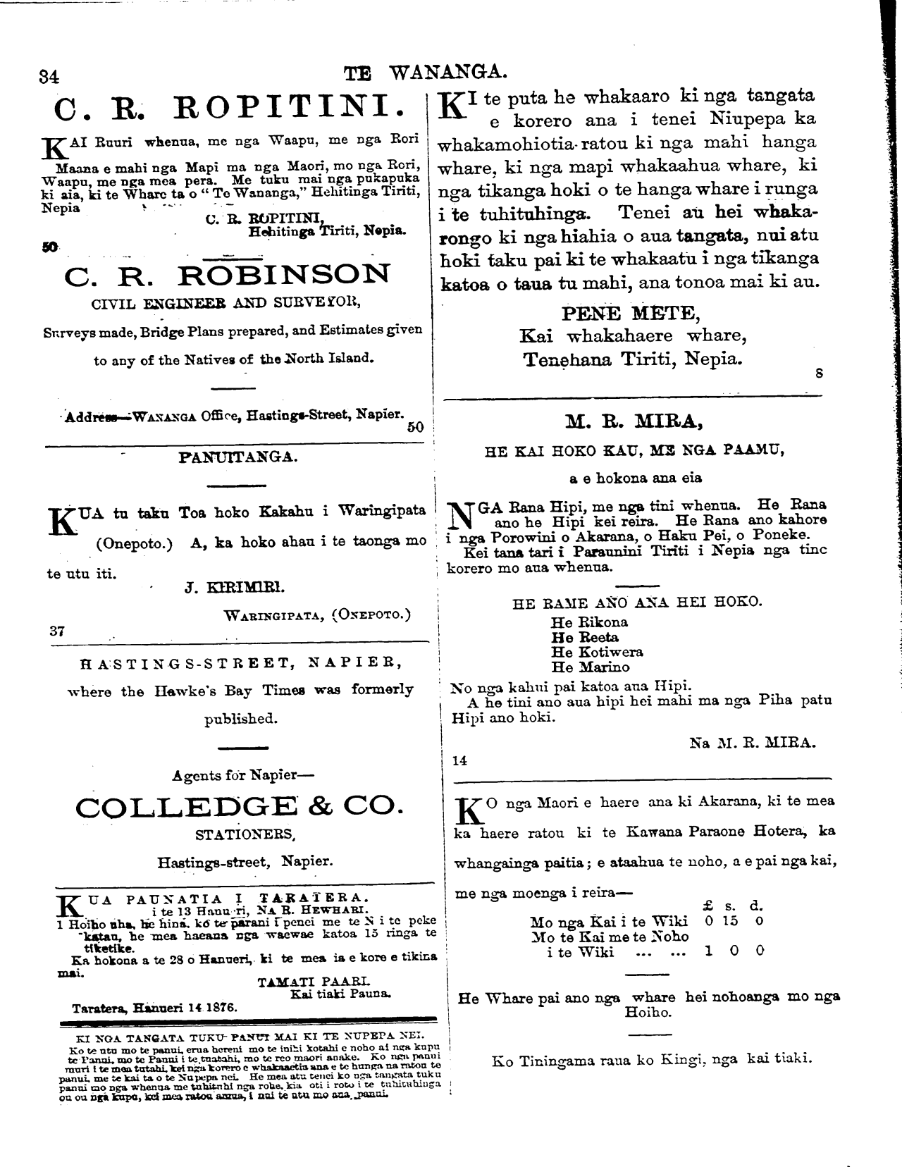 o te Karaitiriana i Nepia i te mane te 24 o Hanuere 1876, me