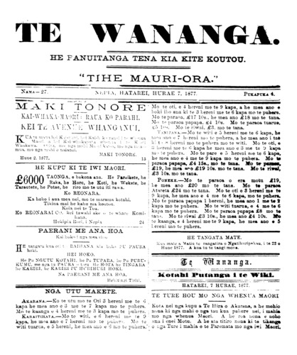 Te Wananga 1874-1878: Volume 4, Number 27. 07 July 1877 |