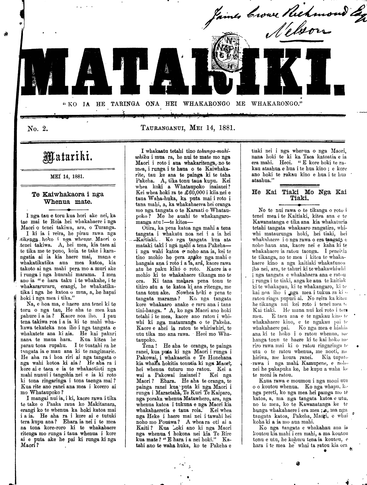 MATARIKI " KO IA HE TARINGA ONA HEI WHAKARONGO ME WHAKARONGO." No. 2. TAURANGANUI, MEI 14, 1881. Matariki. MEI 14, 1881. Te Kaiwhakaora i nga Whenua mate. I nga tau e toru kua hori ake nei, ka tae mai te Roia hei whakahaere i nga Maori o tenei takiwa, ara, o Turanga. I ki ia i reira, he pirau rawa nga tikanga hoko i nga whenua Maori o tenei takiwa. A, hei mea, kia taea ai te tika me te pono, koia te take i kara- ngatia ai ia kia haere mai, mana e whakatikatika aua mea katoa, kia takoto ai nga mahi pera mo a muri ake i runga i nga huarahi marama. I mea ano ia " e hara taku i te whakahe, i te whakararuraru, erangi, he whakatika- tika i nga he katoa u mua, a, he hapai hoki i nga mea i tika." Na, e hoa ma, e haere ana tenei ki te toru o nga tau, He aha te mea kua pahure i a ia? Kaore noa iho. I pau tena takiwa roa i a ia ki te mahi wha- kawa tekateka noa iho i nga tangata e whakatete ana ki aia. He kai pakari nana te maua hara. Kua kitea he parati tona rupahu. I te tuatahi ra he tangata ia e mau ana ki te rangimarie. He aha ra i hoa riri ai nga tangata o nga wahi kotoa ki aia? He aha ra i kore ai e taea e ia te whakaotioti nga mahi nunui i tangohia nei e ia ki roto ki tona ringaringa i tona taenga mai? Kua rite ano ranei ana mea i korero ai mo Whataupoko? I mangai nui ia, i ki, kaore rawa i tika te take o Paaka raua ko Makitanara, erangi ko te whenua ka hoki katoa mai i a ia. He aha ra i kore ai e tutuki tera kupu ana? Ehara ia nei i te mea na tona kore-roro ki te whakahaere ritenga mo runga i taua whenua i hore ai e puta ake he pai ki runga ki nga Maori? I whakaatu tetahi tino tohunga-mahi- whika i mua ra, he nui te mate mo nga Maori i roto i aua whakaritenga, no te mea, i runga i te haua o te Kaiwhaka- rite, tau ke ana te painga ki te taha Pakeha. A, tika tonu taua kupu. Kei whea koki a Whataupoko inaianei? Kei whea hoki ra te £60, 000 i kiia nei e taua Wahahuka, ka puta mai i roto i tana mahi, a,, ka whakahaerea hei oranga mo nga tangata o te Karaati o Whatau- poko? Me he auahi te whakangaro- manga atu!—te kitea— Otira, ka pena katoa nga mahi a tena tangata i whakatu noa nei i a ia hei —Kaitiaki. - Ko nga tangata kua ate mataki taki i nga mahi a tena Pakeha— i nga wahi katoa e noho ana ia, kei te tino mohio he pera anake nga mahi e hangaia ana i roto i a Ia, ara, kaore rawa atu he paku kiko o roto. Kaore ia e mohio ki te whakahaere tikanga mo te ora. Ki tana mahara pena tonu te titiro atu a te katoa ki ana ritenga, me tana tonu ake. Nowhea hoki e pena te tangata marama? Ko nga tangata kore whakaaro anake e raru ana i tana tinihanga.* A, ko nga Maori ano hoki tetahi i te mea, kaore ano ratou i whi- whi ki nga matauranga o te Pakeha. Kaore e ahei ia ratou te whiriwhiri, te utu tika mo ana rawa. Heoi mo Wha- taupoko. Tena! He aha te oranga, te painga ranei, kua puta ki nga Maori i runga i Pakowai, i whakaaetia e Te Honehana kia whaka hokitia tonutia ki nga Maori hei whenua tuturu mo ratou Kei a wai a Pakowai inaianei? Kei nga Maori? Ehara. He aha te oranga, te painga ranei kua puta ki nga Maori i runga i Maraetaha, Te Kuri Te Kaiparo, nga poraka whenua Matawhero, ara, nga whenua katoa i tukuna e nga Maori kia whakahaeretia e taua roia. Kei whea nga Heke i haere mai nei i tawahi hei noho mo Pouawa? A whea ra oti ai a Kaiti? Kua hoki ano ki nga Maori nga whenua i hokona nei kia Te Rire kua mate?"E hara i a nei hoki." Ka- tahi ano te waha huka, ko te Pakeha e tiaki nei i nga whenua o nga Maori, nana hoki te ki ka Taea katoatia e ia era mahi. Heoi. " E kore hoki te ra- kau ataahua e hua i te hua kino; e kore ano hoki te rakau kino e hua i te hua ataahua." He Kai Tiaki Mo Nga Kai Tiaki. No te nui rawa o te tikanga o rotu i tenei mea i te Kaitiaki, kitea ana e te Kawanatanga e tika ana kia whakaturia tetahi tangata whakaaro rangatira, whi- whi matauranga hoki, hei tiaki, hei whakahaere i o nga rawa o era tangata, e noho haua ana, kaore nei e kaha ki te whakahaere ia ratou taonga. I peneitia te tikanga, no te mea i kitea te whaka- haere kino a nga kaitiaki whakatunoa iho nei, ara, te tahuri ki te whakawhiwhi i nga tangata e whakahaera ana e ratou i runga i te tiaki, anga ke aua te kaitiaki ki te whakapau, ki te whakangaro, ki te kai noa iho i nga mea i tukua ra ki te ratou ringa pupuri ai. No reira ka kitea he tikanga nui kei roto i tenei mea u Kai tiaki. He mana nui kei roto i tera mea. E taea ana e te ngakau kino te whakahaere kino, e te ngakau pai te whakahaere pai. Ko nga mea e hiahia ana ki te hoko i o ratou whenua, me hanga tonu te haere ki te kai hoko me riro rawa mai ki o ratou ringaringa te utu o te ratou whenua, me nooti, ma hiriwa, me koura ranei. Kia tupato rawa i nga mahi. Kamupene, e noho nei he pukapuka ke, he kupu a waha ke te moni ia ratou. Kaua rawa e moumou i nga moni utu o o koutou whenua. Ko nga whapu, ko nga pereti, ko nga mea hei painga mo te katoa, a, ma nga tangata katoa e utu, no te mea, ko te Kawanatanga ke to hunga whakahaere i era mea; a, ma nga tangata katoa, Pakeha, Maori, e whai kohaki a ia mo aua mahi. Ko nga tangata e whakahau aua ia koutou kia mahi i era mahi, a ma koutou tonu e utu, he kohuru tena ia koutou, e hara i te mea he whai ta ratou kia ora