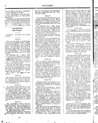 MATARIKI. Tomo rawa atu a ia ki roto i taua Aua. UPOKO XI Heoi. Ka tohetohe, ka tohetohe a Rae-Totara ki te taniwha ki a Mokete kia hoatu he moni ki a ia. Kaore te taniwha e pai. I ki atu a Mokete ki a ia, "E Rae-Totara E matau ana ahau ki a koe, ki ou mahi kino katoa, ki ou mahi patipati ki te Iwi Tawhito, ki ou mahi tinihanga ki a ratou, mo o ratou whenua. E mohio ana hoki wha Tika, e te Hupuirimi Kooti mo ou hara. UPOKO XII. Pouri Kerekere te ngakau o Rae-Totara ki tenei korero a Te Taniwha ki a ia. Kaore rawa atu he moni a Rae-Totara, hei hoko kai mana, kaore he whare ona kaore he hoiho, kaore he kiki, he aha ranei. Ka haere atu a ia, a, ka hoki atu ano a ia ki tu Taniwha kia Mokete. Ka tahi ka whakaatu atu a Rae-Totara ki te Taniwha i etahi pukapuka he mea tuhituhi ki runga. Ka ki atu Rae-Totara ki te Taniwha, "Tirohia! Kia mohio koe ko enei pukapuka, na Te Iwi Tawhito i tuhi o ratou ingoa ki roto. Kua tukua mai e ratou kia au o ratou whenua katoa, me nga mana whakahaere katoa, me te mea tonu naku tonu ake te whenua. Ka hiahia ahau ki etahi moni, heoi, ka hoatu enei pukapuka e au, ka tahi ka riro mai te moni ki au. Mawai hoki e whakaatu atu ki a ratou He tangata mohio hoki ahau ki nganga kopikopikotanga o te ture." Ka rongo te Taniwha ki enei korero, ka noho puku a ia. Ahua pouri ana a ia ki ena korero a Rae-Totara. He aroha nona ki te Iwi Tawhito, ki te iwi, na ratou i tuku atu o ratou whenua ki te roia-minita. UPOKO XIII. Katahi rawa ka whai kupu tu Taniwha. Ka ki atu a ia kia Rae-Totara, '' Kia mohio koe ka hoatu e au nga moni katoa e hiahiata ana e koe i runga i enei pukapuka tuku a te Iwi Tawhito i o ratou whenua ki a koe. Mau te whakaaro, mau to tikanga kia ratou. Kia mohio ana hoki Koe, ki te kore koe e whakahokimai i aku moni koura katoa e hoatu ana e au kia koe, tera ranei au e hoatu ki a koe i te ra tonu i whakaritetia e tana. Kore rawa atu toku ngakau aroha. Ka hamama toka waha, ka horomia e au nga whenua a te Iwi Ta- whito. Mo ratou, me a ratou tamariki a muri tonu atu te mate. E hara hoki "i au to ratou KAITIAKI." UPOKO XIV Na, tangohia ana e Rae-Totara, nga peeke koura, e hia ranei miriona pauna te moni, e hia ranei, a, haere atu ana. E ngari, puritia ana e Te Taniwha nga pukapuka tuku katoa mo te wa hei whaka- hokitanga mai i nga koura, nga moni katoa i namai a Rae-Totara. UPOKO XV Rekareka ana te manawa o Rae-Totara ki te nuinga o te moni i riro mai ki aia. Katahi ano a ia ka whiwhi ki te moni. Katahi ano ka noho a ia i roto i tetahi whare pai. Katahi ano ia ka haere i runga kiki hoiho ranei. E hika ma, ko Horomia i roto i ana kororia katoa kihai rawa i rite ki a Rae- Totara i nga takiwa e nama ana i nga moni ki te Taniwha Mokete i runga i nga whenua o te Iwi Tawhito. UPOKO XVI "Rekareka, rangi tahi, ko Kararu tona mutunga iho." Pau katoa ia Rae\_Totara nga moni i riro mai ki a ia i te Taniwha Mokete. UPOKO XVII. Tera ano etahi tino Taniwha i tana whenua kaore nei i whakahuatia i konei. Ko tetahi o ratou ko KAIWHAKAATU- HARA tona ingoa. Tetahi ingoa ona, ko NIUPEPA -PEREHI, he taniwha mohio ia. Na, pa mai ana te mataku kia Rae- Totara. Nui rawa atu tonu wehi koi whaaki atu te taniwha Nuipepa-Perehi i ona hara ki tu ao katoa. Tetahi kei whakatika te taniwha tika ko Te Hupirimi Kooti ki te putu i a ia mo ona he. Kihai taua taniwha i aro mai kia Rae-Totara ki ona mahi ranei. UPOKO XVIII. No te taenga atu ki te? ra hei whaka hoki- tanga i nga moni kia Mokete, Aue! Tiro tiro kau una! Tahuri kau ana! Paki paki kau ana ki nga pakeke. Nowhea to pene kotahi? Kua rere noa atu ra hoki te weta o te mahi, o nga whenua hoki. Ko te rarunga tenei o te Iwi Tawhito. Riro ana o ratou whenua katoa ki te Taniwha Mokete hei whakangata i tona puku. E hia ranei poraka nunui i horo- mia o ia, o hia ranei? Mate rawa atu te iwi i te Minita-Roia. UPOKO XIX. Ko te pakanga nui i taua whenua i muri ko te riri a te Taniwha ko Te Hupirimi Kooti kia Rae-Totara, mo ona hara ki runga ki te Iwi Tawhito. A, mate ana ko Rae-Totara. UPOKO XX. No te mutunga o nga korero a Taonga- Ra, katahi ka whiriwhiri te iwi kainga. A, Ka tohe atu ratou ki a ia kia korero atu a tetahi po etahi korero atu mo nga mea i kitea e ia i ona haerenga. Whakaae ana a Te Toonga-Ra. He Korero Tara. Ko te Takuta me nga Tio. Na e noho ana ki tetahi Takuta, tetahi tamaiti tane, e akona ana a ia e Tu Takuta ki nga mahi rongoa, ki etahi mahi Takuta hoki. I whakatika taua Takuta i haere ki te toro) i tetahi turoro. I haere tahi raua ko taua tamaiti. Tae atu raua ki roto kia kite i taua turoro. Ka titiro te Takuta, katahi ka ki atu ki a ia, " E hoa, whatero to arero." Na, no te kitenga o te Takuta i te arero o taua turoro, katahi ka ki atu te Takuta ki a ia " E hoa, akuanei koe ka tino mate rawa atu. I te kai tio koe." Katahi, ka nai te wehi o te turoro. Ka '? wiriwiri tona tinana katoa. No te hokinga atu o te Takuta raua ko tona hoa te tamaiti raka, katahi ka patai atu te tamaiti ki te Takuta; " E hoa, na te aha koe i mohio ai i te kai tio te turoro." Katahi, ka kata atu taua Takuta i a ia "Te take i mohio ai ahau, i kitea e au nga anga e tawheta una i raro i tona moenga.'' Katahi ka noho mohio tamaiti. Na, muri iho i tena, katahi ka tonoa atu te Takuta ki te toro i te turoro ra i etahi rangi noa o muri mai. Te taenga atu te tamaiti ra, ka ui atu a ia ki te turoro. '" E hoa kei te pewhea to mate." Katahi ki atu te tamaiti - ki atu " E hoa, akuanei koe ka mate rawa atu, no te mea, i te kai hoiho koe, ki taku titiro atu ki te ahua o tou arero." Katahi ka tino mataku rawa taua turoro, muri iho ka puku riri. Ka tahi ka whakatika mai nga whanaunga' a taua turoro, me tona wahine, ka pana i taua tamaiti. Ka tahi ka hoki tangi tana tamaiti, ki tona rangatira, ara ki te tino Takuta. Te taenga atu o tiwa. tamaiti ki tona rangatira puhipuhi ana nga kanohi o te tamaiti. Katahi ka patai ano te Takuta ki a ia "E hika, heaha to mate, i puhipuhi na o kanohi? Me te mea tonu i te tangi koe" Katahi ano ka ki atu tana tamaiti ki tona rangatira. "E koro E! He