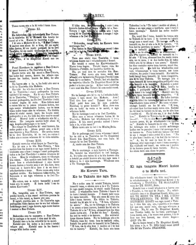 MATARIKI. Kua tae atu hoki kia Te Riihi, i Tura- nganui te tino tono a te Hupirimi Kooti kia utua taua moni—me te kupu hoki a Te Hupirimi Kooti kia Te Ruhi, kaore e tika taua mau i te £819 19s 3d moni a Tareha. I ki ano hoki Te Hupirimi Kooti, Kaore i marama nga mahi i kiia e To Ruhi i mahia e ia ma Tareha. Kaore i marama te ra, te marama, te tau ranei, i mahia ai e i Te Riihi ana mahi mo Tareha. Kaore hoki i marama i mahia ranei taua mahi mo Tareka, mo etahi Maori ke atu ranei. Kaore hoki i marama mo te whenua, mo te ahu ranei, aua mahi a te Riihi. I whakakorea rawatia e Tareha aua mahi a Te Riihi ki runga ki a ia. 1 ki hoki taua kaumatua, kaore rawa a ia i whakatu i a te Ruhi hei mahi i nga mahi mo te taha ki te waru rau pauna. Na, tae noa ki te kai whakamaori a te Riihi o mua, ara, kia Te Waiti kaumatua, he kaiwhakawa hoki ia. Ko taua kupu tenei ki te Hupirimi Kooti, i tino whakakorea rawatia a Te Riihi e Tareha i runga i aua mahi. No muri mai i taua whakakoretanga tohe tonu te Ruhi ki te tono utu kia Tareha, A, kitea ana e Te Hupirimi Kooti, ehe ana te mahi a te Riihi. KATI, KO TE TINO WHAKATAU- NGA TENEI A TE HUPIRIMI KOOTI —ME UTU E TE RUHI. KIA TARE- HA INAIANEI - Na Tareha taua moni ua Te Riihi i pu- puri pokanoa. Na, e haere atu ana tenei panui, i te Tonga nei. E ahu atu ana ki o matou whanaunga ki o matou hoa i te Tai Ra- whiti, a rauna noa te Motu nei. E hoa ma! Kia noho tatou i runga i te matauranga, i te mohiotanga,—Mehemea ka tono tatou ki te tahi roia kia mahia e ia a tatou mahi, tonoa ki a ia, kia mara ma tana utu mo tana mahi i to tuatahi, a, ka tiro atu tatou e pai ana, a, tuhia rawa- tia ki te pukapuka tana whakaaetanga-a- katahi tatou ka whakaae. Tenei, ko te kahu noa i roto i te pouritanga. AUE! E hika ma E! Ka mate tatou! Ka mate tatou! Ko totatou tino takanga tena ki te ahi-whanariki, mamae mutunga kore, ake tonu atu. Kia WIREMU RU RIIHI, no Nepia aia i mua, engari, no Kihi- pane, Papete Pei, inaianei, i roto i te koroni o Nui Tireni, roia, kia WIREMU PERE, kia RIPE- RATA KAHUTU, no taua Papeti Pei, ano raua, he tangata Maori. KIA MOHIO KOUTOU, kia kotahi marama i muri iho i te panuitanga i tenei panui i roto i nga nupepa erua i taia i Kihipane me nga niupepa erua i taia i Poneke, ka hokona e au ka tukuna atu ranei e au kia hokona kia maketetia, nga whenua i whakaatutia i roto i tehaki puka- puka mokete i tuhia i te 26 o nga ra o Pepuere, 1879, (i rehitatia i te tari Rehita Pukapuka i Nepia i raro i te nama 13175). Ko taua pukapuka i waenganui ia koutou o tetahi taha, me au ko PEREHIWA PAAKA, i whakahuatia i raro iho nei o tetahi taha. Na, ka hokona, ka maketetia aua whenua, kite kore koutou e utu mai ki au i nga tino moni pukai i whakatuturitia mai ki au i runga i taua pukapuka mokete, te toenga ranei, me nga inatereti—nga moni whakapiki katoa, e tika ana kia uta ki au i runga i taua puka- puka mokete. Na, tenei ano hoki tetahi, kia mohio koutou, ko te take i tukuna atu e au tenei panui kia panuitia, koia tenei,—ara—kaore ano koutou i utu mai ki au i nga tino moni pukai me nga moni inatereti—nga moni whakapiki i whakaaetia i runga i nga ritenga i whakaatutia i roto i taua pukapuka mokete. I tuhia i tenei te 12 o nga ra o Maehe 1881. NA PEREHIWA PAAKA. Hiu J. WIINI. Roia, Kihipane. KI O MAUA HOA MAORI O TE TAI RAWHITI. Ehoa ma,—Tena koutou kua tae ki te takiwa pupuhi manu. Na, Kanui te manu o tenei tau. Ka nui te momona. Kati Kia kaha koutou ki te pupuhi manu i tenei tau. Ki te hiahia koutou ki te Paura, ki te Hota, ki te Tingara, me haere mai koutou ki te whare maitai o Panera rana ko Paerana hoko ai. Kei a maua hoki nga pu tino pai, hei pupuhi manu, he pu tupara, he pu haki mana, me etahi tu pu atu. Mehemea e hia- hia ana koutou kia whakapaitia a koutou pu me haere mai ano koutou ki a Panera raua ko Paerana. He maha hoki nga pu kei a maua. He ngawari te utu. Kia mohio koutou me haere mai koutou kia maua, kia Panera raua ko Paerana i te whare maita i Kihipane. Ko te tino whare tenei o te Tai Rawhiti hei hoko i nga Paura, Hota, Tingara, Pu, me aua tu mea katoa. Kei a maua hoki nga Kakahu Wahine, Kakahu tane, Kakahu tamariki nga hu tane nga hu wahine me nga nohoanga tane nohoanga wa- hine, me te Te Huka, Paraoa. Kei a maua hoki nga parau, nga rakuraku me aua tu mea katoa hei mahi paamu. ENGAWARI ANA TE UTU, Kei wareware koutou, na o koutou hoa, na PANERA RAUA KO PAERANA, I TE WHARE MAITAI, KIHIPANE. TE HOKO O WHATAUPOKO Ka tino hokona rawatia 12,400 nga eka o Whataupoko Poraka, nui atu, iti iho ranei. Ko taua whenua e takoto ana i te takiwa o Papati Pei, e tutata ana ki te taone o Kihi- pane. Ko tenei hoko i runga i te tono o Paaka, te kaitango mokete. Ka haere hoki tenei hoko i ronga i te whakahaere o te Kai Rehi- ta o te Hupirimi Kooti i Nepia i raro i nga tikanga o te Tare whakatikatika i te ture hoko whenua, 1860, i raro hoki i nga tikanga o te Ture, 1870, e whakamana ana i nga kai- tango mokete ki te hoko i nga whenua i moketetia kia ratou. Na, kua tae atu te tono ki a PITI raua ko PENETI, na Paora A. F. Paata, kai Rehita o te Hupirimi Kooti o Nepia i tuku atu taua tono kia raua I RUNGA I TE WHAKAAE- TANGA o ke kaitango o te mokete, e kia ho- kona, kia maketetia nuitia i ta raua whare makete i te taone o Kihipane a TE PARAIRE, te 29 o nga ra o APEREIRA, 1881, i te rua haora me te hawhe i muri iho i te tina. WAHI TUATAHI e hokona ana. Katoa o taua piihi whenua tona nuinga 12, 400 nga eka, nui atu iti iho ranei, tetahi wahi o WHATAUPOKO, i te takiwa o Turanga, Papati Pei. Koia te whenua i whakahuatia i roto i tetahi puka- puka, a, i raro i te mana o taua pukapuka, i runga hoki i ana tikanga e hokona ana e te kai tango i te Mokete e PAAKA, taua whenua KO TE WAHI TUARUA. Te whaitaketanga, me te paanga, tera e riro mai ki te kai tango i te mokete i runga i tetahi kotahi mano eka kaore i uru ki roto ki te 12, 400, i muri mai i te utunga atu i nga moni 6500 me nga inatereti i whakatu turutia ki tetahi tangata ke (kote wahi tenei e mohiotia ana kei a M