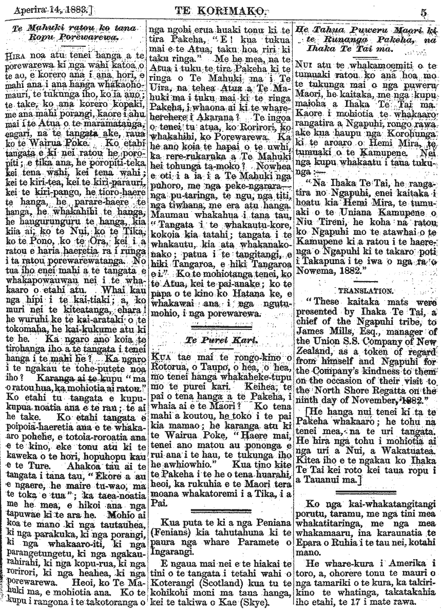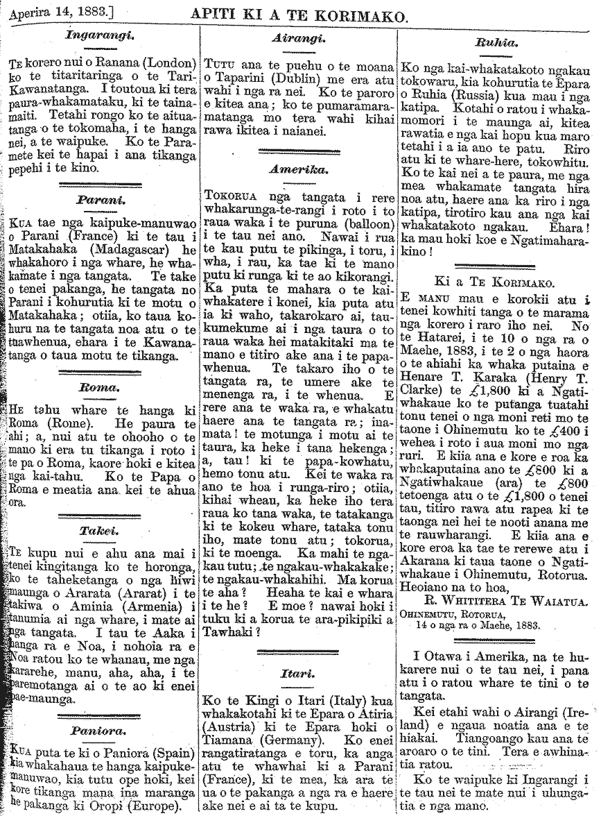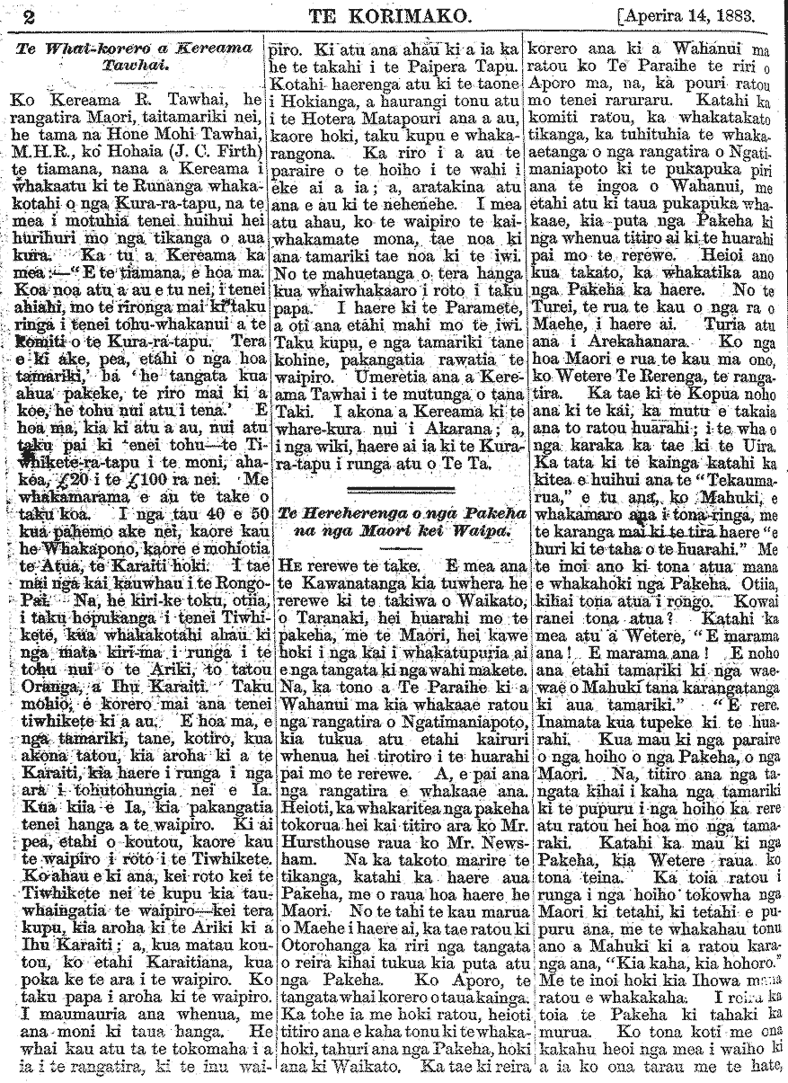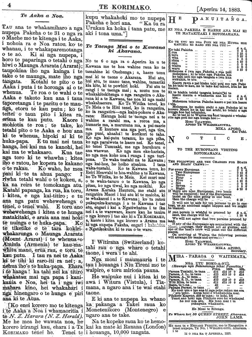 Te Korimako 1882-1890: Volume 0, Number 14. 14 April 1883 |