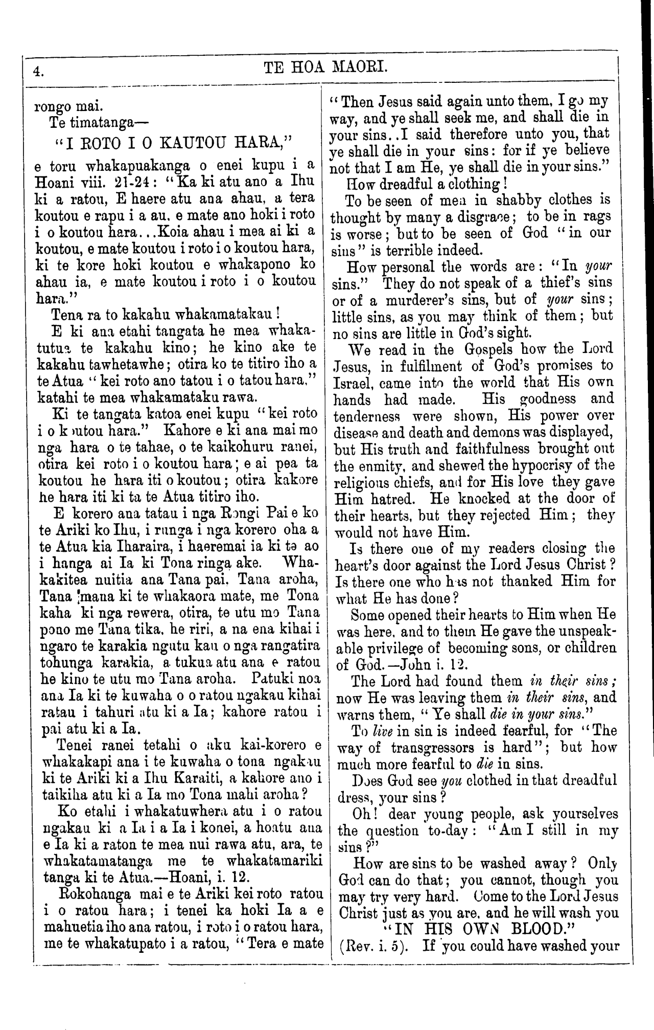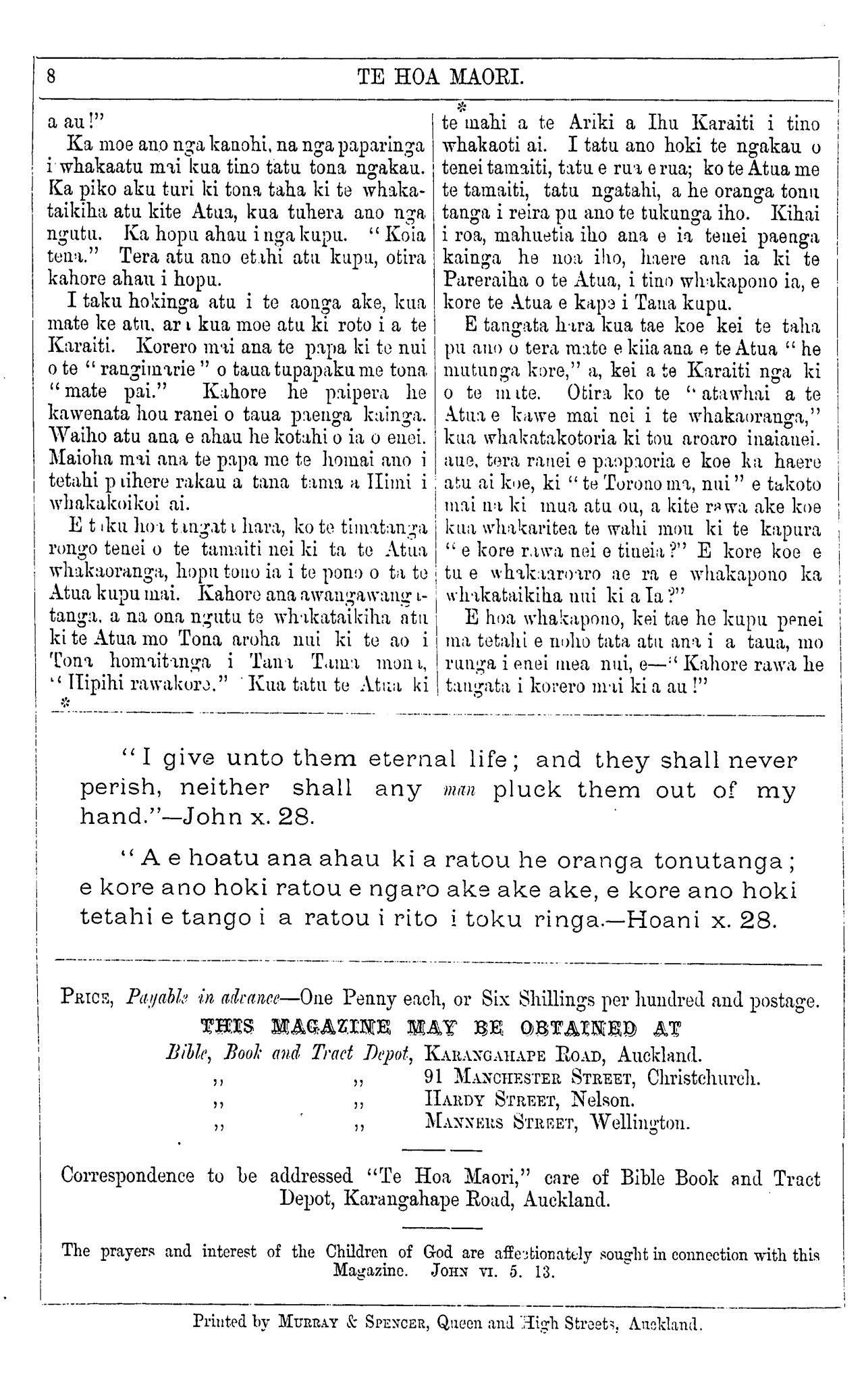 Correspondence to be addressed "Te Hoa Maori," care of Bible Book and Tract