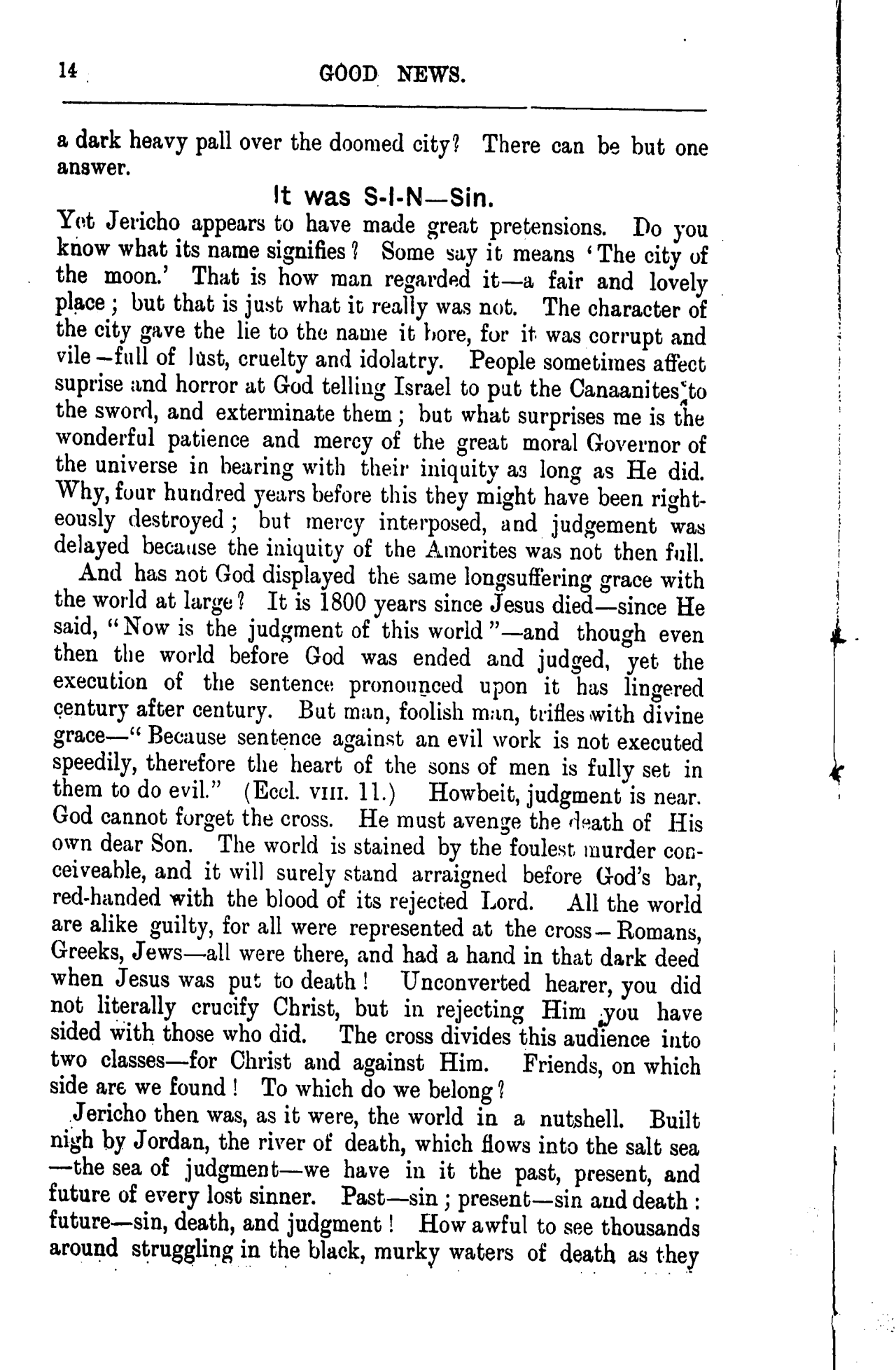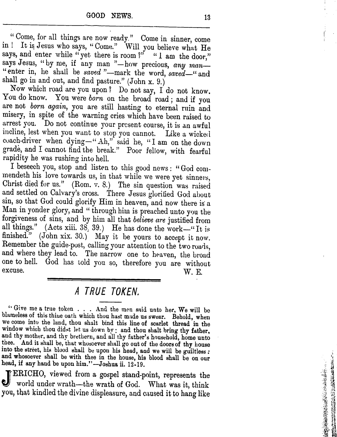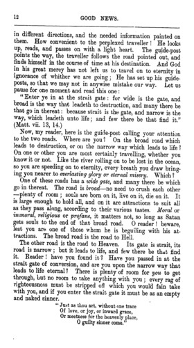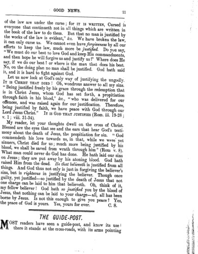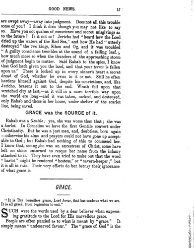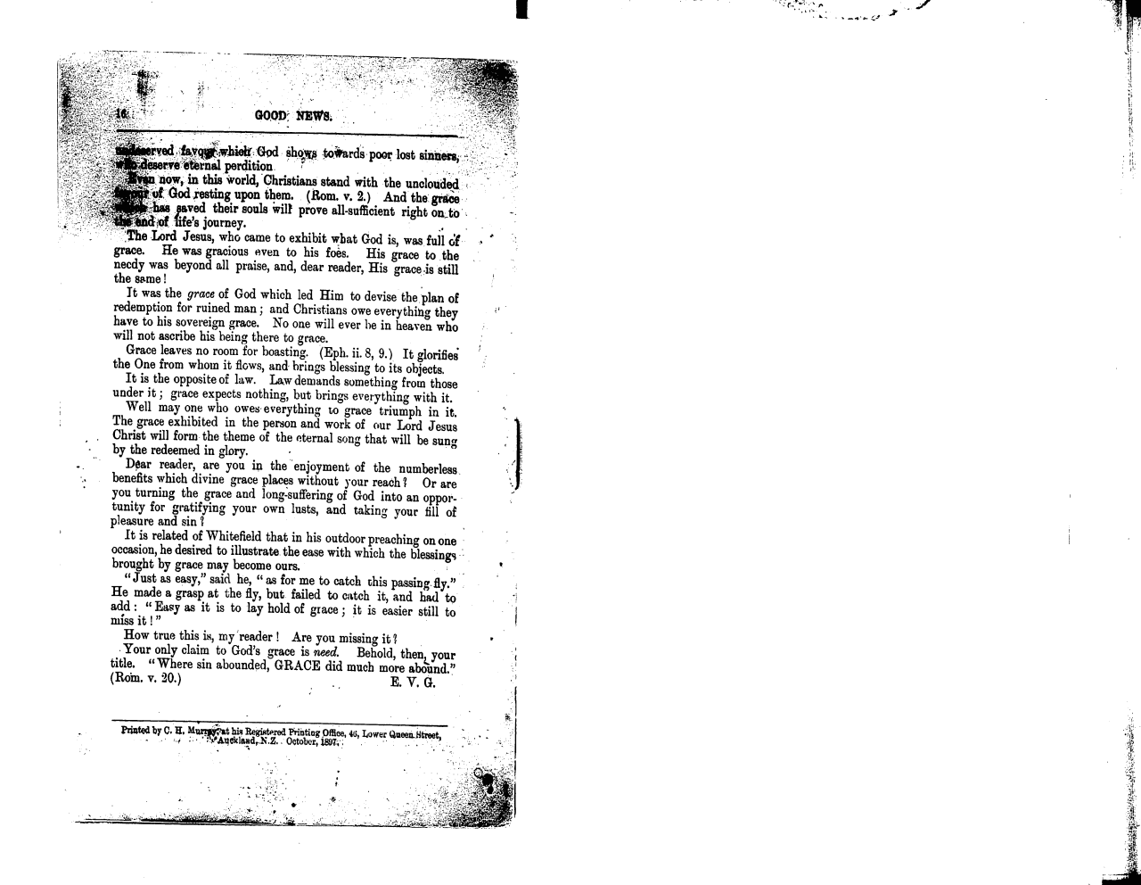 GOOD NEWS It was the grace of God which led Him to devise the plan of redemption for ruined man; and Christians owe everything they have to his sovereign grace. No one will ever be in heaven who will not ascribe his being there to grace. Grace leaves no room for boasting. (Eph. ii. 8, 9.) It glorifies the One from whom it flows, and brings blessing to its objects. It is the opposite of law. Law demands something from those under it; grace expects nothing, but brings everything with it. Well may one who owes everything to grace triumph in it. The grace exhibited in the person and work of our Lord Jesus Christ will form the theme of the eternal song that will be sung by the redeemed in glory. Dear reader, are you in the enjoyment of the numberless benefits which divine grace places without your reach ? Or are you turning the grace and long-suffering of God into an opportunity for gratifying your own lusts, and taking your fill of pleasure and sin 1 It is related of Whitefield that in his outdoor preaching on one occasion, he desired to illustrate the ease with which the blessings brought by grace may become ours. "Just as easy," said he, " as for me to catch this passing fly." He made a grasp at the fly, but failed to catch it, and had to add : " Easy as it is to lay hold of grace ; it is easier still to miss it!" How true this is, my reader ! Are you missing it ? Your only claim to God's grace is need. Behold, then, your title. " Where sin abounded, GRACE did much more abound." (Rom. v. 20.). E. Y, G.