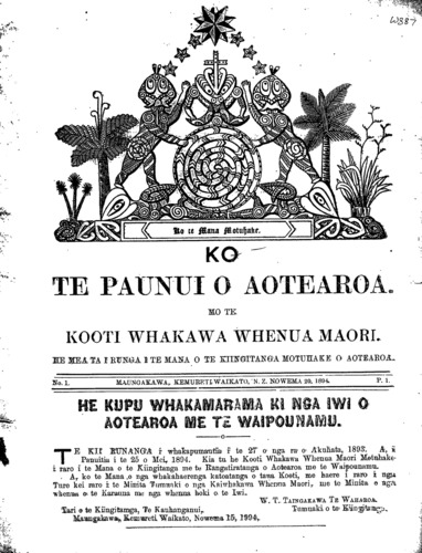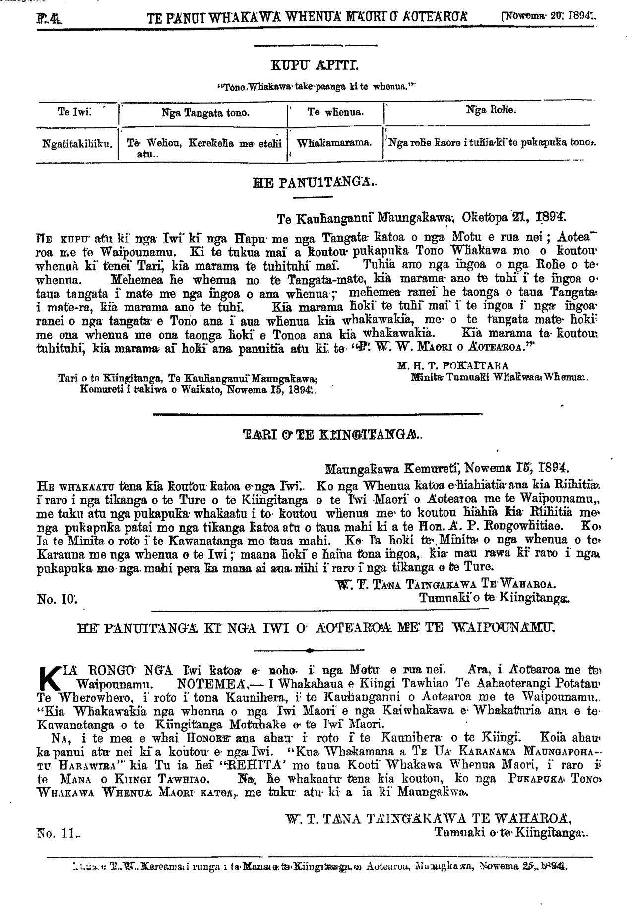 KO TE MANA MOTUHAKE KO TE PANUI O AOTEAROA MO TE KOOTI WHAKAWA WHENUA MAORI. HE MEA TA I RUNGA I TE MANA O TE KIINGITANGA MOTUHAKE O AOTEAROA. NO. 1 MAUNGAKAWA, KEMURETI WAIKATO, N.Z. NOWEMA 20, 1894 P. 1 HE KUPU WHAKAMARAMA KI NGA IWI O AOTEAROA ME TE WAIPOUNAMU. Te Kii Runanga i whakapumautia i te 27 o nga ra o Akuhata, 1893. A, i Panuitia i te 25 o Mei, 1894. Kia tu he Kooti Whenua Maori Motuhake i raro i te Mana o te Kiingitanga me te Rangatiratanga o Aotearoa me te Waipounamu. A, ko te Mana o nga whakahaeretanga katoatanga o taua Kooti, me haere i raro i nga Ture kei raro i te Minita Tumuaki o nga Kaiwhakawa Whenua Maori, me te Minita o nga whenua o te Karauna me nga whenua hoki o te Iwi. W. T. TAINGAKAWA TE WAHAROA Tumuaki o te Kiingitanga Tari o te Kiingitanga, Te Kauhanganui, Mangakawa, Kemureti Waikato, Nowema 15, 1894.