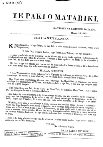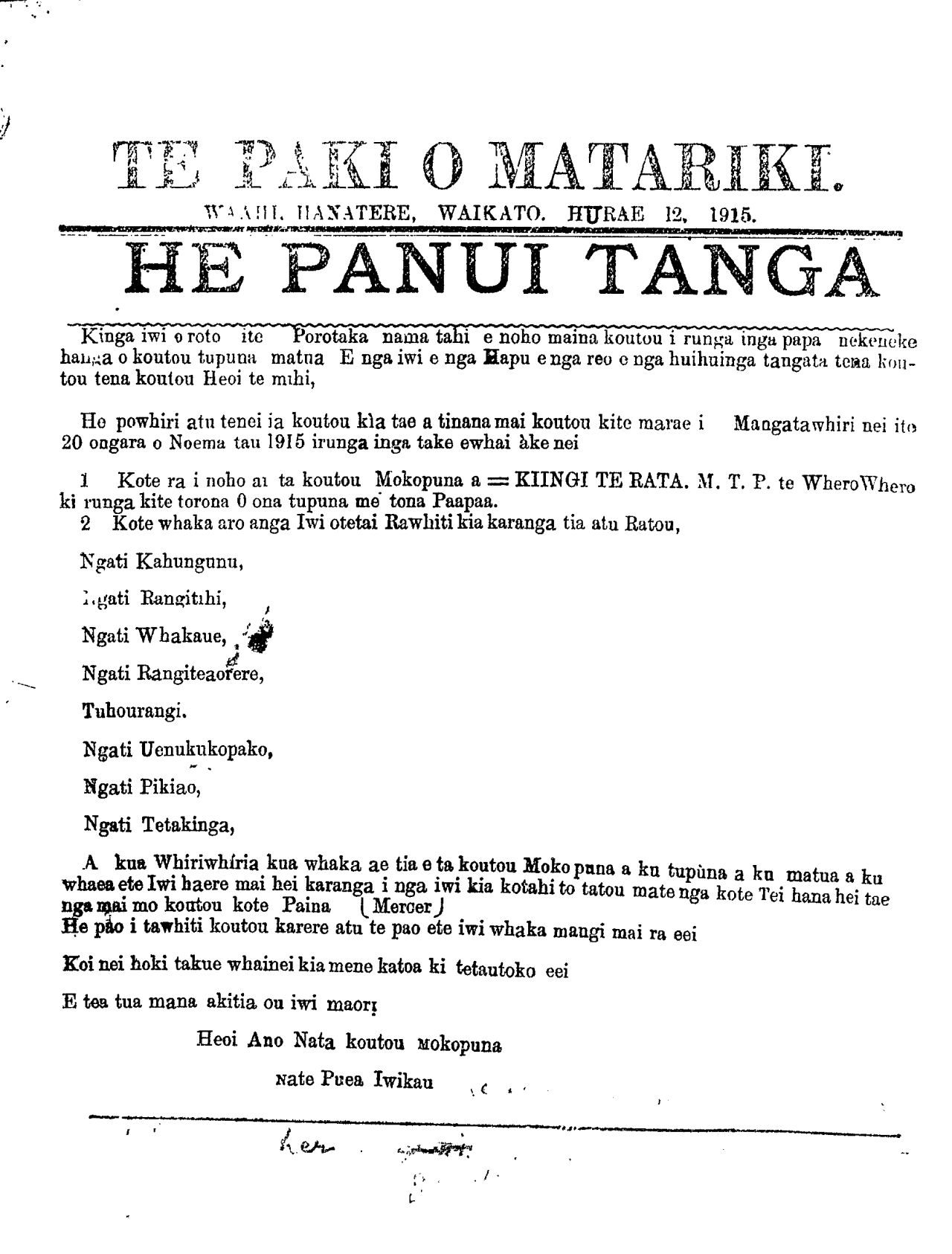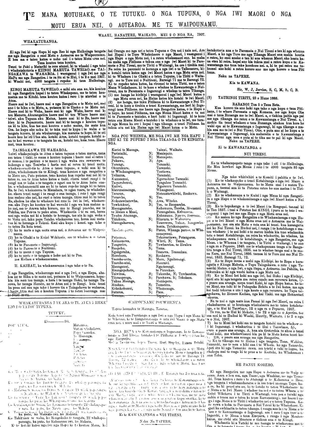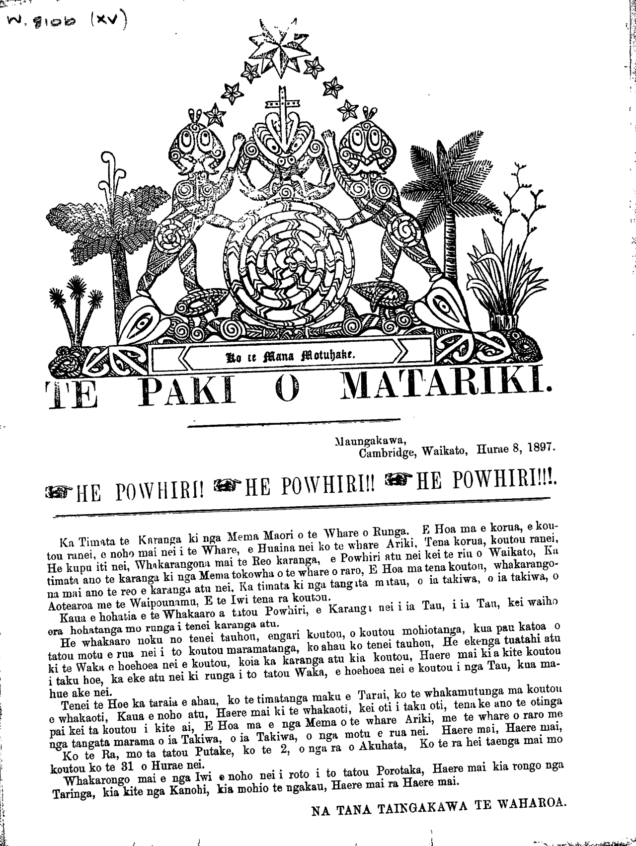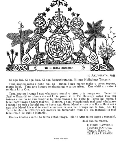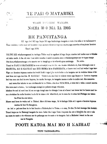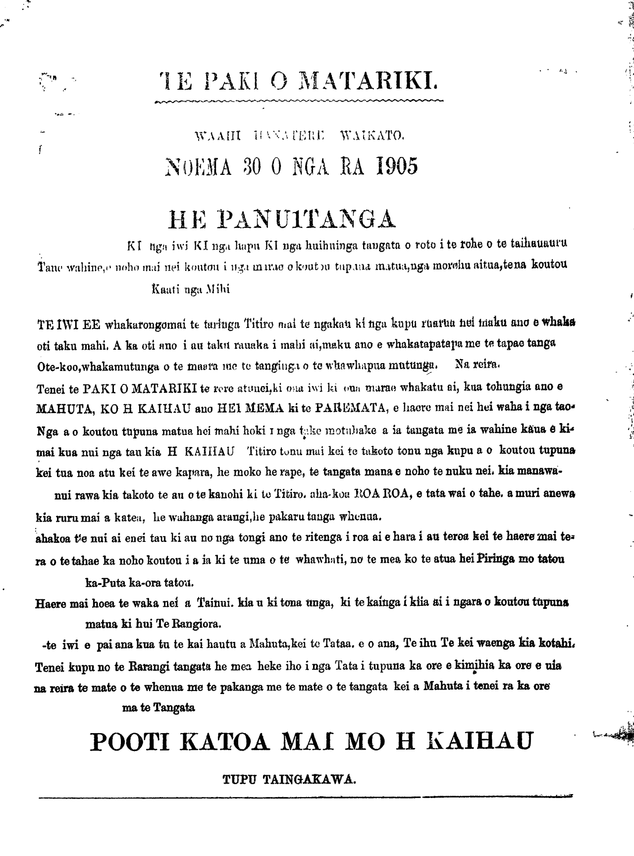 He Panuitanga tenei ki nga Iwi, ki nga Hapu ki nga Huihuinga, tangata