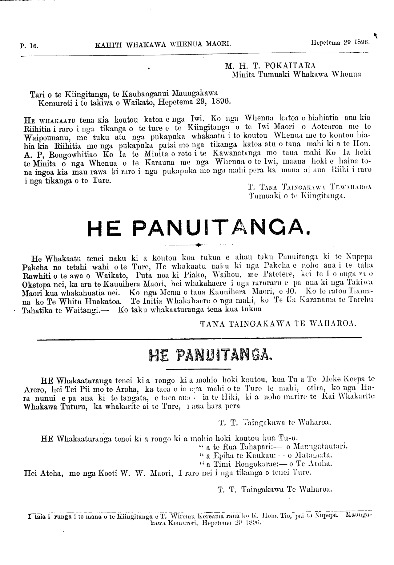 He Whakaatu tenei naku ki a koutou kua tukua e ahau taku Panuitanga ki te Nupepa