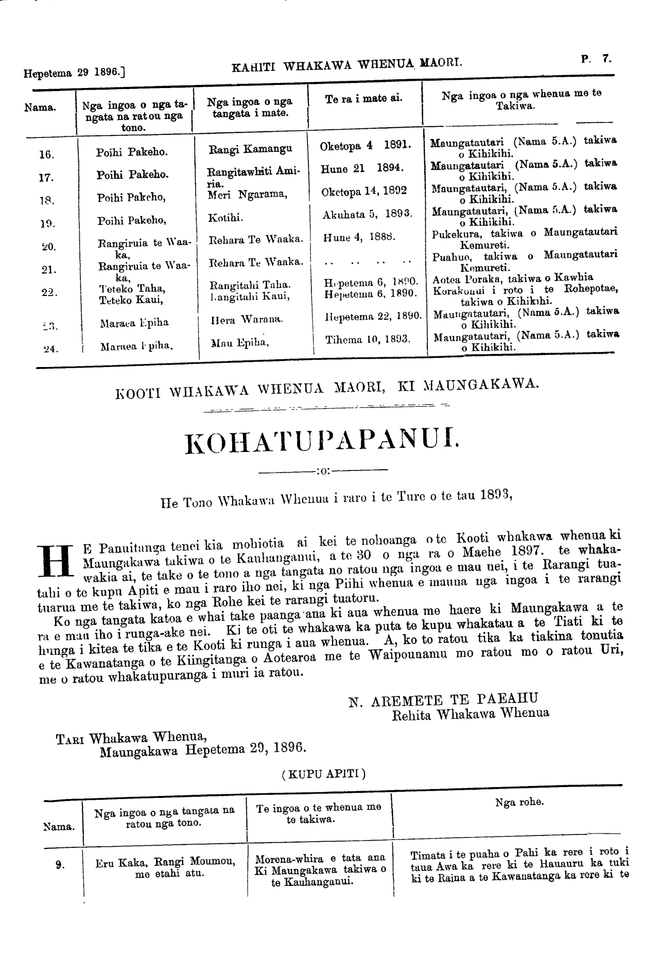 Te Kauhanganui Maungakawa, Hepetema 29, 1896.