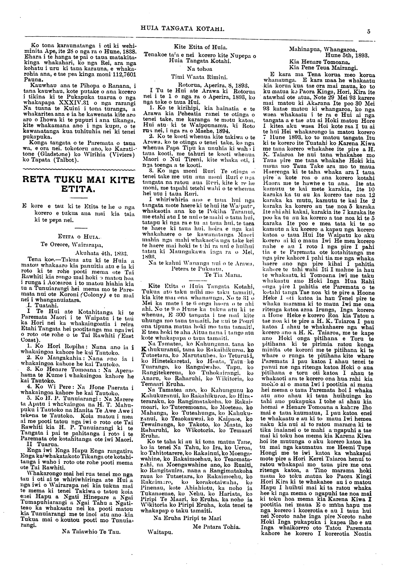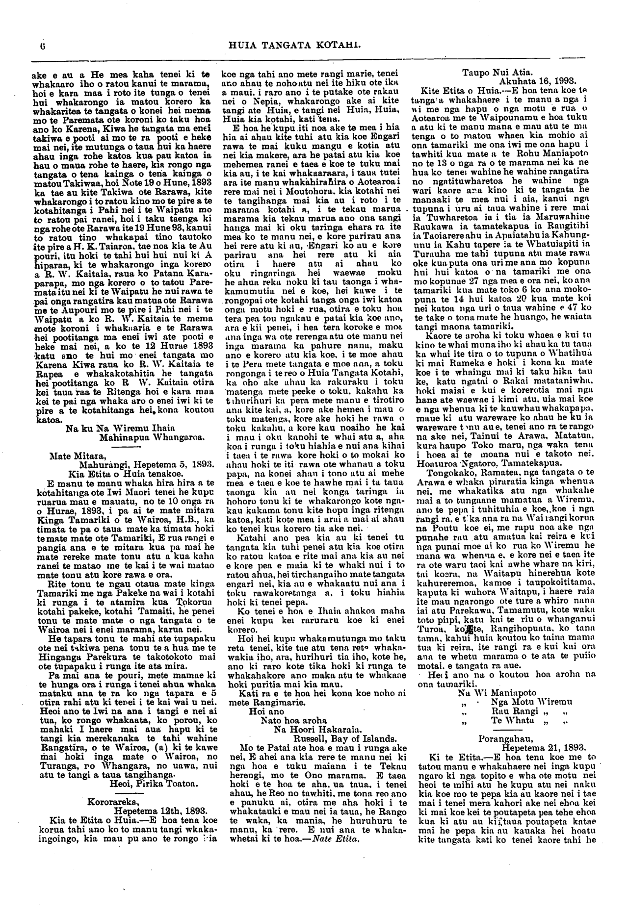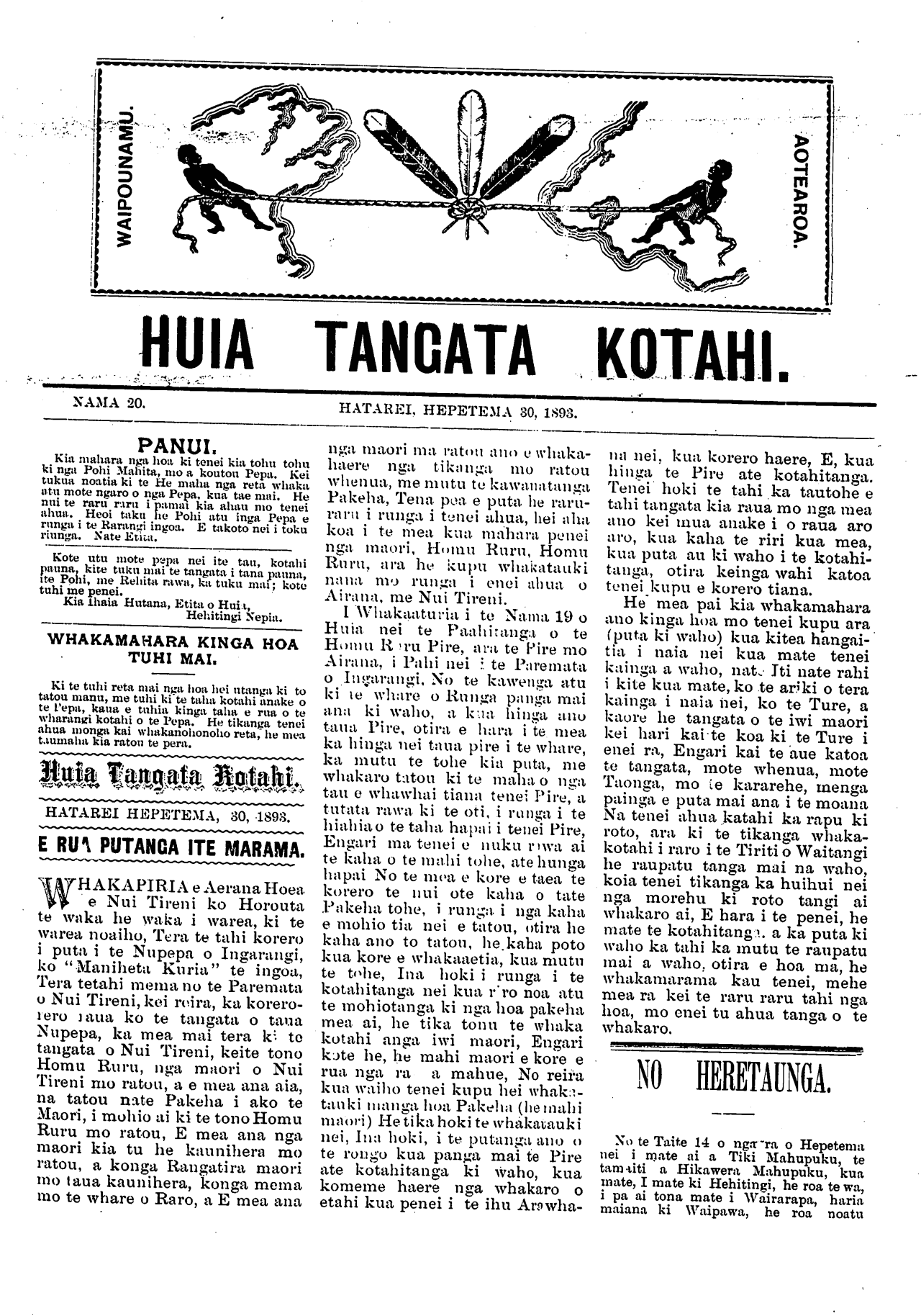 Huia Tangata Kotahi 1893-1895: Volume 1, Number 20. 23 September 1893 |