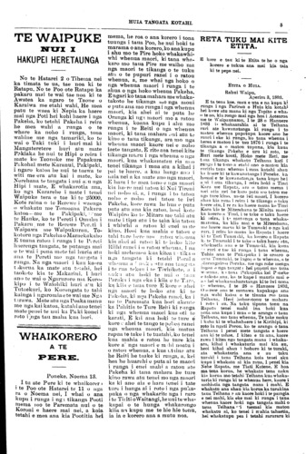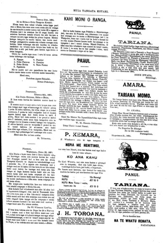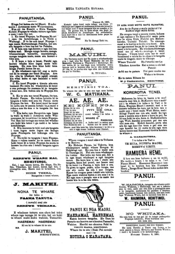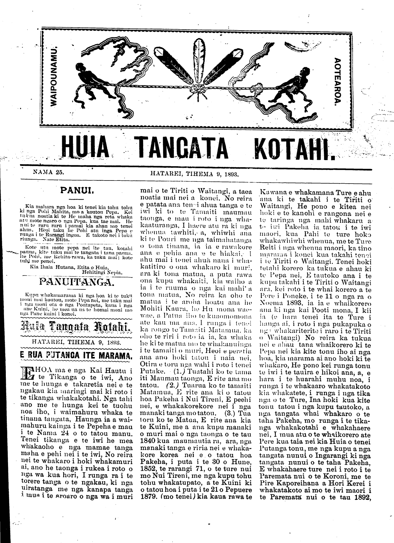 HUIA TANGATA KOTAHI, NAMA 25. HATAREI, TIHEMA 9. 1893. PANUI. Kia mahara nga hoa ki tenei kia tohu tonu ki nga Pohi Mahita, mo a koutou Pepa. Kei tukua noatia ki te He maha nga reta whaka atu mote ngaro o nga Pepa kua tae mai. He nui te raru raru i pamai kia ahau mo tenei ahua. Heoi taku he Pohi atu i nga Pepa i runga i te Rarangi ingoa. E takoto nei i toku ringa. Na te Etita