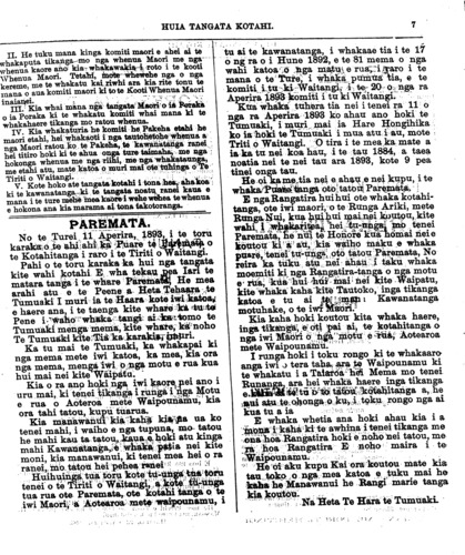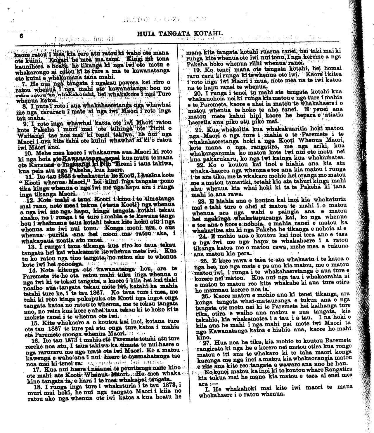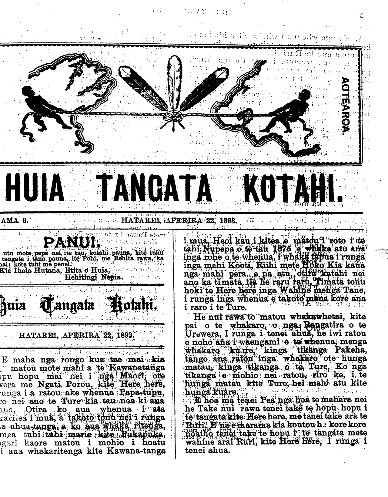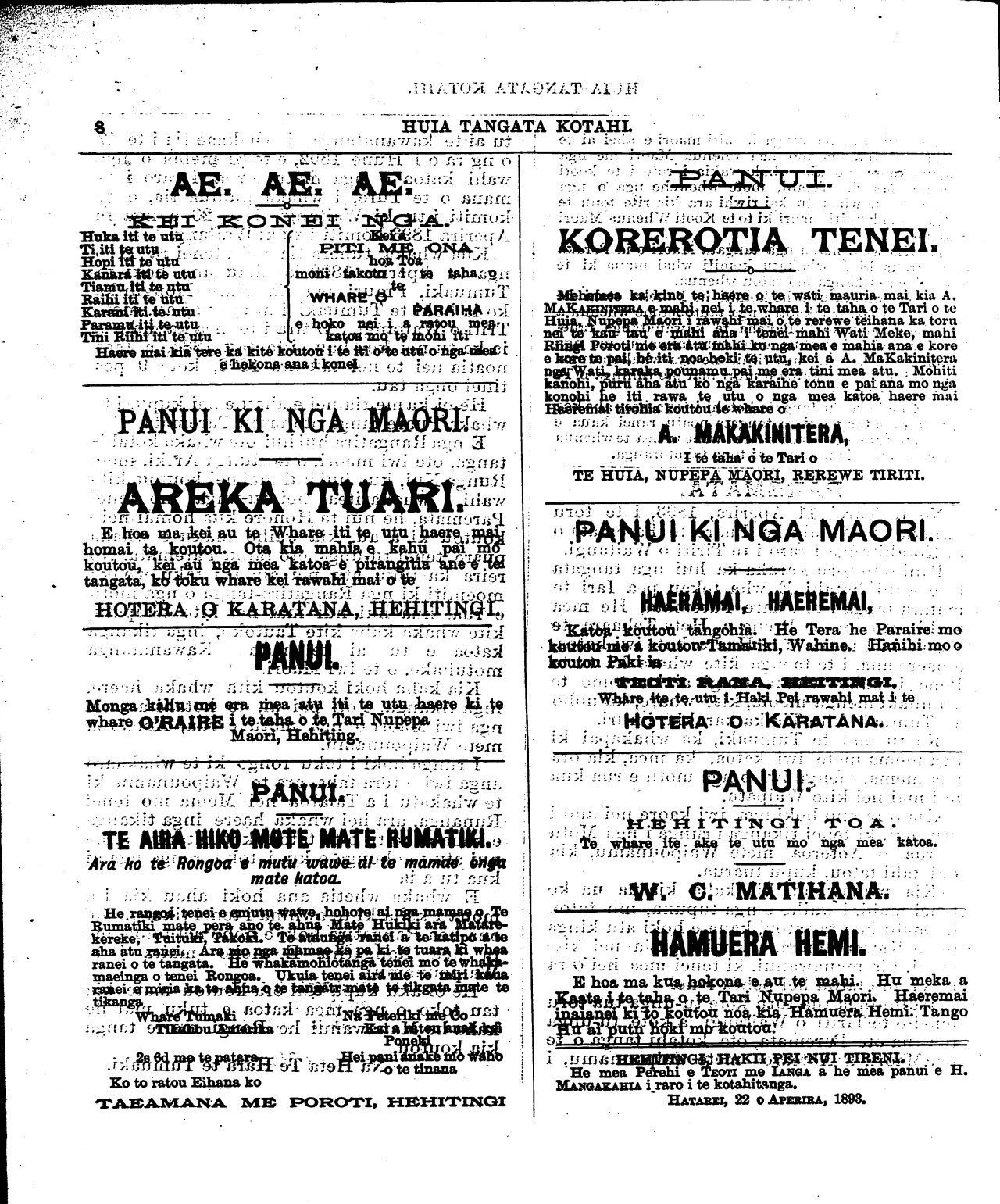 HUIA TANGATA KOTAHI NAMA 6. HATAREI APERIRA 22, 1893 PANUI. Kia mahara nga hoa ki tenei kia tohu tonu ki nga Pohi Mahita, mo a koutou Pepa. Kei tukua noatia ki te He maha nga reta whaka atu mote ngaro o nga Pepa kua tae mai. He nui te raru raru i pamai kia ahau mo tenei ahua. Heoi taku he Pohi atu i nga Pepa i runga i te Rarangi ingoa. E takoto nei i toku ringa. Na te Etita