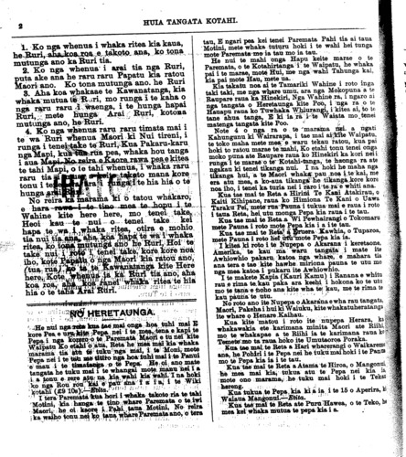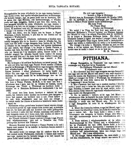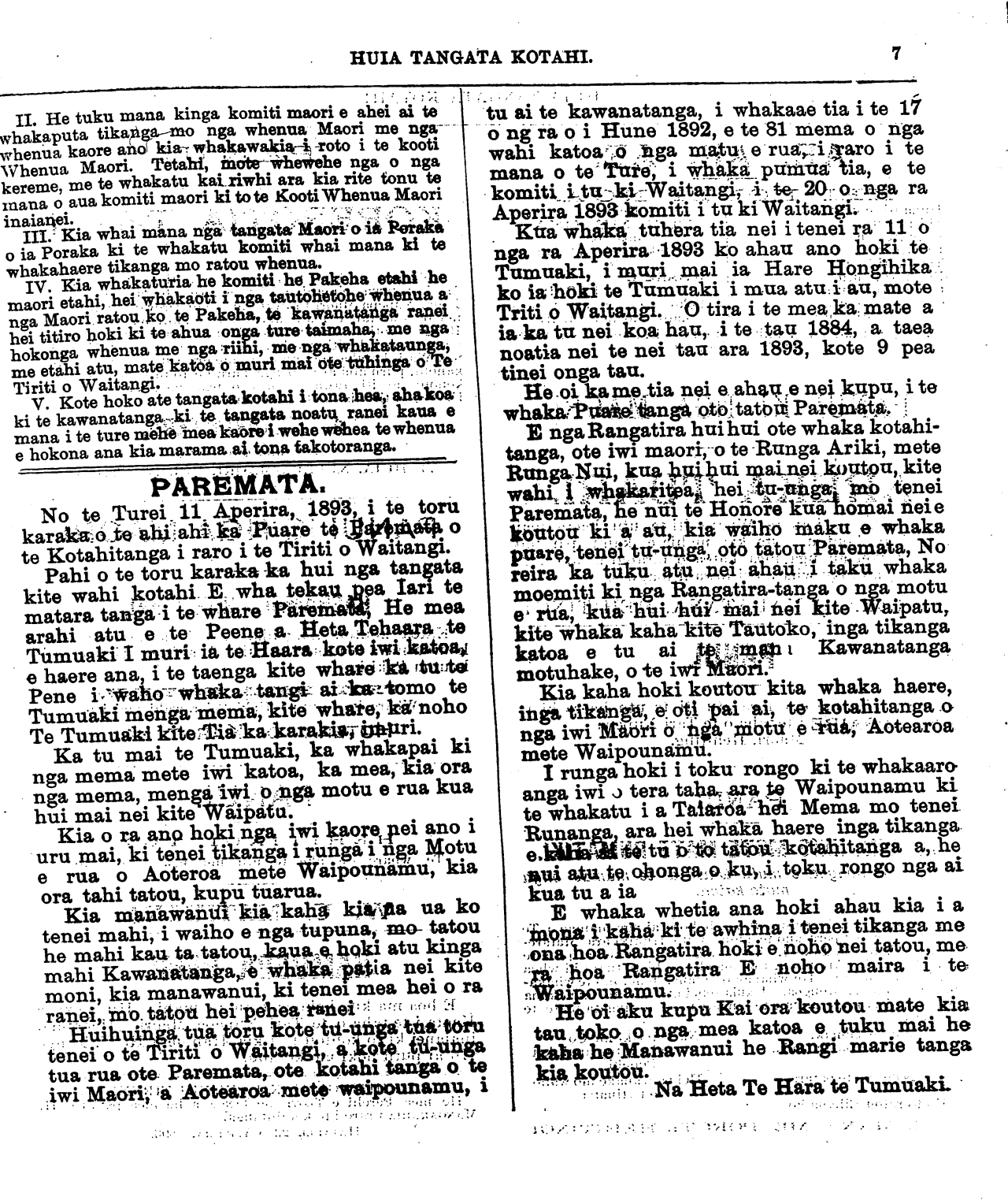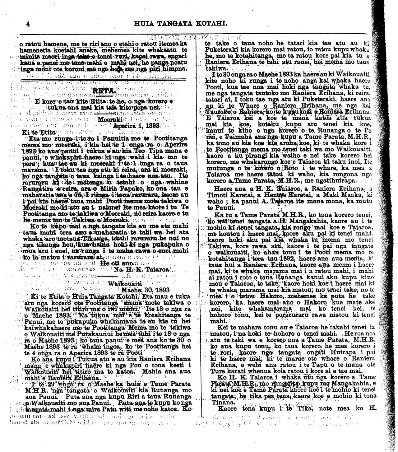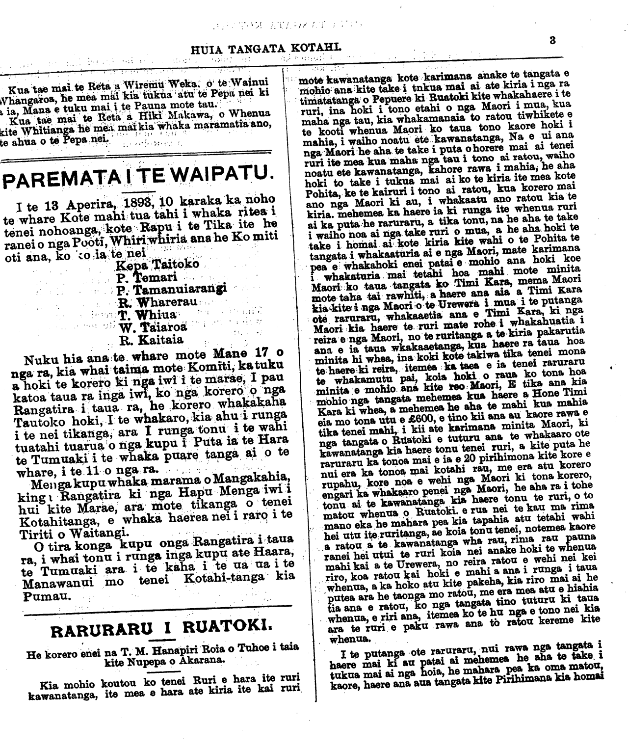 HUIA TANGATA KOTAHI NAMA 6. HATAREI APERIRA 22, 1893 PANUI. Kia mahara nga hoa ki tenei kia tohu tonu ki nga Pohi Mahita, mo a koutou Pepa. Kei tukua noatia ki te He maha nga reta whaka atu mote ngaro o nga Pepa kua tae mai. He nui te raru raru i pamai kia ahau mo tenei ahua. Heoi taku he Pohi atu i nga Pepa i runga i te Rarangi ingoa. E takoto nei i toku ringa. Na te Etita