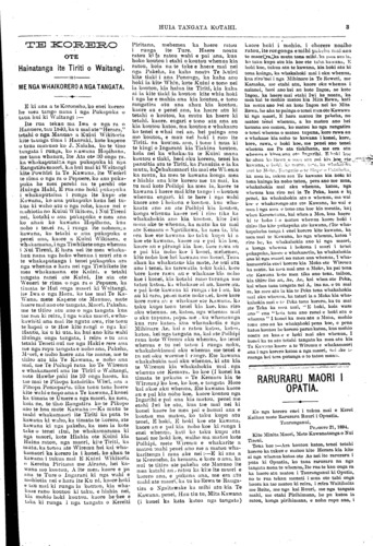 HUIA TANGATA KOTAHI. HE KAIPUKE I NGARO. Kua tae mai he rongo he mea tuhi na tetahi onga morehu i ora o te kaipuke ko Metoha te ingoa, he whakaata mai i to ratou rerenga mai i Paremata, kapa te mate korera ki etahi o ratou ko taua kaipuke he utanga waro i ranga i aia i te toru onga ra o tatou kite moana ka pa te mate, ki nga tangata e wha, e rua nga ra i muri iho Ka hemo, me te haere tonu ote kaipuke, kaore i roa kaha kite kapene taua mate ano e I wa ra ia e takoto ana, me te tiaki tonu o nga tang ata kihai rawa i taea, no te po ote Iwa o nga ra ka hemo ka tapuketia ata kite moana, ka kaha haere tona taua mate ka pa ki te tangata kaore e roa kua hemo, ka toe e wha tonu tangata hei taki me te whakahaere ite Kaipuke, ka timata hoki te pupuhi ote, hau, ite kaha ote hau pakaru katoa nga heera me te mahitonu o nga mo rehu e wha nei kite whakahaere i to ratou Kaipuke mete tiaki ano i o ratou hoa e mate ana, me te takoto noaiho ote kaipuke ite moana, KUA kore he Heera kore tangata ono hei mahi waiho noatu i kona haere ai mana e ora atu, e mate atu ranei e taea hoki te aha. na te mahara o horere noa i tae mai ki tetahi ora tou ka whaka maua te Haki whakaatu, ka nui to ratou mate, kaore roa kua kite ata ratou i te whenua, kai eke ratou ki runga i nga poti ka hoe atu, ki uta kore rawa ratou i whakaae tia kia u kei tae atu te mate korera ki reira ka matemate hoki ratou ka noho noaiho nga tangata nei ite one no te tahi ata, katahi ano ka mauria ki roto i te whare wehe ano mote hunga mate pera, kaore i roa kua ora ratou, ko tenei korero he mea tuhi na tetahi o ratou ite takiwa e takoto mate ana ratou, kanui te whakawhetai onga tangata kia ratou, mete manaki, ite kaha o ratou kite wha kahaere i to ratou Kaipuke:—Heoi teneikorero taihoa kei enei patanga ano ka tuku atu ma nga mea e hiahia ana ki enei tu korero.